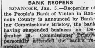 PEOPLES BANK OF VINTON CLOSES President Says Bank Solvent and Hopes to Reopen in Few Days The Peoples Bank of Vinton closed its doors at noon and posted notice stating that the board of directors had ordered such action for the protection of the bank's depositors Later C. L. Atkinson president, issued statement saying the bank had closed its doors temporarily because of steady withdrawals during the past several weeks and expressing hope that it would reopen few days The statement of the president follows "The Peoples Bank of Vinton 1.85 closed temporarily on account of continuous withdrawals of the past several weeks, caused by false rumors about the condition the bank and directors are confident the bank entirely and hope to be able to reopen in & few days He declined to enlarge upon this brief statement. It was said late yesterday afternoon that bank examiner was the scene but had no statement to make this time The capitalized at $100,000 statement published on last October showing the of the bank as of September 24, the surplus is given as $60,000 Total re. sources were listed as $999,096 48. Savings deposits were given as $470,594.34 and checking deposits as $129,603.1 reached at meeting of the directors yesterday morning. was in an effort to check the gradual run on the bank's funds which has been in progress Only recently the bank, it is understood, authorized payment of per cent semiannual dividend, plus two per cent extra dividend. Officers L. Atkinson, president: Harris cashier: Ferrell, assistant cashier: Howell, W. H. Vinyard, and D. L. Meador. Christmas Entertainment Vinton, Dec. There will be Christmas entertainment Midway Chapel on Wednesday evening at 7:30 Moving to West Virginia. Mrs. Eudora Pritchard and family Monday for Marlington, W. Va. where they will make their home. Condition Slightly Better. The condition of H. James. who has pneumonia at the Roanoke hospital, was thought to be slightly better this morning Death of Uncle. George who Villamont last night, an uncle of J. W. Hogan, of this place. Fires Alarm. The Vinton Fire Department was called noon Friday fire at the home Hillary Saunders on Bedford Road, caused by the bursting of the boller, igniting papers. No damage resulted from the fire. Spends Few Days Mrs. Ernest O'Bryan of Kirkwood accompanied by her daughter Mildred. spent the past week with her aunt. Mrs. D. P. O'Bryan, of Jackson Park. Home For Holidays. Darnell Vinyard is at home for the