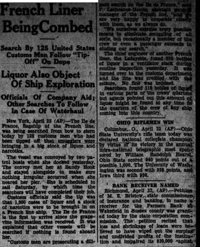 French Liner Being Combed Search By 125 United States Customs Men Follow Off" On Dope Liquor Also Object Of Ship Exploration Officials Of Company Aid; Other Searches To Follow In Case Of Waterhaul New York, April 22 (AP)-The Ile flagship of the French being to today 125 men been that bringing big stock of liquor narcotics. The vessel was convoyed by two trol when she The convoy met her at Sandy Hook and stayed alongside make nothing irregular occurred when neared her She Saturday, by which time officials said tip that cases and of in French line The France the first since the grapevine was received. was explained that other vessels will searched nothing is found aboard her. Customs men are prosecuting dill- are another yesterday various parts the crews' but any the ship coming country OHIO RIFLEMEN WIN Columbus, April 22 State University's rifle today was declared national collegiate victory in the annual sored by William Ohio 940 points possible The was points, and Iowa third BANK RECEIVER NAMED April and banking. to name receiver the Farmers Bank Wakefield in Sussex granted today by the state corporation mission. petition recited that loss and shrinkage of were lieved to wiped out the and undivided profits and its $20,000