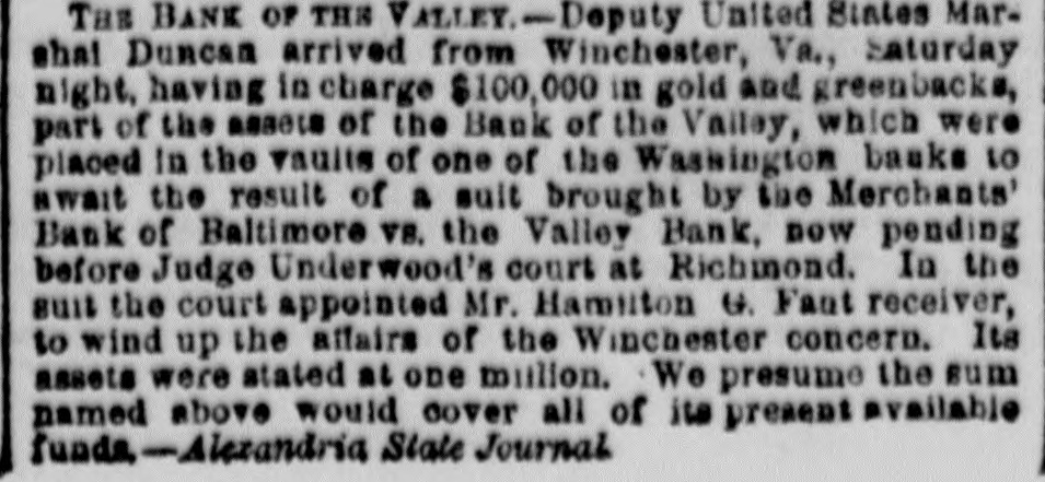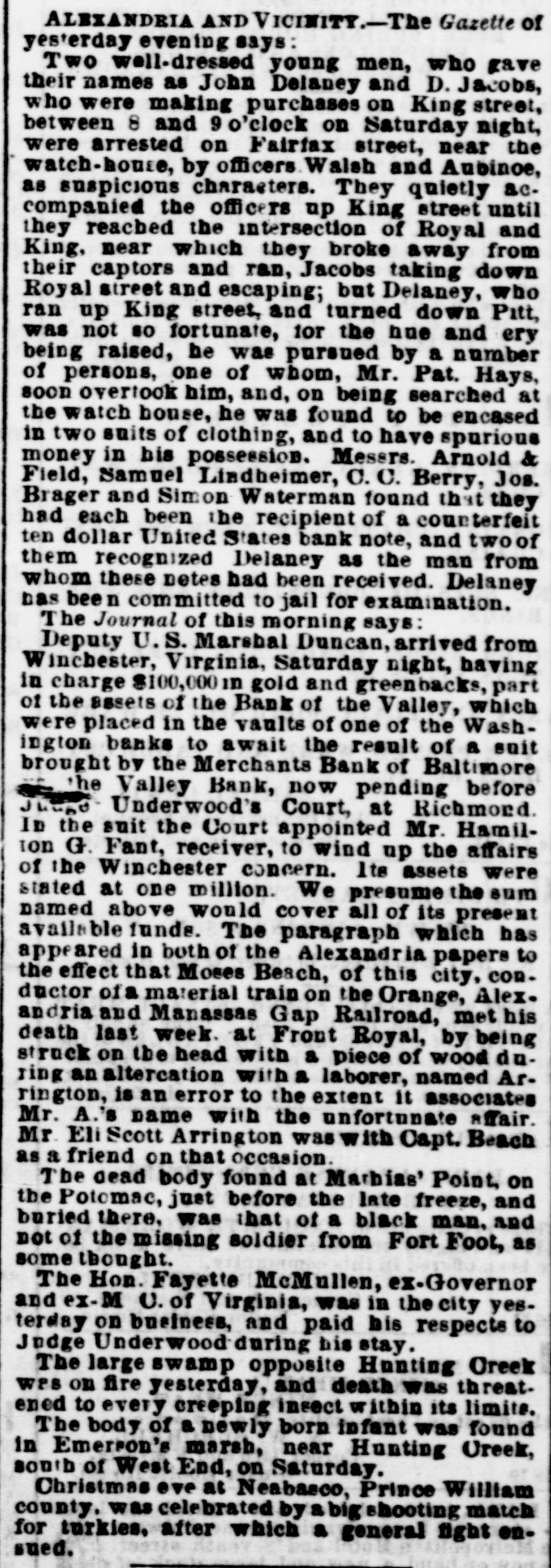 ALEXANDRIA AND VICINITY.-The Gazette of yes'erday evening says: Two well-dressed young men, who gave their names as John Delaney and D. Jacobs, who were making purchases on King street, between 8 and 9 o'clock on Saturday night, were arrested on Fairfax street, near the watch-house, by officers Walsh and Aubinoe, as suspicious characters. They quietly accompanied the officers up King street until they reached the intersection of Royal and King, near which they broke away from their captors and ran, Jacobs taking down Royal street and escaping; but Delaney, who ran up King street, and turned down Pitt, was not 80 fortunate, for the hue and ery being raised, be was pursued by a number of persons, one of whom, Mr. Pat. Hays, soon overtook him, and, on being searched at the watch house, he was found to be encased in two suits of clothing, and to have spurious money in his possession. Messrs. Arnold & Field, Samuel Lindheimer, C. C. Berry, Jos. Brager and Simon Waterman found that they had each been the recipient of a counterfeit ten dollar United States bank note, and two of them recognized Delaney as the man from whom these notes had been received. Delaney has bee n committed to jail for examination. The Journal of this morning says: Deputy U.S. Marsbal Duncan, arrived from Winchester, Virginia, Saturday night, having in charge $100,000 11 gold and greenbacks, part of the assets of the Bank of the Valley, which were placed in the vaults of one of the Washington banks to await the result of a suit brought by the Merchants Bank of Baltimore the Valley Bank, now pending before Jhugg Underwood's Court, at Richmond. In the suit the Court appointed Mr. Hamilton G. Fant, receiver, to wind up the affairs of the Winchester concern. Its assets were stated at one million. We presume the sum named above would cover all of its present available funds. The paragraph which has appeared in both of the Alexandria papers to the effect that Moses Beach, of this city, conductor ofa material train on the Orange, Alex. andria and Manassas Gap Railroad, met his death last week. at Front Royal, by being struck on the head with a piece of wood during an altercation with a laborer, named Arrington, is an error to the extent it associates Mr. A.'s name with the unfortunate affair. Mr. Eli Scott Arrington was with Capt. Beach as a friend on that occasion. The dead body found at Marbias' Point, on the Potomac, just before the Inte freeze, and buried there, was that of a black man, and not of the missing soldier from Fort Foot, as some thought. The Hon. Fayette McMullen, ex-Governor and ex-M U. of Virginia, was in the city yesterday on business, and paid bis respects to Judge Underwood during his stay. The large swamp opposite Hunting Creek was on fire yesterday, and death was threat. ened to every creeping insect within its limits. The body of a newly born infant was found in Emerson's marsh, near Hunting Creek, south of West End, on Saturday. Christmas ove at Neabasco, Prince William county, was celebrated by a big shooting match for turkies, after which a general fight onsued.