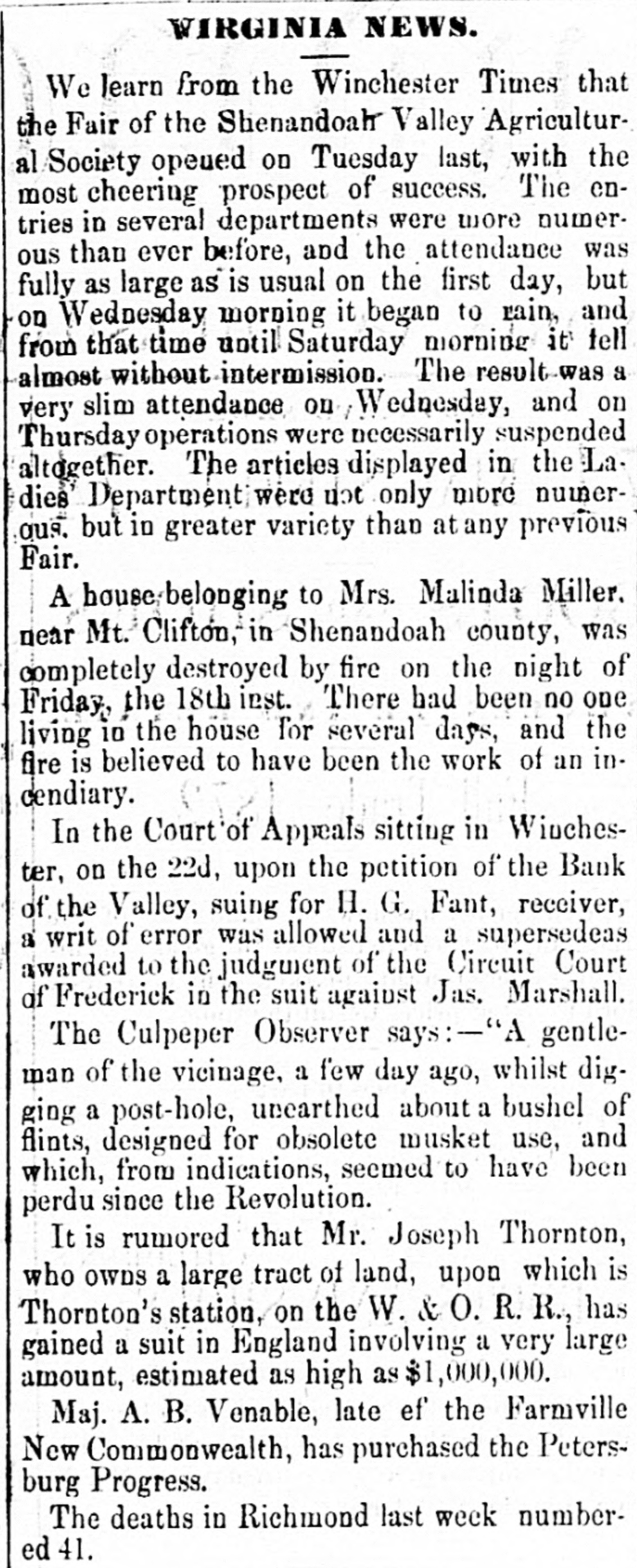 WIRGINIA NEWS. We learn from the Winchester Times that the Fair of the Shenandoah Valley Agricultural Society opeued on Tuesday last, with the most cheering prospect of success. The entries in several departments were more numerous than ever before, and the attendance was fully as large as is usual on the first day, but on Wednesday morning it began to rain, and from that time until Saturday morning it tell almost without intermission. The result was a very slim attendance on Wednesday, and on Thursday operations were necessarily suspended altogether. The articles displayed in the La. dies Department were not only more numerqus. but in greater variety than at any previous Fair. A house belonging to Mrs. Malinda Miller. near Mt. Clifton, in Shenandoah county, was completely destroyed by fire on the night of Friday, the 18th inst. There had been no one living in the house for several days, and the fire is believed to have been the work of an incendiary. In the Court of Appeals sitting in Winchester, on the 22d, upon the petition of the Bank of the Valley, suing for H. G. Fant, receiver, a writ of error was allowed and a supersedeas awarded to the judgment of the Circuit Court of Frederick in the suit against Jas. Marshall. The Culpeper Observer says:-"A gentleman of the vicinage, a few day ago, whilst digging a post-hole, unearthed about a bushel of flints, designed for obsolete musket use, and which, from indications, seemed to have been perdu since the Revolution. It is rumored that Mr. Joseph Thornton, who OWDS a large tract of land, upon which is Thornton's station, on the W. & O. R. R., has gained a suit in England involving a very large amount, estimated as high as $1,000,000. Maj. A. B. Venable, late ef the Farmville New Commonwealth, has purchased the Petersburg Progress. The deaths in Richmond last week numbered 41.