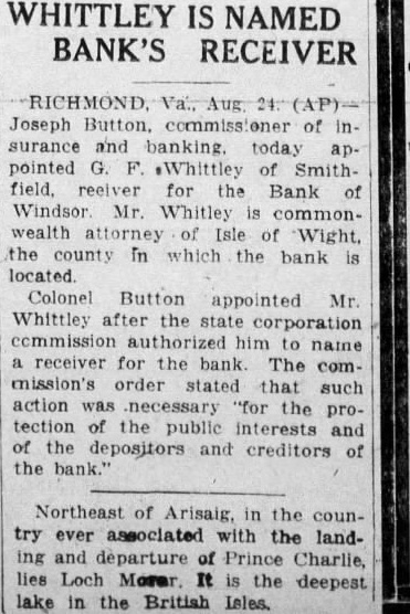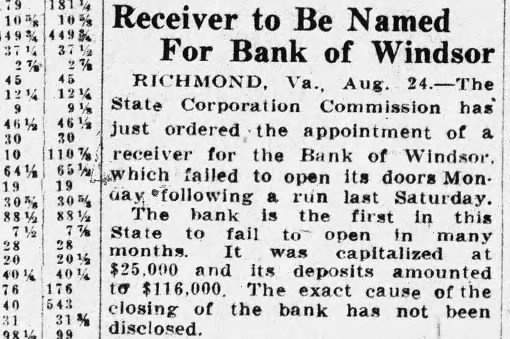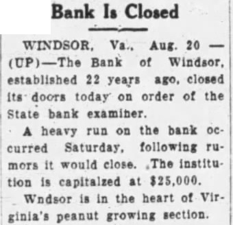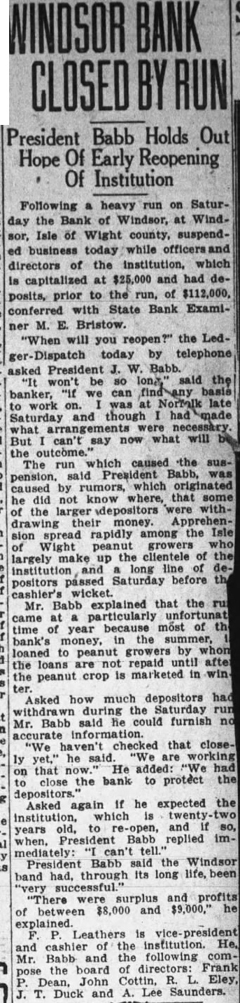 Following heavy run on Saturday the Bank of Windsor, at Windsor, Isle of Wight county, suspended business today while officers directors of the institution, which is capitalized at $25,000 and had deposits, prior to the run, of $112,000, with State Bank Examiconferred ner M. E. Bristow. "When you reopen?" the Ledtoday by telephone asked President W. Babb. be so said the "It banker, "If we can basis was at late work Saturday and though had made what now what will But can't say which caused the The run pension. said President Babb, was caused by rumors, which originated he did not know where, that some of the larger depositors were withdrawing their money. spread rapidly the Isle Wight peanut growers largely the clientele the institution long passed Saturday before positors cashier's wicket. Mr. Babb explained that the came at particularly time year most of bank's money, in the growers by loaned peanut the not repaid after crop is marketed in the peanut ter.