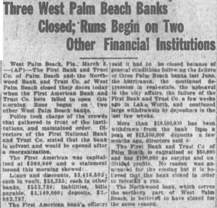 WEST PALM BEACH, March First Bank and Trust Company Palm Beach and the Northwood Bank and Trust Company of West Palm Beach clostheir doors today when the First American Bank and Trust Company here failed this morning. open Runs began two other Palm Beach banks. Police took charge of the crowds that gathered in front of the instituand maintained order. Directors of First American Bank and Trust Company stated that bank would opened after The directors stated that they have than legal reserve on hand. The First American Bank's said had to closed general conditions following failure of three Palm Beach banks last June, the hurricanes, the continued in real estate, the upheaval the city affairs, failure of the First Bank and Trust Company weeks ago in Lake Worth continued withdrawby depositors in the past weeks. It capitalized at First Bank and Trust pany of Beach capitalized $50,000. No reason was announced the closing but is believed that the bank closed in order to forestall The Northwood Bank, which the northeastern part of West Palm Beach, believed to have closed the same reason.