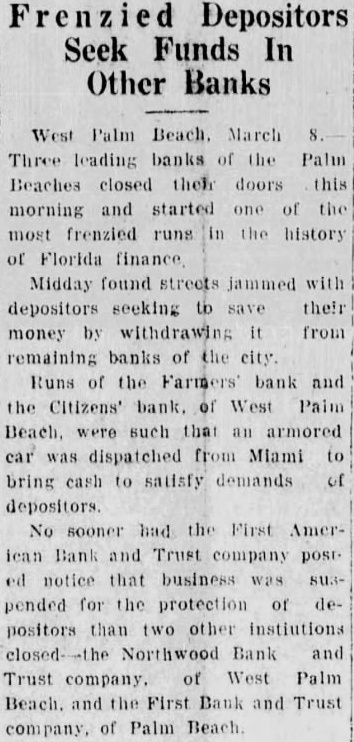 WEST PALM BEACH. March Three leading banks of the Palm Beach district closed their doors today and started one of the most frenzied runs in the history of Florida Mid-day found streets jammed with depositors seeking to save their their money by withdrawing it from the remaining banks of the city. Runs on the Farmers' Bank and the Citizens' Bank of West Palm Beach were such that an armored car was sent from Miami bearing cash for panicky depositors. No sooner had the First American Bank and Trust Company posted notice that business suspended for the protection of depositors than two other institutions closed-the Northwood Bank and Trust Company of West Palm Beach and the First Bank and Trust Company of Palm Beach. Heavy withdrawals on all these banks, during the past eight or ten months and unsettled conditions of affairs in this part of the state, were given is reasons for the clostag.