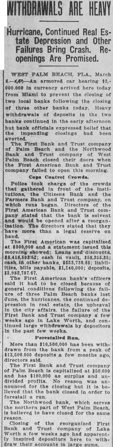 WEST PALM FLA., March armored car bearing in currency arrived here today from Miami to prevent the closing of two local banks following the closing of three other banks today. Heavy withdrawals of deposits in the two banks continued in the early afternoon but bank officials expressed belief that the impending closings had been The First Bank and Trust company Palm Beach and the Bank and Trust company of West Palm Beach closed their doors when the First American Bank and Trust company failed to open this morning. Cops Control Crowds. Police took charge of the crowds that gathered in front of the Institutions, the Bank and the Farmers Bank and Trust company, which runs began. Directors the First American Bank and Trust company stated that the bank is solvent would be opened after reorganization. The directors stated that they more than legal reserve on hand. The First American capitalized $300,000 and statement issued this Loans and cash in vault. other Habilbills payable, $1,140,000; deposits, The First American bank's officers said had be closed because of general conditions following the fallthree Palm Beach banks last June, the hurricanes, the continued pression real estate, the upheaval the city affairs. the failure of First Bank and Trust company few weeks ago In Lake Worth, and continued large withdrawals by depositors in the past few weeks. Forestalled Run. More than has been withdrawn from the bank from peak of deposits few months ago, directors said. The First Bank and Trust company Palm Beach capitalized at $50,000 and has $100,000 as surplus divided profits. No reason was nounced closing but lieved that the bank closed In order to forestall run. The Northwood bank, which serves the part of West Beach, believed to have closed for the same Closing the reorganized First Bank and Trust company Lake Worth ago had apparentinspired depositors here withdraw their accounts in large