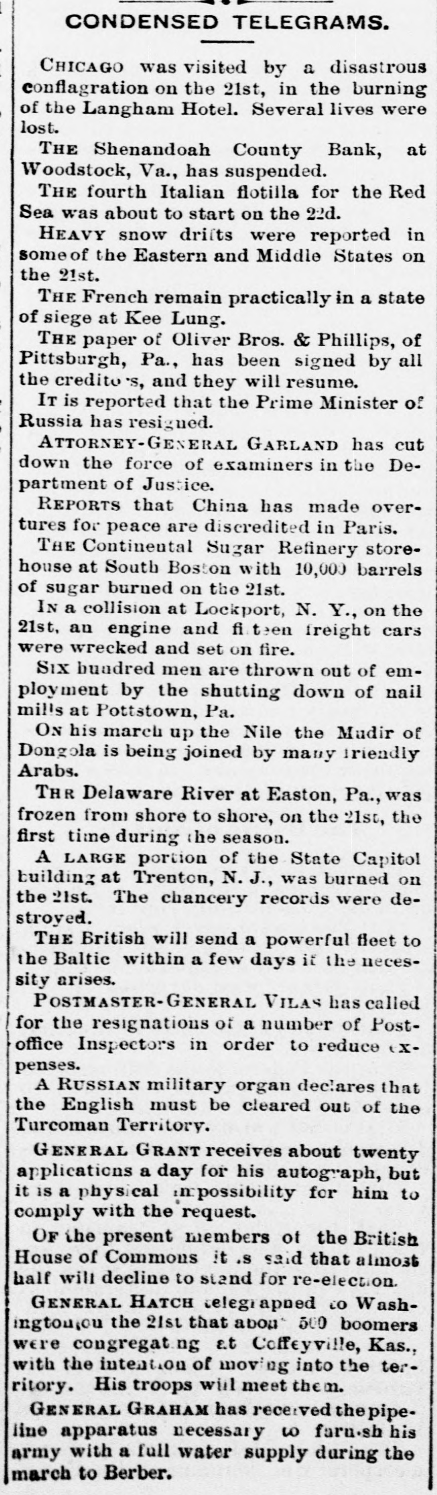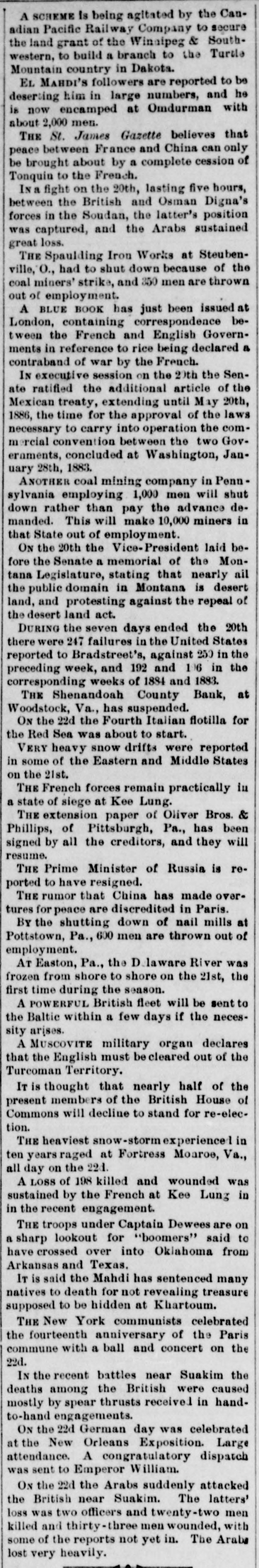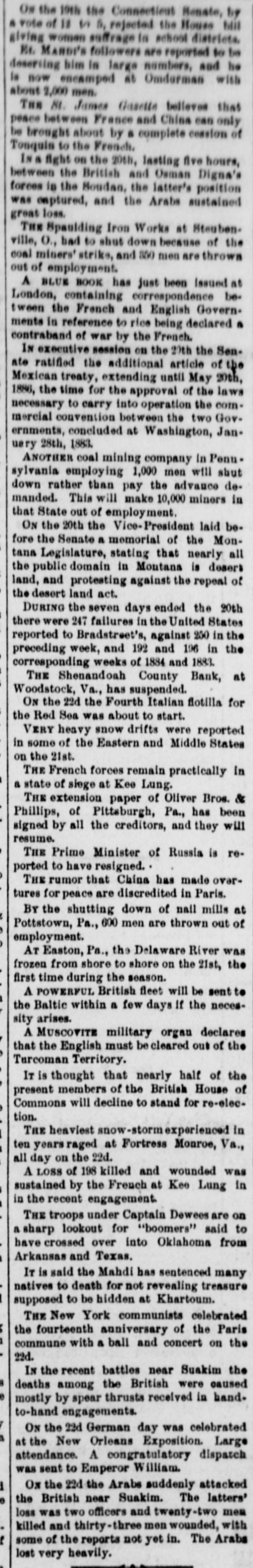 ON the 19th the Connecticut Monate, by A vote of 12 in the woman giving suffrage 5, rejected school House districts Mil are be in he deserving Mr. Manura him followers large numbers, reported and to is now encamped at Omdorman with about 2,000 men. THE Nt. James Gasette believes that peace between France and China can only be brought about by a complete cession of Tonquin to the French. IN a fight on the 20th, lasting five hours, between the British and Osman Digna's forces is the Houdan, the latter's position was captured, and the Arabs sustained great loss. THE Spaulding Iron Works at Steuben. ville, O., had to shut down because of the coal miners' strike, and 850 men are thrown out of employment. A BLUE BOOK has just been Issued at London, containing correspondence between Govern. a ments in the reference French to and rice English being declared contraband of war by the French IN executive session on the 20th the Sen. ate ratified the additional article of the Mexican treaty, extending until May 20th, 1886, the time for the approval of the laws necessary to carry into operation the com. mercial convention between the two Governments, concluded at Washington, Jan. uery 28th, 1883. ANOTHER coal mining company In Penusylvania employing 1,000 mon will shut down rather than pay the advance demanded. This will make 10,000 minors in that State out of employment. ON the 20th the Vice-President laid before the Senate a memorial of the Montana Legislature, stating that nearly all the public domain in Moutana is desert land, and protesting against the repeal of the desert land act. DURING the seven days ended the 20th there were 247 failures in the United States reported to Bradstreet's, against 250 in the preceding week, and 192 and 196 in the corresponding weeks of 1884 and 1883. THE Shenandoah County Bank, at Woodstock, Va., has suspended. ON the 22d the Fourth Italian flotilla for the Red Sea was about to start. VERY heavy snow drifts were reported in some of the Eastern and Middle States on the 21st. THE French forces remain practically in a state of siege at Kee Lung. THE extension paper of Oliver Bros. & Phillips, of Pittsburgh, Pa., has been signed by all the creditors, and they will resume. THE Prime Minister of Russia is reported to have resigned. THE rumor that China has made overtures for peace are discredited in Paris. BY the shutting down of nail mills at Pottstown, Pa., 600 men are thrown out of employment. AT Easton, Pa., the Delaware River was frozen from shore to shore on the 21st, the first time during the season. A POWERFUL British fleet will be sent te the Baltic within a few days If the necessity arises. A MUSCOVITE military organ declares that the English must be cleared out of the Turcoman Territory. IT is thought that nearly half of the present members of the British House of Commons will decline to stand for re-election. THE heaviest snow-stormexperienced in ten years raged at Fortress Monroe, Va., all day on the 22d. A LOSS of 198 killed and wounded was sustained by the French at Kee Lung in in the recent engagement. THE troops under Captain Dewees are on a sharp lookout for "boomers" said to have crossed over into Oklahoma from Arkansas and Texas. IT is said the Mahdi has sentenced many natives to death for not revealing treasure supposed to be hidden at Khartoum. THE New York communists celebrated : the fourteenth anniversary of the Paris commune with a ball and concert on the 22d. IN the recent battles near Suakim the 8 deaths among the British were caused 0 mostly by spear thrusts received in hand. to-hand engagements. ON the 22d German day was celebrated at the New Orleans Exposition. Large attendance. A congratulatory dispatch was sent to Emperor William. I Ox the 22d the Arabs suddenly attacked 0 the British near Suakim. The latters' loss was two officers and twenty-two men killed and thirty-three mon wounded, with f some of the reports not yet in. The Arabs lost very heavily.