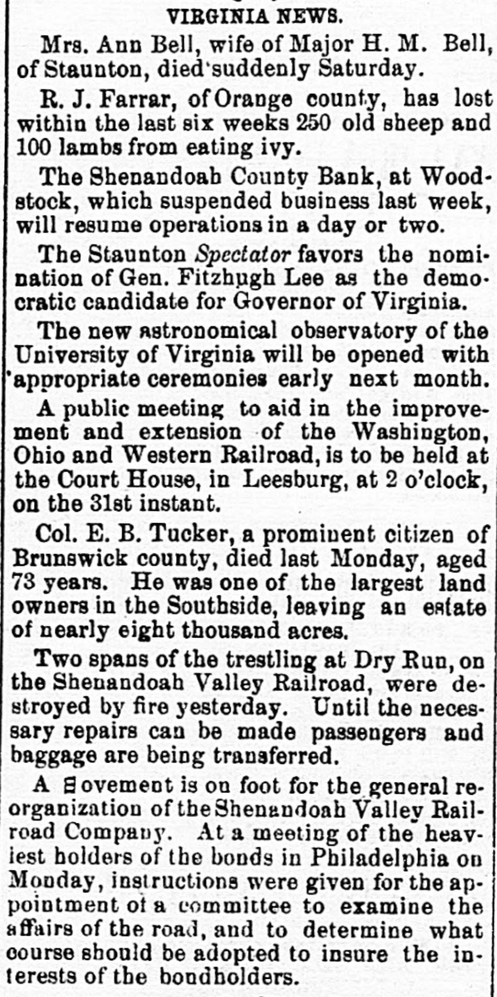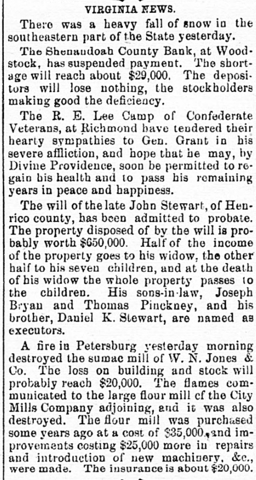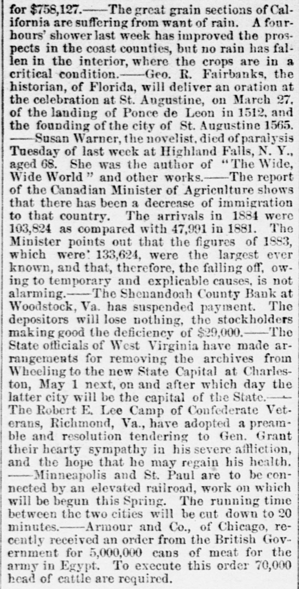ON the 19th the Connecticut Monate, by A vote of 12 in the woman giving suffrage 5, rejected school House districts Mil are be in he deserving Mr. Manura him followers large numbers, reported and to is now encamped at Omdorman with about 2,000 men. THE Nt. James Gasette believes that peace between France and China can only be brought about by a complete cession of Tonquin to the French. IN a fight on the 20th, lasting five hours, between the British and Osman Digna's forces is the Houdan, the latter's position was captured, and the Arabs sustained great loss. THE Spaulding Iron Works at Steuben. ville, O., had to shut down because of the coal miners' strike, and 850 men are thrown out of employment. A BLUE BOOK has just been Issued at London, containing correspondence between Govern. a ments in the reference French to and rice English being declared contraband of war by the French IN executive session on the 20th the Sen. ate ratified the additional article of the Mexican treaty, extending until May 20th, 1886, the time for the approval of the laws necessary to carry into operation the com. mercial convention between the two Governments, concluded at Washington, Jan. uery 28th, 1883. ANOTHER coal mining company In Penusylvania employing 1,000 mon will shut down rather than pay the advance demanded. This will make 10,000 minors in that State out of employment. ON the 20th the Vice-President laid before the Senate a memorial of the Montana Legislature, stating that nearly all the public domain in Moutana is desert land, and protesting against the repeal of the desert land act. DURING the seven days ended the 20th there were 247 failures in the United States reported to Bradstreet's, against 250 in the preceding week, and 192 and 196 in the corresponding weeks of 1884 and 1883. THE Shenandoah County Bank, at Woodstock, Va., has suspended. ON the 22d the Fourth Italian flotilla for the Red Sea was about to start. VERY heavy snow drifts were reported in some of the Eastern and Middle States on the 21st. THE French forces remain practically in a state of siege at Kee Lung. THE extension paper of Oliver Bros. & Phillips, of Pittsburgh, Pa., has been signed by all the creditors, and they will resume. THE Prime Minister of Russia is reported to have resigned. THE rumor that China has made overtures for peace are discredited in Paris. BY the shutting down of nail mills at Pottstown, Pa., 600 men are thrown out of employment. AT Easton, Pa., the Delaware River was frozen from shore to shore on the 21st, the first time during the season. A POWERFUL British fleet will be sent te the Baltic within a few days If the necessity arises. A MUSCOVITE military organ declares that the English must be cleared out of the Turcoman Territory. IT is thought that nearly half of the present members of the British House of Commons will decline to stand for re-election. THE heaviest snow-stormexperienced in ten years raged at Fortress Monroe, Va., all day on the 22d. A LOSS of 198 killed and wounded was sustained by the French at Kee Lung in in the recent engagement. THE troops under Captain Dewees are on a sharp lookout for "boomers" said to have crossed over into Oklahoma from Arkansas and Texas. IT is said the Mahdi has sentenced many natives to death for not revealing treasure supposed to be hidden at Khartoum. THE New York communists celebrated : the fourteenth anniversary of the Paris commune with a ball and concert on the 22d. IN the recent battles near Suakim the 8 deaths among the British were caused 0 mostly by spear thrusts received in hand. to-hand engagements. ON the 22d German day was celebrated at the New Orleans Exposition. Large attendance. A congratulatory dispatch was sent to Emperor William. I Ox the 22d the Arabs suddenly attacked 0 the British near Suakim. The latters' loss was two officers and twenty-two men killed and thirty-three mon wounded, with f some of the reports not yet in. The Arabs lost very heavily.