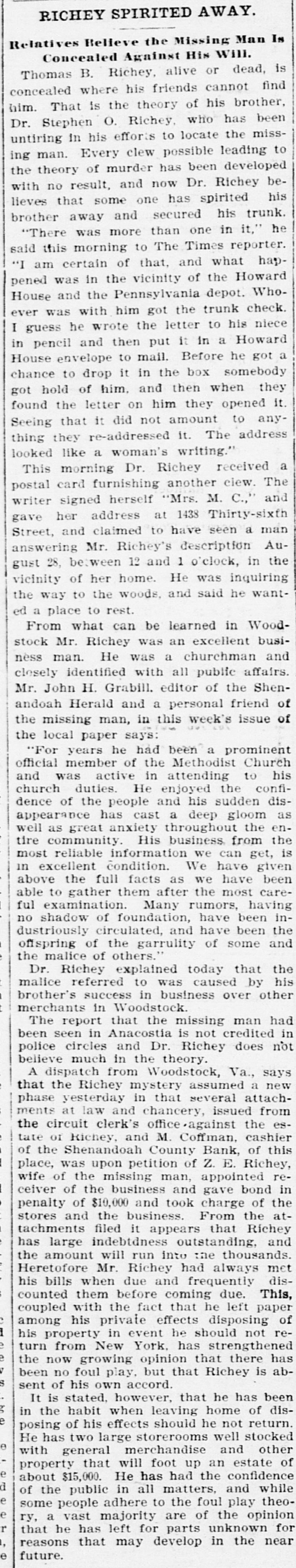 RICHEY SPIRITED AWAY. Relatives Believe the Missing will. Man Is Concealed B. Richey, Against alive His or dead, is concealed Thomas where his friends cannot find That is the theory of his brother, been him. Dr. Stephen O. Richey, who has missuntiring in his efforts to locate the to man. Every clew possible leading ing the theory of murder has been developed bewith no result, and now Dr. Richey his lieves that some one has spirited brother away and secured his trunk. he "There was more than one in it," said this morning to The Times reporter. "I am certain of that, and what happened was in the vicinity of the Howard WhoHouse and the Pennsylvania depot. was with him got the trunk check. niece ever I guess he wrote the letter to his in pencil and then put it in a Howard a House envelope to mail. Before he got chance to drop it in the box somebody got hold of him. and then when they found the letter on him they opened it. Seeing that it did not amount to anything they re-addressed it. The address looked like a woman's writing." This morning Dr. Richey received a postal card furnishing another clew. The and writer signed herself 'Mrs. M. C.," her address at 1438 Thirty-sixth Street, gave and claimed to have seen a man answering Mr. Richey's description August 28, between 12 and 1 o'clock, in the vicinity of her home. He was inquiring the way to the woods. and said he wanted a place to rest. From what can be learned in Woodstock Mr. Richey was an excellent business man. He was a churchman and closely identified with all public affairs. Mr. John H. Grabill. editor of the Shenandoah Herald and a personal friend of the missing man, in this week's issue of the local paper says: "For years he had been a prominent of the Methodist Church active in attending to duties. He enjoyed official and church was member the confi- his of the people and his has cast a dence appearance deep sudden gloom the dis- as great anxiety throughout enHis business information we can well tire community. as reliable from get, the is condition. We the full facts as we in most above excellent have have given care- been them after the most Many rumors, able ful examination. to gather have been having inshadow of foundation, circulated, and of the garrulity of some no dustriously offspring have been and the the malice of others. Dr. Richey explained today that the his malice referred to was caused by brother's success in business over other merchants in Woodstock that the missing man had in Anacostia is not in been The seen report credited does not police circles and Dr. Richey believe much in the theory. A dispatch from Woodstock, Va., says Richey mystery a in that that phase the yesterday assumed several attach- from new at law and chancery, issued clerk's office and M. ments the tate circuit of Richey, Coffman, against the cashier esCounty was upon petition of Z. place, of the Shenandoah Bank, E. Richey, of this wife of the missing man, appointed re- in ceiver of the business and gave bond penalty of $10,000 and took charge of the and the business. From the atfiled it appears stores tachments outstanding, that Richey and has large indebtdness the amount will run into the thousands. Mr. Richey had always met when due and them before coming Heretofore counted his bills frequently due. left paper This, diswith the fact that he I his private effects re- of among coupled should disposing not his property in event he turn from New York. has strengthened has the now growing opinion that there abbeen no foul play. but that Richey is sent of his own accord. has It is stated, however, that he been disthe habit when leaving home of in of his effects should he not return. e posing has two large storerooms well stocked other with He general merchandise and of that will foot up an estate e d property $15,000. He has had the confidence while e of about the public in all matters, and theopeople adhere to the foul play e some vast majority are of the opinion for r ry, that a he has left for parts unknown , e reasons that may develop in the near future.