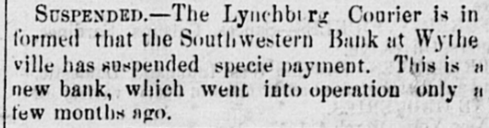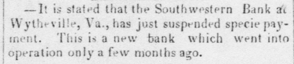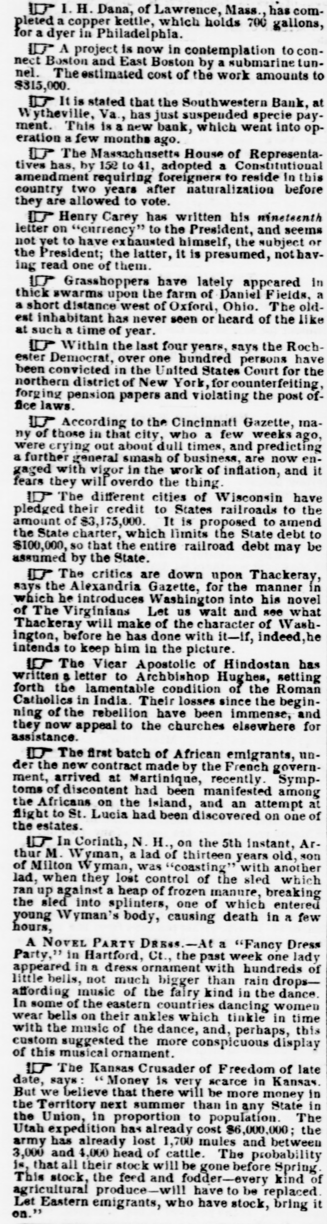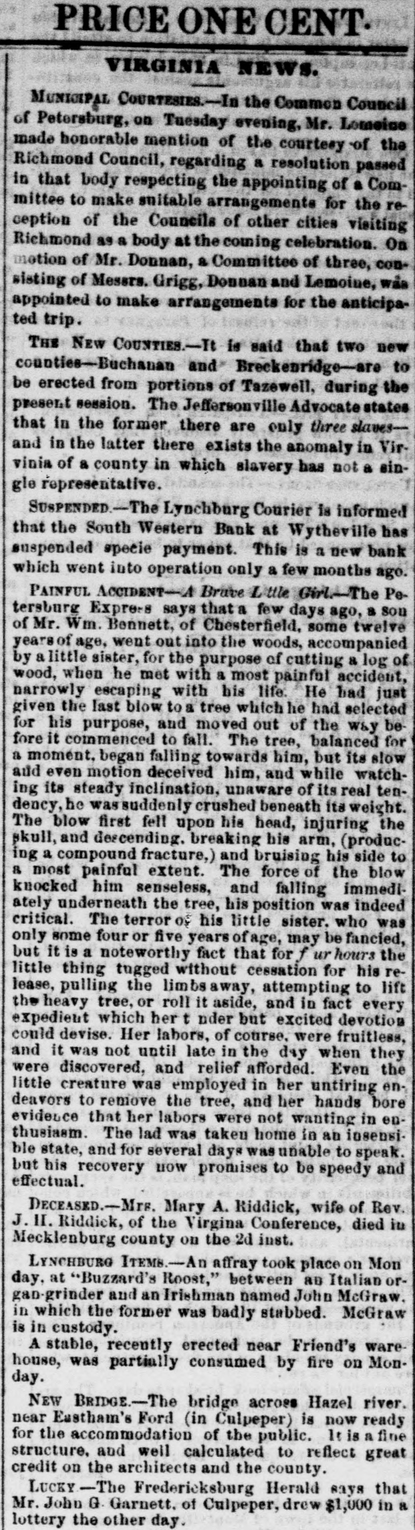 PRICE ONE CENT VIRGINIA NEWS. MUNICIPAL COURTESIES.--In the Common Council of Petersburg, on Tuesday evening, Mr. Lomeige made honorable mention of the courtesy of the Richmond Council, regarding a resolution passed in that body respecting the appointing of a Committee to make snitable arrangements for the reception of the Councils of other cities visiting Richmond as a body at the coming celebration. On motion of Mr. Donnan, a Committee of three, consisting of Mesers. Grigg, Donnan and Lemoine, was appointed to make arrangements for the anticipated trip. THE NEW COUNTIES.-TI is said that two new counties-Buchanan and Breckenridge-are to be erected from portions of Tazewell, during the present session. The Jeffersonville Advocate states that in the former there are only three slavesand in the latter there exists the anomaly in Virvinia of a county in which slavery has not a single representative. SUSPENDED.-The Lynchburg Courier is informed that the South Western Bank at Wytheville has suspended specie payment. This is a new bank which went into operation only a few months ago. PAINFUL ACCIDENT--1 Brave L ttle Girl.-The Petersburg Expre-s says that few days ago, a sou of Mr. Wm. Bennett, of Chesterfield, some twelve years of age, went out into the woods, accompanied by a little sister, for the purpose of cutting a log of wood, when he met with a most painful accident, narrowly escaping with his life. He had just given the last blow to a tree which he had selected for his purpose, and moved out of the way be fore it commenced to fall. The tree, balanced for a moment. began falling towards him, but its slow and even motion deceived him, and while watching its steady inclination, unaware of its real tendency, he was suddenly crushed beneath its weight. The blow first fell upon his head, injuring the skull, and descending. breaking his arm, (producing a compound fracture,) and bruising his side to & most painful extent. The force of the blow knocked him senseless, and falling immediately underneath the tree, his position was indeed critical. The terror of his little sister. who was only some four or five years of age, may be fancied, but it is a noteworthy fact that for f ur hours the little thing tugged without cessation for his release, pulling the limbsaway, attempting to lift the heavy tree, or roll it aside, and in fact every expedient which her t nder but excited devotion could devise. Her labors, of course, were fruitless, and it was not until late in the day when they were discovered, and relief afforded. Even the little creature was employed in her untiring endeavors to remove the tree, and her hands bore evidence that her labors were not wanting in enthusiasm. The lad was taken home in an iosensible state, and for several days was unable to speak. but his recovery HOW promises to be speedy and effectual. DECEASED.-MME. Mary A. Riddick, wife of Rev. J. II. Riddick, of the Virgina Conference, died in Mecklenburg county on the 2d inst. LYNCHBURG ITEMS.-An affray took place on Mon day, at "Buzzard's Roost," between 80 Italian organ-grinder and an Irishman named John McGraw. in which the former was badly stabbed. McGraw is in custody. A stable, recently erected near Friend's warehouse, was partially consumed by fire on Monday. NEW BRIDGE.-The bridge across Hazel river. near Eastham's Ford (in Culpeper) is now ready for the accommodation of the public. It is a fine structure. and well calculated to reflect great credit on the architects and the county. LUCKY -The Fredericksburg Herald says that Mr. John G. Garnett. of Culpeper, drew $1,000 in a lottery the other day.