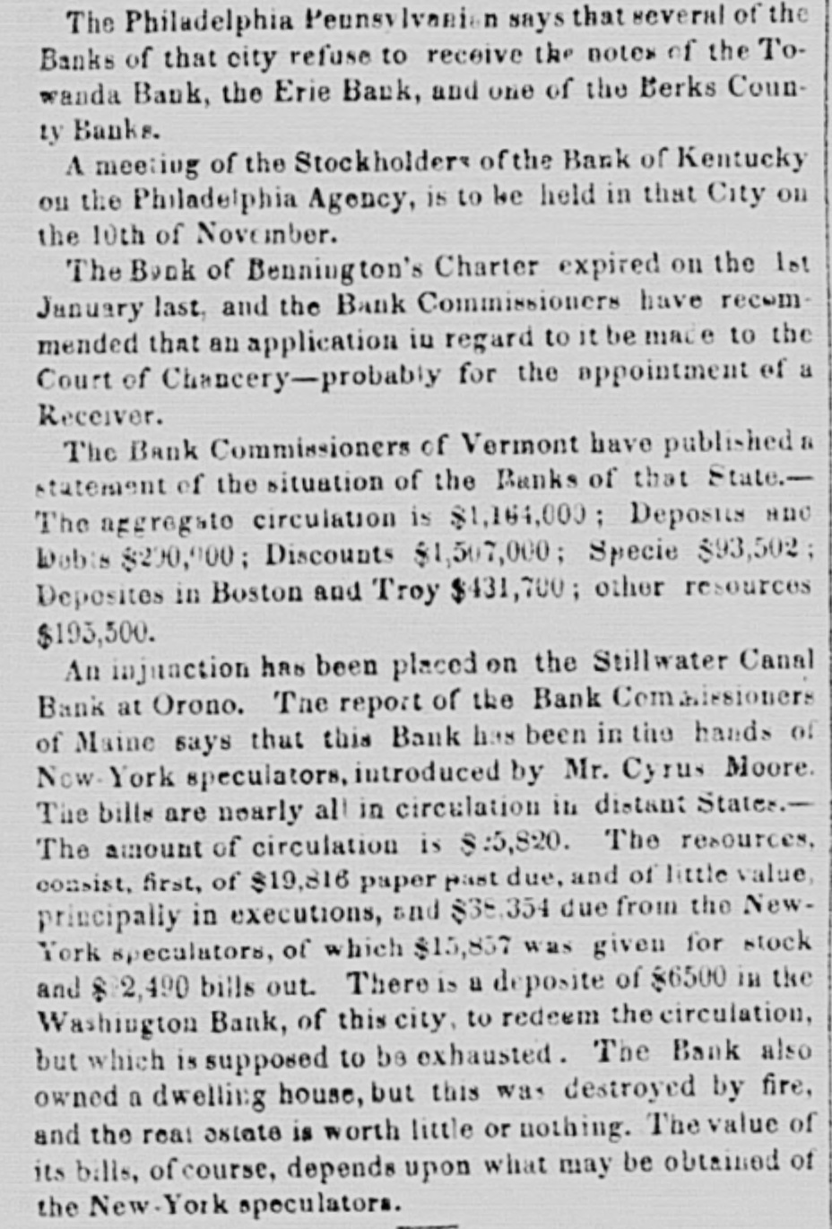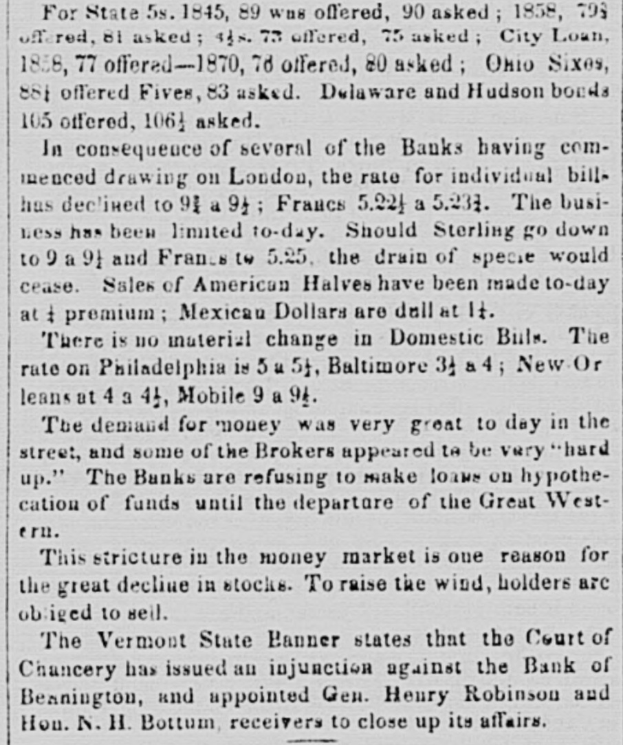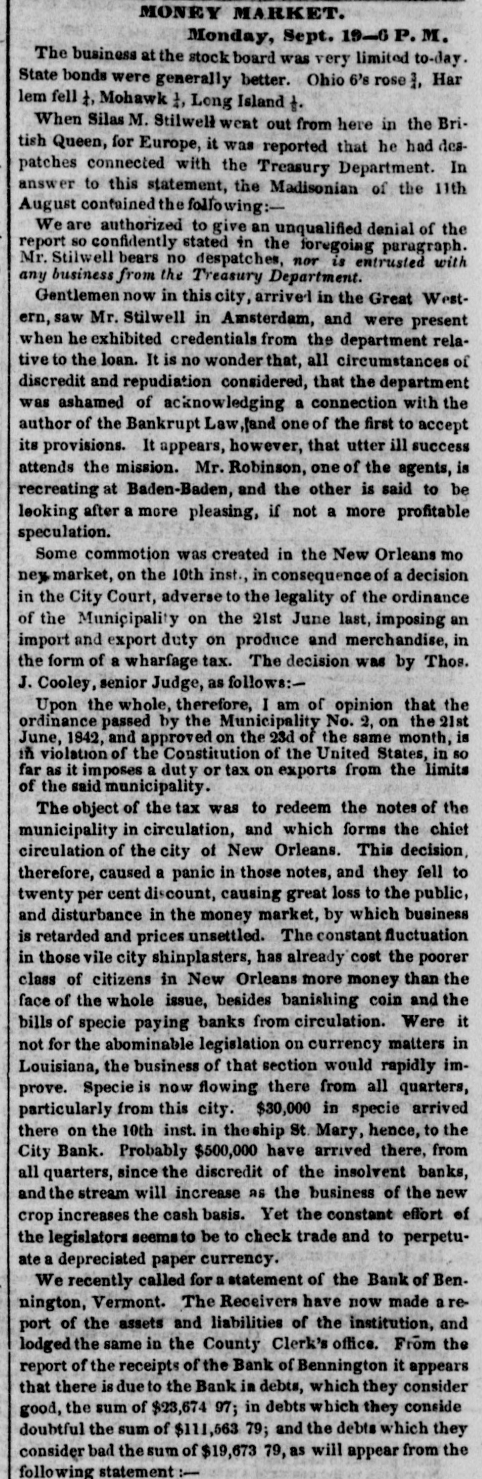 MONEY MARKET. Monday, Sept. 19-6 P. M. The business at the stock board was very limited to-day. State bonds were generally better. Ohio 6's rose 1. Har lem fell t, Mohawk 1, Long Island 1. When Silas M. Stilwell weat out from here in the British Queen, for Europe, it was reported that he had despatches connected with the Treasury Department. In answer to this statement, the Madisonian of the 11th August contained the following:We are authorized to give an unqualified denial of the report so confidently stated in the foregoing paragraph. Mr. Stilwell bears no despatches, nor is entrusted with any business from the Treasury Department. Gentlemen now in this city, arrived in the Great Western, saw Mr. Stilwell in Amsterdam, and were present when he exhibited credentials from the department relative to the loan. It is no wonder that, all circumstances of discredit and repudiation considered, that the department was ashamed of acknowledging a connection with the author of the Bankrupt Law (and one of the first to accept its provisions. It appears, however, that utter ill success attends the mission. Mr. Robinson, one of the agents, is recreating at Baden-Baden, and the other is said to be looking after a more pleasing, if not a more profitable speculation. Some commotion was created in the New Orleans mo ney market, on the 10th inst., in consequence of a decision in the City Court, adverse to the legality of the ordinance of the Municipality on the 21st June last, imposing an import and export duty on produce and merchandise, in the form of a wharfage tax. The decision was by Thos. J. Cooley, senior Judge, as follows:Upon the whole, therefore, I am of opinion that the ordinance passed by the Municipality No. 2, on the 21st June, 1842, and approved on the 23d of the same month, is in violation of the Constitution of the United States, in so far as it imposes a duty or tax on exports from the limits of the said municipality. The object of the tax was to redeem the notes of the municipality in circulation, and which forms the chief circulation of the city of New Orleans. This decision, therefore, caused a panic in those notes, and they fell to twenty per cent discount, causing great loss to the public, and disturbance in the money market, by which business is retarded and prices unsettled. The constant fluctuation in those vile city shinplasters, has already cost the poorer class of citizens in New Orleans more money than the face of the whole issue, besides banishing coin and the bills of specie paying banks from circulation. Were it not for the abominable legislation on currency matters in Louisiana, the business of that section would rapidly improve. Specie is now flowing there from all quarters, particularly from this city. $30,000 in specie arrived there on the 10th inst. in the ship St Mary, hence, to the City Bank. Probably $500,000 have arrived there, from all quarters, since the discredit of the insolvent banks, and the stream will increase as the business of the new crop increases the cash basis. Yet the constant effort of the legislators seems to be to check trade and to perpetuate a depreciated paper currency. We recently called for a statement of the Bank of Ben. nington, Vermont. The Receivers have now made a report of the assets and liabilities of the institution, and lodged the same in the County Clerk's office. From the report of the receipts of the Bank of Bennington it appears that there is due to the Bank in debts, which they consider good, the sum of $23,674 97; in debts which they conside doubtful the sum of $111,563 79; and the debts which they consider bad the sum of $19,673 79, as will appear from the following statement:-