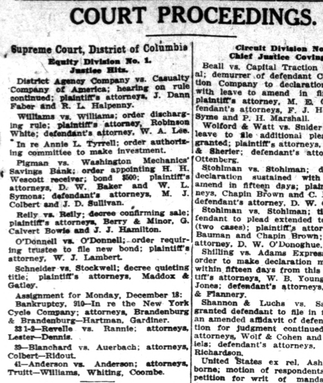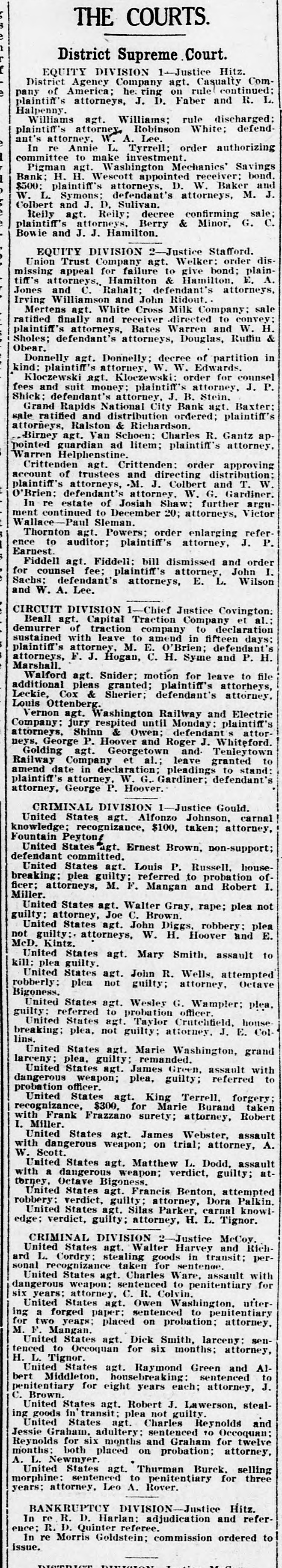 THE COURTS District Supreme Court. EQUITY DIVISION Justice Casualty Hitz. Agency Company agt. continued: ComDistrict he ring on rule L. plaintiff's pany of America; attorneys, J. D. Faber and R. Halpenny agt. Williams; rule discharged defendplaintiff's Williams attorney. Robinson White; I ant's attorney. re Annie W. L. A. Tyrrell; Lee. order authorizing In to make investment. committee agt Washington Mechanics' Savings bond. 1 Pigman H. H. Wescott appointed receiver; Baker and Bank: plaintiff's attorneys. D. W. M. J. $500: W. L. Symons; defendant's attorneys, Colbert and J. D. Sulivan. confirming sale agt. Reily; decree G. C. plaintiff's Reily attorneys. Berry & Minor, Bowie and J. J. Hamilton. EQUITY DIVISION Justice Stafford. order Trust Company agt. Welker: plain- disUnion appeal for failure to give bond; E. A. missing Hamilton & Hamilton. tiff's attorneys, and C. Rahalt; defendant's attorneys, Jones Irving Williamson and John Ridout sale agt. White Cross Milk Company convey: Mertens finally and receiver directed to W. H. ratified attorneys, Bates Warren and & plaintiff's Sholes; defendant's attorneys, Douglas, Ruttiu in Obear. Donnelly agt. Donnelly; decree of partition plaintiff' attorney. W. W. Edwards. kind: agt. Kloczewski: order for counsel J. P. Kloczewski and suit money: plaintiff's attorney, Shick: fees defendant's attorney. J. B. Stein. Rapids National City Bank agt. Baxter: Grand ratified and distribution ordered; plaintiff's attorneys, sale Ralston & Richardson. agt. Van Schoen: Charles R. Gantz ap pointed Birney guardian ad litem; plaintiff` attorney. Warren Helphenstine. Crittenden agt. Crittenden: order approving of trustees and directing distribution; T. W. account plaintiff's attorneys, M. J. Colbert and Gardiner. O'Brien: defendant's attorney. W. G. of Josiah Shaw: further argument In continued re estate to December 20; attorneys, Victor Wallace Paul Sleman. Thornton agt. Powers: order enlarging refer- P. ence to auditor; plaintiff's attorney, J. Earnest. agt. Fiddell: bill dismissed and order I. Fiddell counsel fee: plaintiff's attorney. John Wilson Sachs; for defendant's attorneys, E. L. and W. A. Lee. CIRCUIT DIVISION 1-Chief Justice Covington: al. Beall agt. Capital Traction Company et of traction company to declaration demurrer leave to amend in fifteen days: sustained with O'Brien; defendant's plaintiff's attorney. M. E. and P. H. attorneys, F. J. Hogan, C. H. Syme Marshall. Walford agt. Snider; motion for leave to file pleas granted; plaintiff's attorneys, Leckie, additional Cox & Sherier; defendant's attorney. Louis Ottenberg Washington Railway and Electric Vernon agt. jury respited until Monday plaintiff's attorattorneys. Company: Shinn & Owen; and Roger defendant J. Whiteford. neys. George P. Hoover Tenleytown Golding agt. Georgetown and granted to Company et al. leave Railway date in declaration pleadings to stand: amend plaintiff's attorney. W. G. Gardiner; defendant's attorney, George P. Hoover CRIMINAL DIVISION Justice Gould. States agt. Alfonzo Johnson. carnal Fountain Peytonf knowledge; United recognizance, $100, taken; attorney. United States agt. Ernest Brown, non-support; defendant committed. United States agt. Louis P. Russell, housebreaking: plea guilty referred to probation of I. ficer; attorneys, M. F. Mangan and Robert Miller. United States agt. Walter Gray, rape; plea not guilty; attorney, Joe C. Brown. United States agt. John Diggs, robbery plea E. McD. Kintz. not guilty: attorneys, W. H. Hoover and United States agt. Mary Smith, assault to kill: United plea States guilty agt. John R. Wells, attempted robberly: plea not guilty; attorney, Octave Bigoness. United States agt. Wesley G. Wampler; plea, referred to probation officer. guilty: United States agt Taylor Crutchfield, house Colbreaking; plea, not guilty; attorney, J. E. lins. United States agt. Marie Washington, grand larceny; plea. guilty remanded. United States agt. James Green. assault with to dangerous weapon; plea, guilty; referred probation officer. States agt. King Terrell, forgery; United $300. for Marie Burand Robert taken with recognizance, Frank Frazzano surety; attorney, I. Miller. United States agt. James Webster, assault A. W. Scott. with dangerous weapon; on trial; attorney, United States agt. Matthew L. Dodd, assault atwith a dangerous weapon; verdict, guilty; torney. Octave States Bigoness. agt. Francis Benton, attempted United verdict, guilty; attorney, Dora Palkin. robbery: United States agt. Silas Parker, carnal knowledge; verdict, guilty: attorney, H. L. Tignor. CRIMINAL DIVISION 2 Justice McCoy. agt. Walter Harvey and Rich United States in transit; perL. Cordry: stealing goods sonal ard recognizance taken for sentence States agt. Charles Ware, assault with for Colvin. dangerous United weapon: sentenced to penitentiary six years attorney, C. R. Washington, ufterUnited States agt. Owen penitentiary forged paper: sentenced to M F. Mangan. for ing two a years; placed on probation; attorney. States agt. Dick Smith, larceny: sen tenced United to Occoquan for six months: attorney, H. L. Tignor. States agt. Raymond Green and A1United Middleton. housebreaking sentenced to J. C. bert penitentiary for eight years each; attorney, United Brown. States agt. Robert J. Lawerson, stealing goods in transit; plea not guilty and United States agt. Charles Reynolds Occount; Graham, adultery sentenced to twelve Jessie for six months and Graham for Newmyer months: Reynolds both placed on probation; attorney, A. L. States agt. Thurman Burek. selling morphine: United sentenced to penitentiary for three years; attorney. Leo A. Rover. BANKRUPTCY DIVISION Hitz. In re R. D. Harlan: adjudication and referR. D. Quinter referee. issue. ence; In re Morris Goldstein; commission ordered to