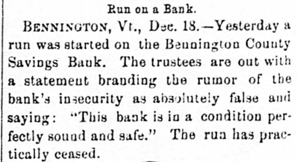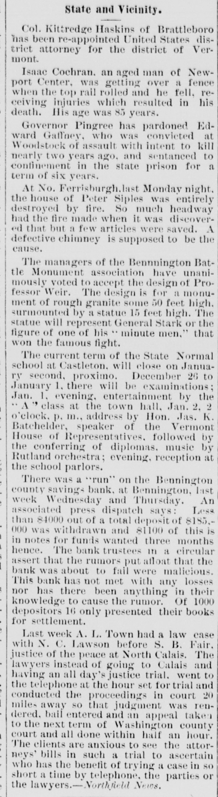 State and Vicinity. Col. Kittredge Haskins of Brattleboro has been re-appointed United States district attorney for the district of Vermont. Isaac Cochran. an aged man of Newport Center, was getting over a fence when the top rail rolled and he fell, receiving injuries which resulted in his death. His age was 85 years. Governor Pingree has pardoned Edward Gaffney, who was convicted at Woodstock of assault with intent to kill nearly two years ago, and sentanced to confinement in the state prison for a term of six years. At No. Ferrisburgh. last Monday night. the house of Peter Siples was entirely destroyed by fire. So much headway had the fire made when it was discovered that but a few articles were saved. A defective chimney is supposed to be the cause. The managers of the Bennnington Battle Monument association have unanimously voted to accept the design of Professor Weir. The design is for a monument of rough granite some 50 feet high. surmounted by a statue 15 feet high. The statue will represent General Stark or the figure of one of his minute men," that won the famous fight. The current term of the State Normal school at Castleton, will close on January second, proximo. December 26 to January 1, there will be examinations; Jan. 1, evening, entertainment by the "A" class at the town hall, Jan. 2, 2 o'clock, p. m., address by Hon. Jas. K. Batchelder, speaker of the Vermont House of Representatives, followed by the conferring of diplomas. music by Rutland orchestra; evening, reception at the school parlors. There was a "run" on the Bennington county savings bank. at Bennington, last week Wednesday and Thursday. An associated press dispatch says: Less than $4000 out of a total deposit of $185.000 was withdrawn and $1100 of this is in notes for funds wanted three months hence. The bank trustees in a circular assert that the rumors put afloat that the bank was about to fail were malicious. This bank has not met with any losses nor has there been anything in their knowledge to cause the rumor. Of 1000 depositors 16 only presented their books for settlement. Last week A. L. Town had a law case with N. C. Lawson before S. B. Fair, justice of the peace at North Calais. The lawyers instead of going to Calais and having an all day's justice trial. went to the telephone at the hour set for trial and conducted the proceedings in court 20 miles away so that judgment was rendered, bail entered and an appeal taken to the next term of Washington county court and all done within half an hour. The clients are anxious to see the attorneys' bills in such a trial to ascertain who has the benefit of trying a case in so short a time by telephone, the parties or the Nt