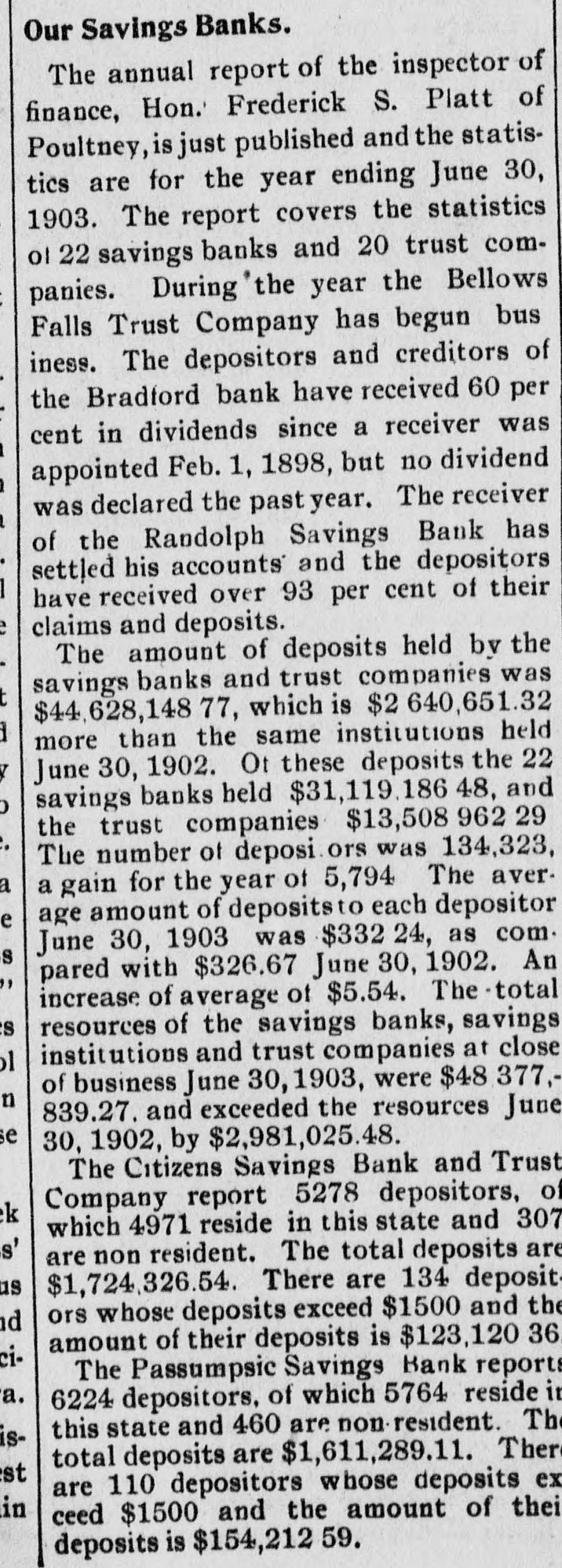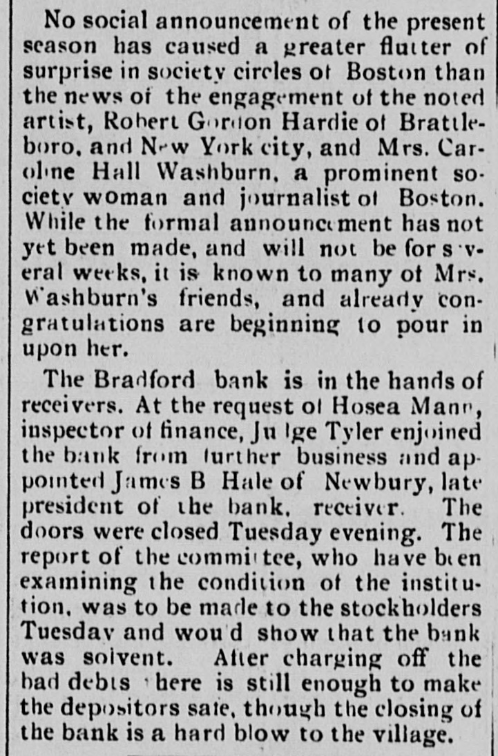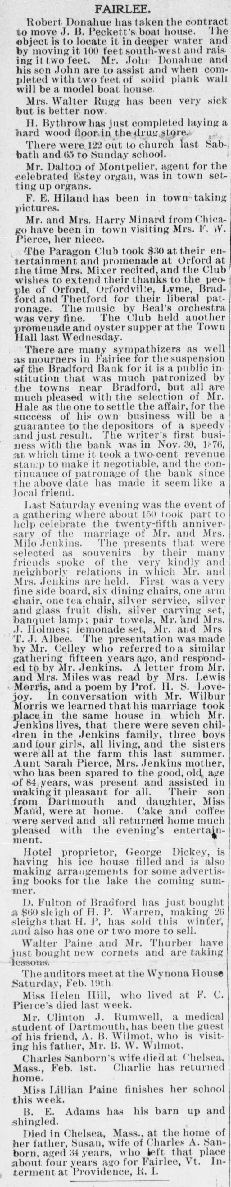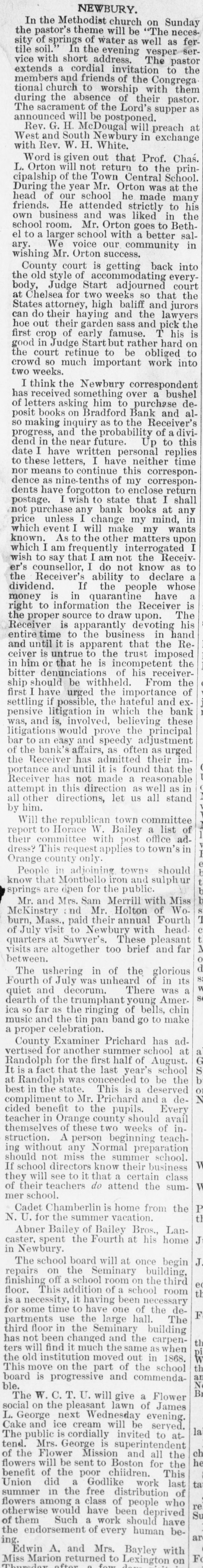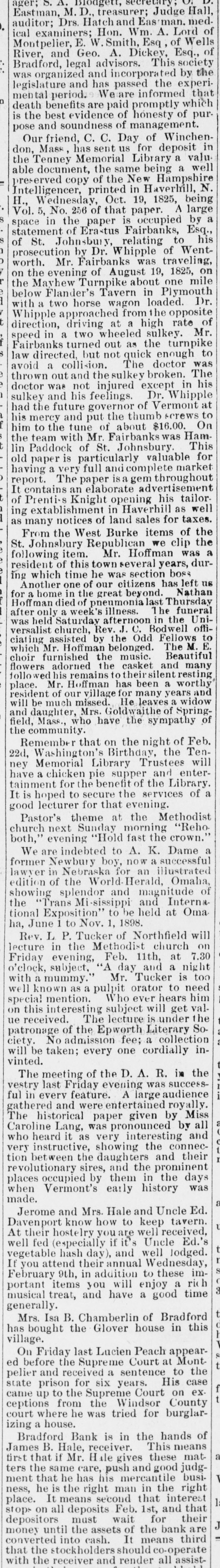 ager; S. A. Blodgett, secretary; O. D. Eastman, M. D., treasurer; Judge Hall, auditor; Drs. Hatch and Eastman, med- ical examiners; Hon. Wm. A. Lord of Montpelier, E. W. Smith, Esq., of Wells River, and Geo. A. Dickey, Esq., of Bradford, legal advisors. This society was organized and incorporated by the legislature and has passed the experi- mental period. We are informed that death benefits are paid promptly which is the best evidence of honesty of pur- pose and soundness of management. Our friend, C. C. Day of Winchen- don, Mass, has sent us for deposit in the Tenney Memorial Library a valu- able document, the same being a well- preserved copy of the New Hampshire Intelligencer, printed in Haverhill, N. H., Wednesday, Oct. 19, 1825, being Vol. 5, No. 256 of that paper. A large space in the paper is occupied by a statement of Erastus Fairbanks, Esq., of St. Johnsbury, relating to his prosecution by Dr. Whipple of Went- worth. Mr. Fairbanks was traveling, on the evening of August 19, 1825, on the Mayhew Turnpike about one mile below Flander's Tavern in Plymouth with a two horse wagon loaded. Dr. Whipple approached from the opposite direction, driving at a high rate of speed in a two wheeled sulkey. Mr. Fairbanks turned out as the turnpike law directed, but not quick enough to avoid a collision. The doctor was thrown out and the sulkey broken. The doctor was not injured except in his sulkey and his feelings. Dr. Whipple had the future governor of Vermont at his mercy and put the thumb screws to him to the tune of about $16.00. On the team with Mr. Fairbanks was Ham- lin Paddock of St. Johnsbury. This old paper is particularly valuable for having a very full and complete market report. The paper is a gem throughout. It contains an elaborate advertisement of Prentis Knight opening his tailor- ing extablishment in Haverhill as well as many notices of land sales for taxes. From the West Burke items of the St. Johnsbury Republican we clip the following item. Mr. Hoffman was a resident of this town several years, dur- ing which time he was section boss Another one of our citizens has left us for a home in the great beyond. Nathan Hoffman died of pneumonia last Thursday after only a week's illness. The funeral was held Saturday afternoon in the Uni- versalist church, Rev. J. C. Bodwell offi- ciating assisted by the Odd Fellows to which Mr. Hoffman belonged. The M. E. choir furnished the music. Beautiful flowers adorned the casket and many followed his remains to their silent resting place. Mr. Hoffman has been a worthy resident of our village for many years and will be much missed. He leaves a widow and daughter, Mrs. Goldwaithe of Spring- field, Mass., who have the sympathy of the community. Remember that on the night of Feb. 22d, Washington's Birthday, the Ten- ney Memorial Library Trustees will have a chicken pie supper and enter- tainment for the benefit of the Library. It is hoped to secure the services of a good lecturer for that evening. Pastor's theme at the Methodist church next Sunday morning "Reho- both," evening "Hold fast the crown." We are indebted to A. K. Dame a former Newbury boy, now a successful lawyer in Nebraska for an illustrated edition of the World-Herald, Omaha, showing splendor and magnitude of the "Trans Mi-sissippi and Interna- tional Exposition" to be held at Oma- ha, June 1 to Nov. 1, 1898. Rev. L. P. Tucker of Northfield will lecture in the Methodist church on Friday evening, Feb. 11th, at 7.30 o'clock, subject, "A day and a night with a mummy." Mr. Tucker is too well known as a pulpit orator to need special mention. Who ever hears him on this interesting subject will get val- ue received. The lecture is under the patronage of the Epworth Literary So- ciety. No admission fee; a collection will be taken; every one cordially in- vinted. # The D. A. R. The meeting of the D. A. R. in the vestry last Friday evening was success- ful in every feature. A large audience gathered and were entertained royally. The historical paper given by Miss Caroline Lang, was pronounced by all who heard it as very interesting and very instructive, showing the connec- tion between the daughters and their revolutionary sires, and the prominent places occupied by them in the days when Vermont's early history was made. Jerome and Mrs. Hale and Uncle Ed. Davenport know how to keep tavern. At their hostelry you are well received, well fed (especially if it's Uncle Ed.'s vegetable hash day), and well lodged. If you attend their annual Wednesday, February 9th, in addition to these im- portant items you will enjoy a rich musical treat, and have a good time generally. Mrs. Isa B. Chamberlin of Bradford has bought the Glover house in this village. On Friday last Lucien Peach appear- ed before the Supreme Court at Mont- pelier and received a sentence to the state prison for six years. His case came up to the Supreme Court on ex- ceptions from the Windsor County court where he was tried for burglar- izing a house. Bradford Bank is in the hands of James B. Hale, receiver. This means first that if Mr. Hale gives these mat- ters the same care, push and good judg- ment that he has his mercantile busi- ness, he is the right man in the right place. It means second that interest stops on all deposits Feb. 1st, and that depositors must wait for their money until the assets of the bank are converted into cash. It means third that the stockholders should co-operate with the receiver and render all assist- ance in the cause of the troubled bank.