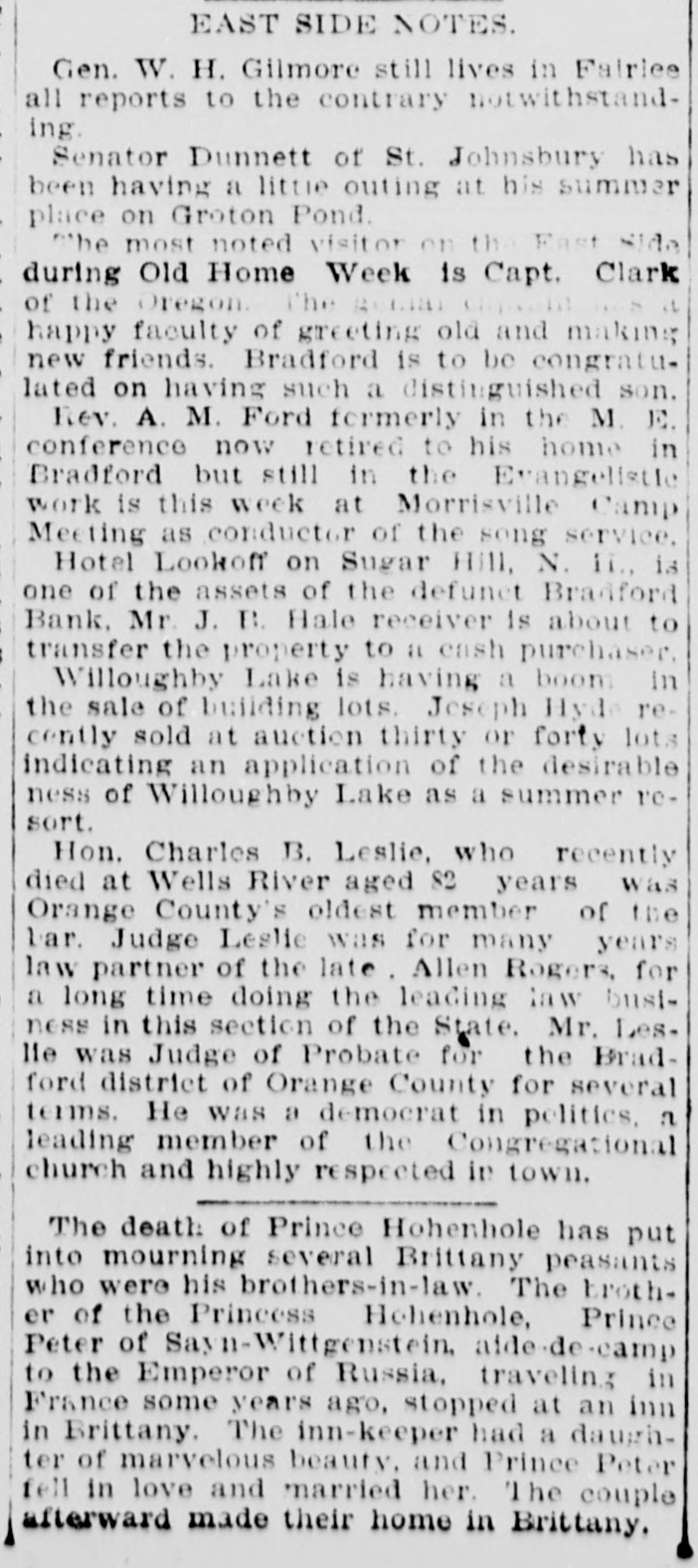 EAST SIDE NOTES. Gen. W. H. Gilmore still lives in Fairlee all reports to the contrary notwithstanding. Senator Dunnett of St. Johnsbury has been having a little outing at his summer place on Groton Pond. The most noted visitor on the East Side during Old Home Week is Capt. Clark of the Oregon. The genar it happy faculty of greeting old and making new friends. Bradford is to be congratulated on having such a distinguished son. Rev. A. M. Ford formerly in the M. E. conference now retired to his home in Bradford but still in the Evangelistle work is this week at Morrisville Camp Meeting as conductor of the song service. Hotel Lookoff on Sugar Hill, N. ii., is one of the assets of the defunct Bradford Bank. Mr. J. B. Hale receiver is about to transfer the property to it cash purchaser. Willoughby Lake is having a boom in the sale of building lots. Jeseph Hyde recently sold at auction thirty or forty lots indicating an application of the desirable ness of Willoughby Lake as a summer resort. Hon. Charles B. Leslie, who recently died at Wells River aged 82 years was Orange County's oldest member of the bar. Judge Leslie was for many years law partner of the late. Allen Rogers, for a long time doing the leading law business in this section of the State. Mr. Les. lie was Judge of Probate for the Bradford district of Orange County for several terms. He was a democrat in politics. a leading member of the Congregational church and highly respected in town. The death of Prince Hohenhole has put into mourning several Brittany peasants who were his brothers-in-law. The broth. er of the Princess Hohenhole, Prince Peter of Sayn-Wittgenstein, aide-de-camp to the Emperor of Russia, traveling in France some years ago, stopped at an inn in Brittany. The inn-keeper had a daughter of marvelous beauty. and Prince Peter fell in love and married her. The couple afterward made their home in Brittany.