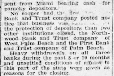 sent from Miami bearing cash for panicky depositors. No sooner had the Brst Bank and Trust company posted notice that business the of depositors than two other institutions closed, the Northwood Bank and Trust company of West Palm Beach and the First Bank and Trust company of Palm Beach. Heavy withdrawals on all three banks during the past 8 or 10 months and unsettled conditions of affairs in this part of the state were given as reasons for the closing.