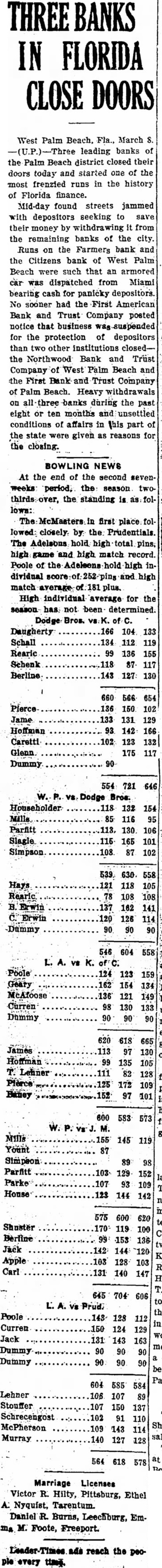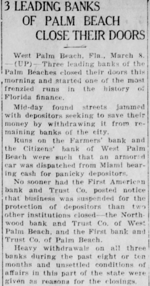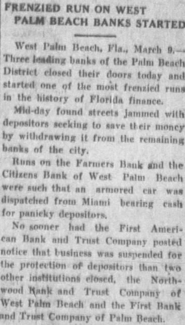 West Palm Beach, Fla Mar (LP)-Three leading banks of the Palm Beaches closed their doors this morning and started one of the most frenzied runs in the history of Florida finance. Midday found streets jammed with depositors seeking to save their money by withdrawing it from remaining banks of the city. Runs on the Farmers' bank and the Citizens' bank of West Palm Beach were such that an armored car was dispatched from Miami bearing cash for panicky depositors. No sooner had the First American Bank and Trust company posted notice that business was suspended for the protection of depositors than two other institutions closed-the Northwood Bank and Trust company of West Palm Beach and the First Bank and Trust company of Palm Beach