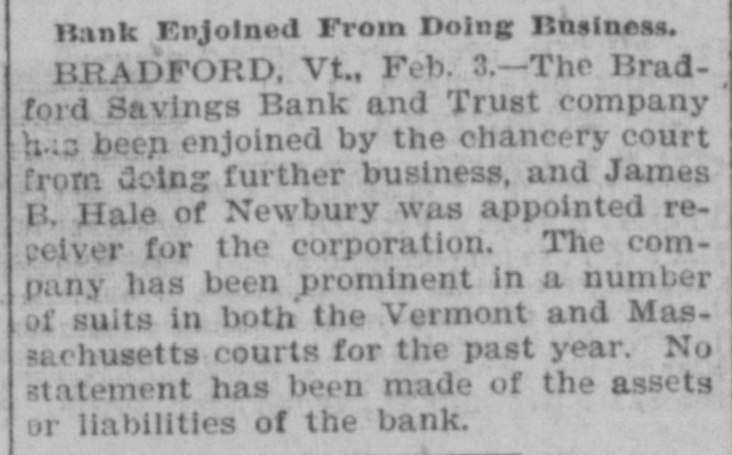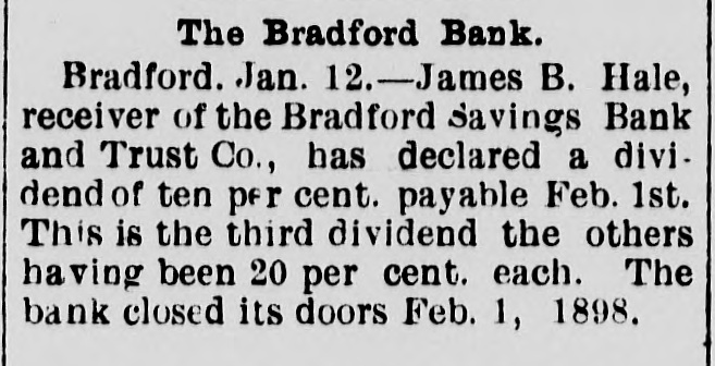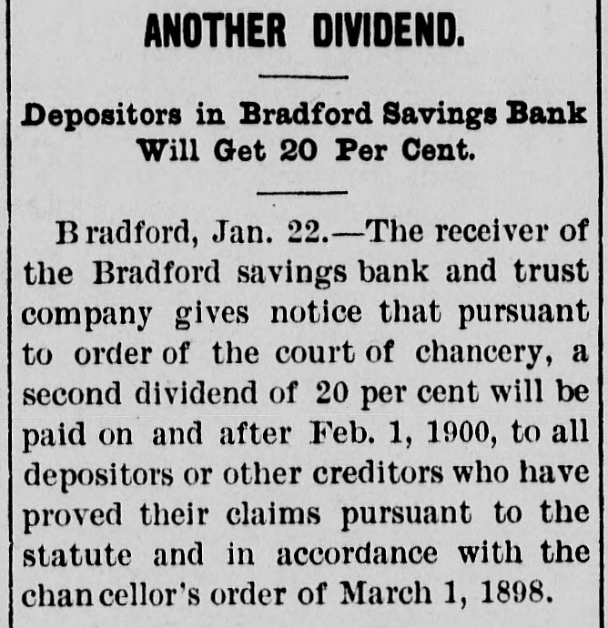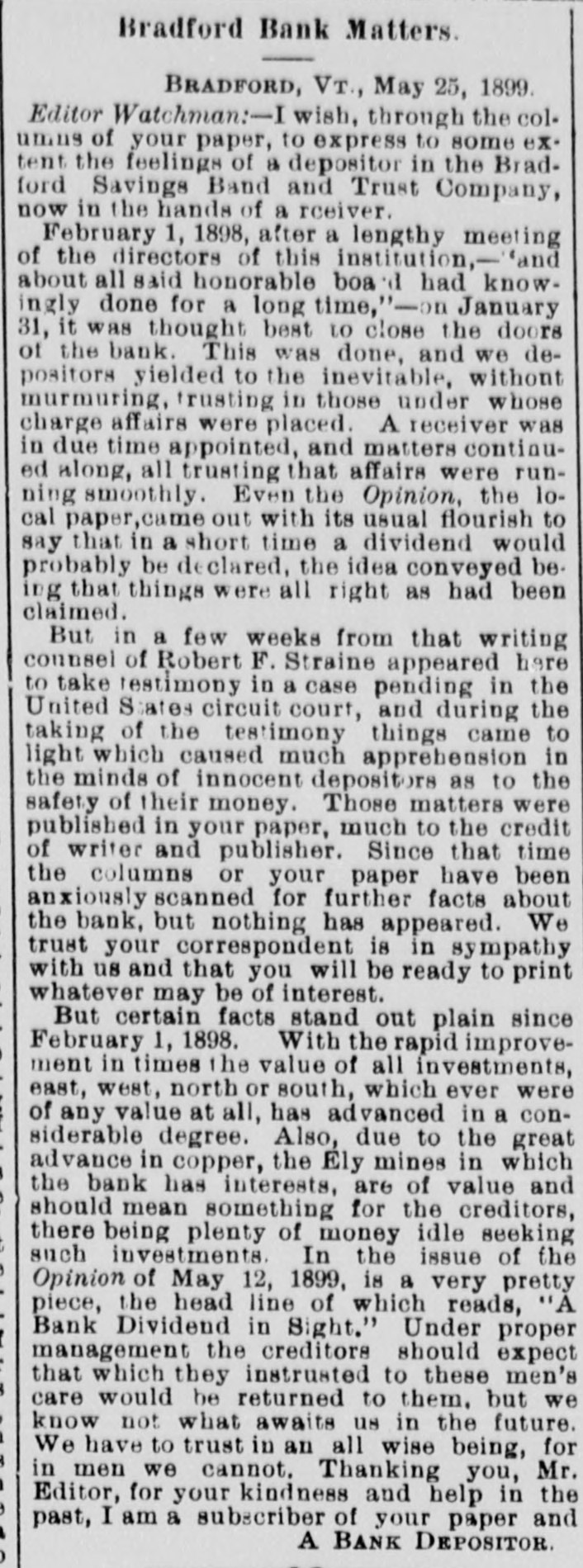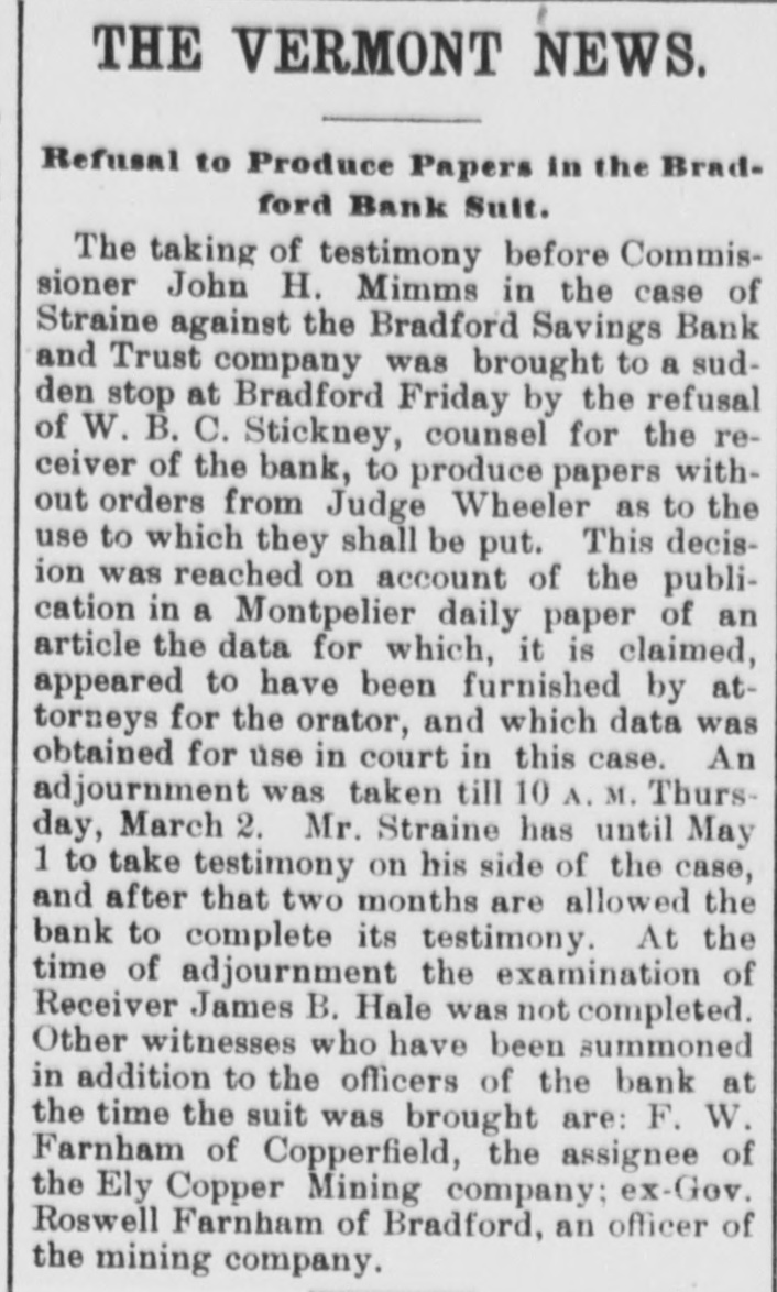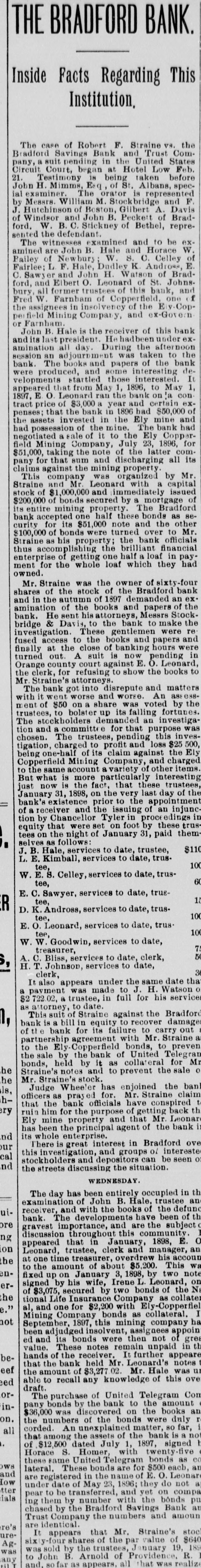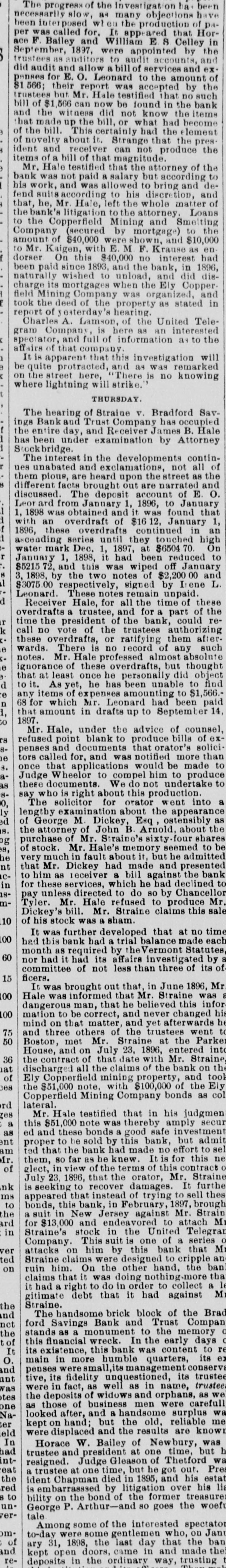 The progress of the Investigation ha beer necessarily slow 84 many objections have been interposed wl en the production of PA. per was called for, It ppeared that Hor ace F Bailey and William E S Celley in September, 1897. were appointed by the trustees auditors to audit and did audit and allow a bill of services and ex penses for E. O. Leonard to the amount of $1 566; their report was accepted by the trustees but Mr. Hale testified that no such bill of $1,566 can now be found in the bank and the witness did not know the items hat made up the bill, or what had become of the bill. This certainly had the element of novelty about it. Strange that the president and receiver can not produce the items of a hill of that magnitude. Mr. Hale testified that the attorney of the bank was not paid a salary but according to work, and was allowed to bring and de fend suits according to his discretion, and that, he, Mr Hale, left the whole matter of the bank's litigation to the attorney Loans to the Copperfield Mining and Smelting Company (secured by mortgage) to the amount of $40,000 were shown, and $10,000 to Mr. Kaigen, with E M F. Krause as en dorser On this $40,000 no interest had been paid since 1893, and the bank, in 1896, naturally wished to unload, and did discharge its mortgages when the Ely Copper field Mining Company was organized, and took the deed of the property as stated in report of yesterday '8 hearing. Charles A. Lamson, of the United Telegram Company is here as an interested speciator, and full of information as to the affairs of that company It is apparent.that this investigation will be quite protracted, and as was remarked on the street here, 'There is no knowing where lightning will strike THURSDAY The hearing of Straine V. Bradford SavBank and Trust Company has occupied the entire ings day, and Receiver James B. Hale has been under examination by Attorney Stockbridge. The interest in the developments contin- of unabated and exclamations, not all them ues pious, are heard upon the street as the different facts brought out are narrated and discussed. The deposit account of E. o. Leon ard from January 1. 1896, to January 1, 1898 was obtained and it was found that with an overdraft of $16 12, January 1, 1896, these overdrafts continued in an ascending series until they touched high water mark Dec. 1, 1897, at $6504 70. On January 1, 1898, it had been reduced to $5215 72 and this was wiped off January 3, 1898, by the two notes of $2,200.00 and L. $3075.00 respectively, signed by Irene Leonard. These notes remain unpaid. d Receiver Hale, for all the time of these overdrafts a trustee, and for a part of the rer time the president of the bank, could k call no vote of the trustees authorizing these overdrafts, or ratifying them after e wards. There is no record of any such <notes. Mr Hale professed almost absolute le ignorance of these overdrafts, but thought that at least once he personally did object d to it. yet, he has been unable to find any items of expenses amounting to $1,566. In e 68 for which Mr. Leonard had been paid that amount in drafts up to September 14, to 1897. Mr. Hale, under the advice of counsel, '8 refused point blank to produce bills of ex8penses and documents that orator's solicie tors called for, and was notified more than 3. once that applications would be made to a Judge Wheelor to compel him to produce as there documents We do not undertake 8say who right about this production. a 0, The solicitor for orator went into ly lengthy examination about the appearance ed of George M. Dickey, Esq ostensibly 18 the attorney of John B. Arnold, about the pg purchase of Mr. Straine's sixty. four shares be 8, of stock. Mr. Hale's memory seemed to he verymuch in fault about it. but he admitted nt that Mr. Dickey had made and presented Cto him as receiver a bill against the bank in for these services, which he had declined to 18pay unless directed to do so by Chancellor m Tyler. Mr. Hale refused to produce Mr. Dickey' bill. Mr. Straine claims this sale 10 of his stock was a sham. It was further developed that at no time 100 had this bank had a trial balance made 60 month as required by the Vermont Statutes, had it had its affairs investigated by of committee nor of not less than three of its 15 ficers. It was brought out that, in June 1896, Mr 00 Hale was informed that Mr. Straine was dangerous man, that he believed this infor 100 mation to be correct, and never changed his mind on that matter, and yet afterwards he 75 and three others of the trustees went to 50 Bostor, met Mr. Straine at the Parker House, and on July 23, 1896, entered into 36 the contract of that date with Mr. Straine at discharged all the claims of the bank on th of Ely Copperfield mining property, and took ees the $51,000 note, with $100,000 of the Ely Copperfield Mining Company bonds as col rd zes lateral. Mr. Hale testified that in his judgmen a this $51,000 note was thereby amply secur as ed and these bonds a good safe investment ent proper to be sold by this bank, but admit am ted that the bank had made no effort to se Mr. them, so far as he knew It is for this ne of glect, in view of the terms of this contract July 23, 1896, that the orator, Mr. Straine further ink seeking to recover damages. It my appeared that instead of trying to sell thes to bonds, this bank, in February, 1897, brough the a suit in New Jersey against Mr. Strain M ard for $13,000 and endeavored to attach in Straine's stock in the United Telegrar Company. This suit is one of a series M ver attacks on him by this bank that ted Straine claims were designed to cripple an on ruin him. On the other hand, the ban claims that it was doing nothing.mor tha had a right to do in order to collect a M gitimate debt that it had against the and Straine. The handsome brick block of the Brad net ford Savings Bank and Trust Compan the stands as a monument to the memory of this financial wreck. In the early days It its existence, this bank was content 