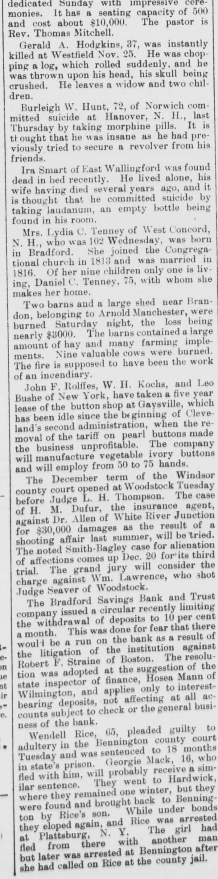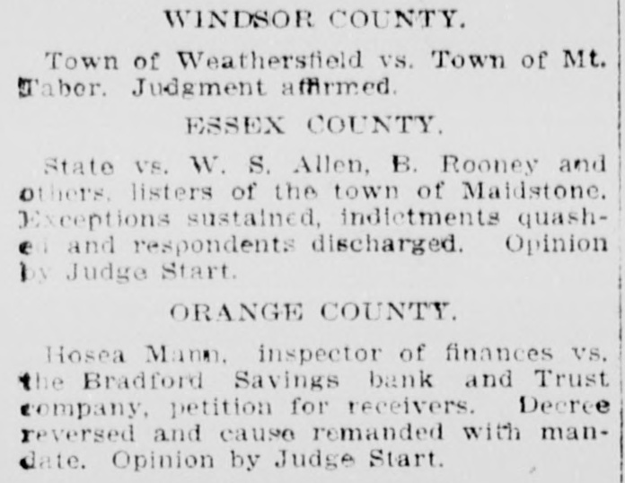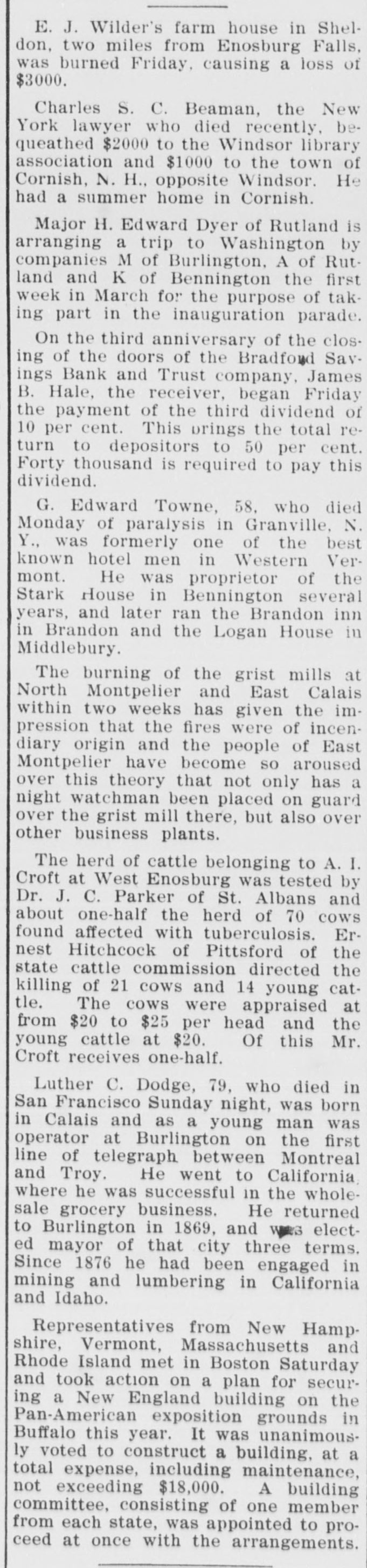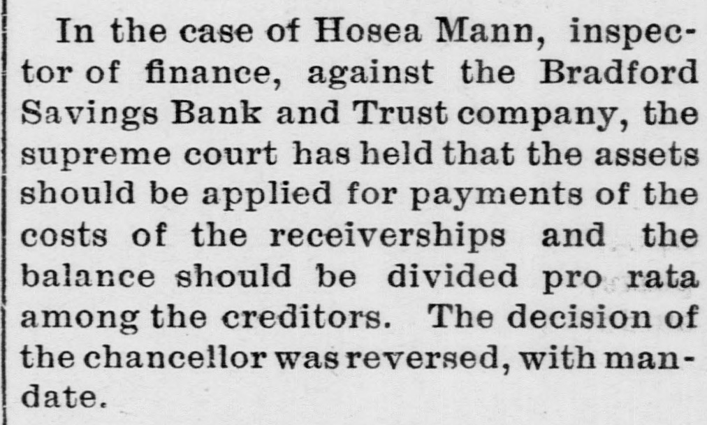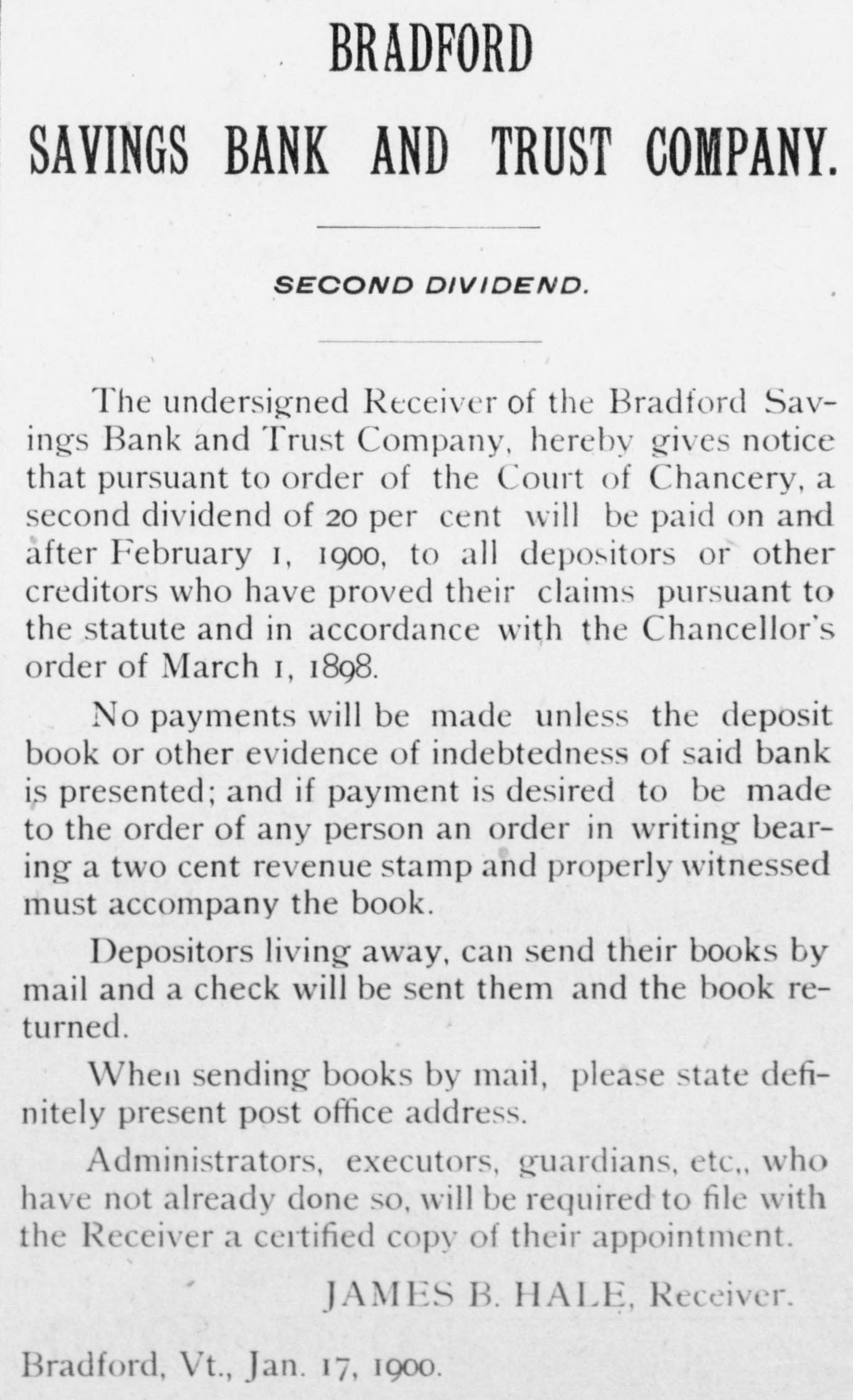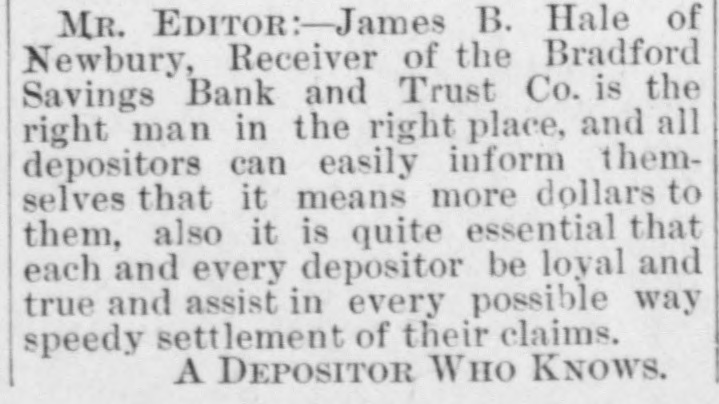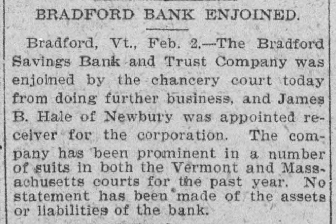 The progress of the Investigation ha beer necessarily slow 84 many objections have been interposed wl en the production of PA. per was called for, It ppeared that Hor ace F Bailey and William E S Celley in September, 1897. were appointed by the trustees auditors to audit and did audit and allow a bill of services and ex penses for E. O. Leonard to the amount of $1 566; their report was accepted by the trustees but Mr. Hale testified that no such bill of $1,566 can now be found in the bank and the witness did not know the items hat made up the bill, or what had become of the bill. This certainly had the element of novelty about it. Strange that the president and receiver can not produce the items of a hill of that magnitude. Mr. Hale testified that the attorney of the bank was not paid a salary but according to work, and was allowed to bring and de fend suits according to his discretion, and that, he, Mr Hale, left the whole matter of the bank's litigation to the attorney Loans to the Copperfield Mining and Smelting Company (secured by mortgage) to the amount of $40,000 were shown, and $10,000 to Mr. Kaigen, with E M F. Krause as en dorser On this $40,000 no interest had been paid since 1893, and the bank, in 1896, naturally wished to unload, and did discharge its mortgages when the Ely Copper field Mining Company was organized, and took the deed of the property as stated in report of yesterday '8 hearing. Charles A. Lamson, of the United Telegram Company is here as an interested speciator, and full of information as to the affairs of that company It is apparent.that this investigation will be quite protracted, and as was remarked on the street here, 'There is no knowing where lightning will strike THURSDAY The hearing of Straine V. Bradford SavBank and Trust Company has occupied the entire ings day, and Receiver James B. Hale has been under examination by Attorney Stockbridge. The interest in the developments contin- of unabated and exclamations, not all them ues pious, are heard upon the street as the different facts brought out are narrated and discussed. The deposit account of E. o. Leon ard from January 1. 1896, to January 1, 1898 was obtained and it was found that with an overdraft of $16 12, January 1, 1896, these overdrafts continued in an ascending series until they touched high water mark Dec. 1, 1897, at $6504 70. On January 1, 1898, it had been reduced to $5215 72 and this was wiped off January 3, 1898, by the two notes of $2,200.00 and L. $3075.00 respectively, signed by Irene Leonard. These notes remain unpaid. d Receiver Hale, for all the time of these overdrafts a trustee, and for a part of the rer time the president of the bank, could k call no vote of the trustees authorizing these overdrafts, or ratifying them after e wards. There is no record of any such <notes. Mr Hale professed almost absolute le ignorance of these overdrafts, but thought that at least once he personally did object d to it. yet, he has been unable to find any items of expenses amounting to $1,566. In e 68 for which Mr. Leonard had been paid that amount in drafts up to September 14, to 1897. Mr. Hale, under the advice of counsel, '8 refused point blank to produce bills of ex8penses and documents that orator's solicie tors called for, and was notified more than 3. once that applications would be made to a Judge Wheelor to compel him to produce as there documents We do not undertake 8say who right about this production. a 0, The solicitor for orator went into ly lengthy examination about the appearance ed of George M. Dickey, Esq ostensibly 18 the attorney of John B. Arnold, about the pg purchase of Mr. Straine's sixty. four shares be 8, of stock. Mr. Hale's memory seemed to he verymuch in fault about it. but he admitted nt that Mr. Dickey had made and presented Cto him as receiver a bill against the bank in for these services, which he had declined to 18pay unless directed to do so by Chancellor m Tyler. Mr. Hale refused to produce Mr. Dickey' bill. Mr. Straine claims this sale 10 of his stock was a sham. It was further developed that at no time 100 had this bank had a trial balance made 60 month as required by the Vermont Statutes, had it had its affairs investigated by of committee nor of not less than three of its 15 ficers. It was brought out that, in June 1896, Mr 00 Hale was informed that Mr. Straine was dangerous man, that he believed this infor 100 mation to be correct, and never changed his mind on that matter, and yet afterwards he 75 and three others of the trustees went to 50 Bostor, met Mr. Straine at the Parker House, and on July 23, 1896, entered into 36 the contract of that date with Mr. Straine at discharged all the claims of the bank on th of Ely Copperfield mining property, and took ees the $51,000 note, with $100,000 of the Ely Copperfield Mining Company bonds as col rd zes lateral. Mr. Hale testified that in his judgmen a this $51,000 note was thereby amply secur as ed and these bonds a good safe investment ent proper to be sold by this bank, but admit am ted that the bank had made no effort to se Mr. them, so far as he knew It is for this ne of glect, in view of the terms of this contract July 23, 1896, that the orator, Mr. Straine further ink seeking to recover damages. It my appeared that instead of trying to sell thes to bonds, this bank, in February, 1897, brough the a suit in New Jersey against Mr. Strain M ard for $13,000 and endeavored to attach in Straine's stock in the United Telegrar Company. This suit is one of a series M ver attacks on him by this bank that ted Straine claims were designed to cripple an on ruin him. On the other hand, the ban claims that it was doing nothing.mor tha had a right to do in order to collect a M gitimate debt that it had against the and Straine. The handsome brick block of the Brad net ford Savings Bank and Trust Compan the stands as a monument to the memory of this financial wreck. In the early days It its existence, this bank was content 