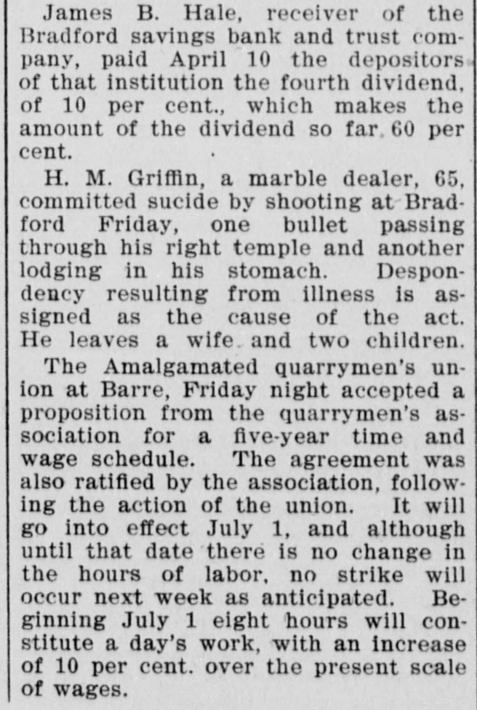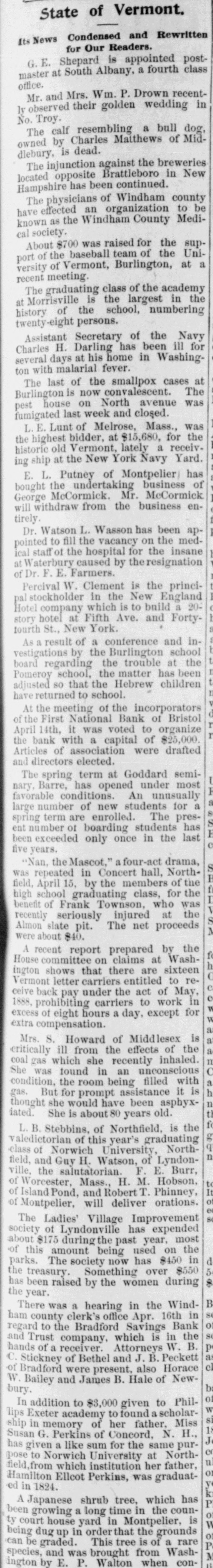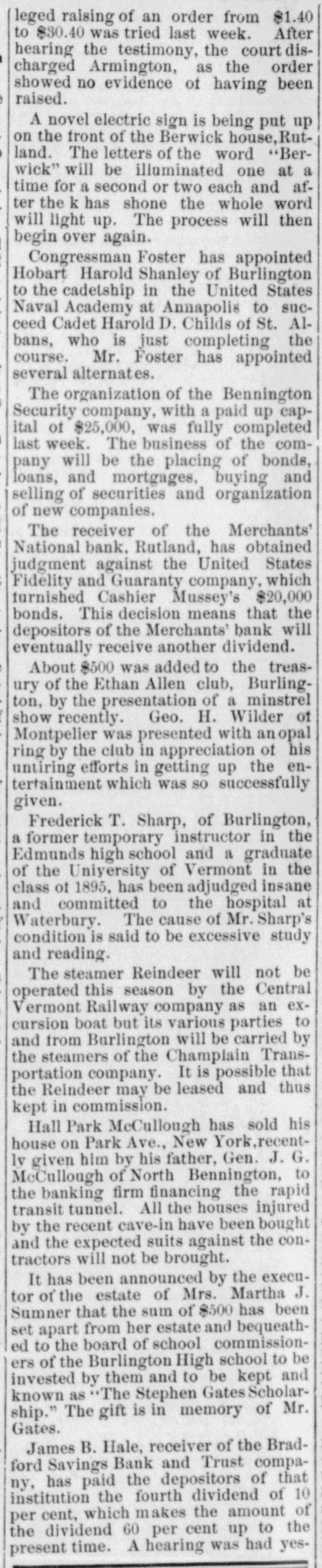 leged raising of an order from $1.40 to $30.40 was tried last week. After hearing the testimony, the court discharged Armington, as the order showed no evidence of having been raised. A novel electric sign is being put up on the front of the Berwick house, Rutland. The letters of the word "Berwick" will be illuminated one at a time for a second or two each and after the k has shone the whole word will light up. The process will then begin over again. Congressman Foster has appointed Hobart Harold Shanley of Burlington to the cadetship in the United States Naval Academy at Annapolis to succeed Cadet Harold D. Childs of St. Albans, who is just completing the course. Mr. Foster has appointed several alternates. The organization of the Bennington Security company, with a paid up capital of $25,000, was fully completed last week. The business of the company will be the placing of bonds, loans, and mortgages, buying and selling of securities and organization of new companies. The receiver of the Merchants' National bank. Rutland, has obtained judgment against the United States Fidelity and Guaranty company, which turnished Cashier Mussey's $20,000 bonds. This decision means that the depositors of the Merchants' bank will eventually receive another dividend. About $500 was added to the treasury of the Ethan Allen club, Burlington, by the presentation of a minstrel show recently. Geo. H. Wilder of Montpelier was presented with nopal ring by the club in appreciation of his untiring efforts in getting up the entertainment which was so successfully given. Frederick T. Sharp, of Burlington, a former temporary instructor in the Edmunds high school and a graduate of the University of Vermont in the class of 1895, has been adjudged insane and committed to the hospital at Waterbury. The cause of Mr. Sharp's condition is said to be excessive study and reading. The steamer Reindeer will not be operated this season by the Central Vermont Railway company as an excursion boat but its various parties to and from Burlington will be carried by the steamers of the Champlain Transportation company. It is possible that the Reindeer may be leased and thus kept in commission. Hall Park McCullough has sold his house on Park Ave., New York recentlv given him by his father, Gen. J. G. McCullough of North Bennington, to the banking firm financing the rapid transit tunnel. All the houses injured by the recent cave-in have been bought and the expected suits against the contractors will not be brought. It has been announced by the executor of the estate of Mrs. Martha J. Sumner that the sum of $500 has been set apart from her estate and bequeathed to the board of school commissioners of the Burlington High school to be invested by them and to be kept and known as "The Stephen Gates Scholarship." The gift is in memory of Mr. Gates. James B. Hale, receiver of the Bradford Savings Bank and Trust company, has paid the depositors of that institution the fourth dividend of 10 per cent, which makes the amount of the dividend 60 per cent up to the present time. A hearing was had yes-