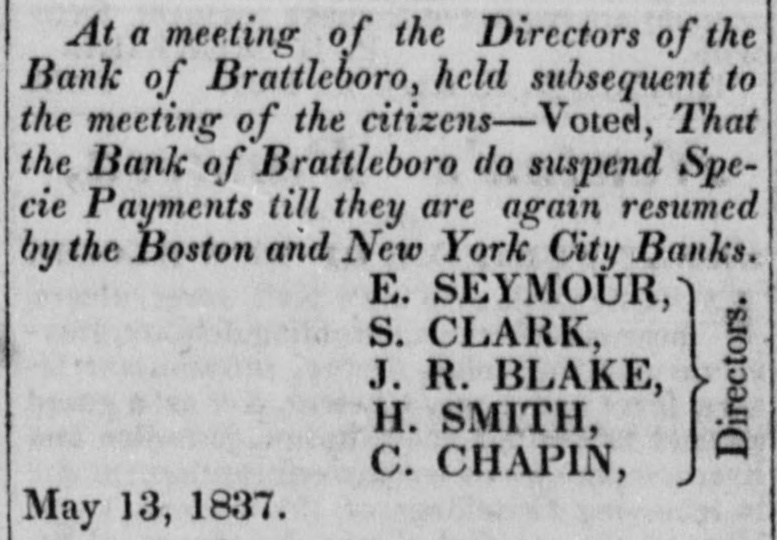 At a meeting of the Directors of the Bank of Brattleboro, held subsequent to the meeting of the citizens-Voted, That the Bank of Brattleboro do suspend Specie Payments till they are again resumed by the Boston and New York City Banks. E. SEYMOUR, S. CLARK, J. R. BLAKE, H. SMITH, C. CHAPIN, May 13, 1837.