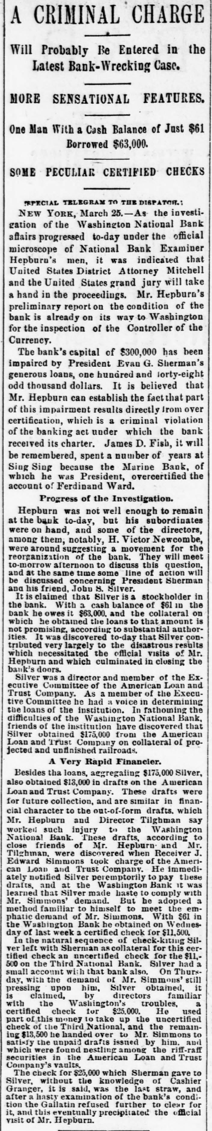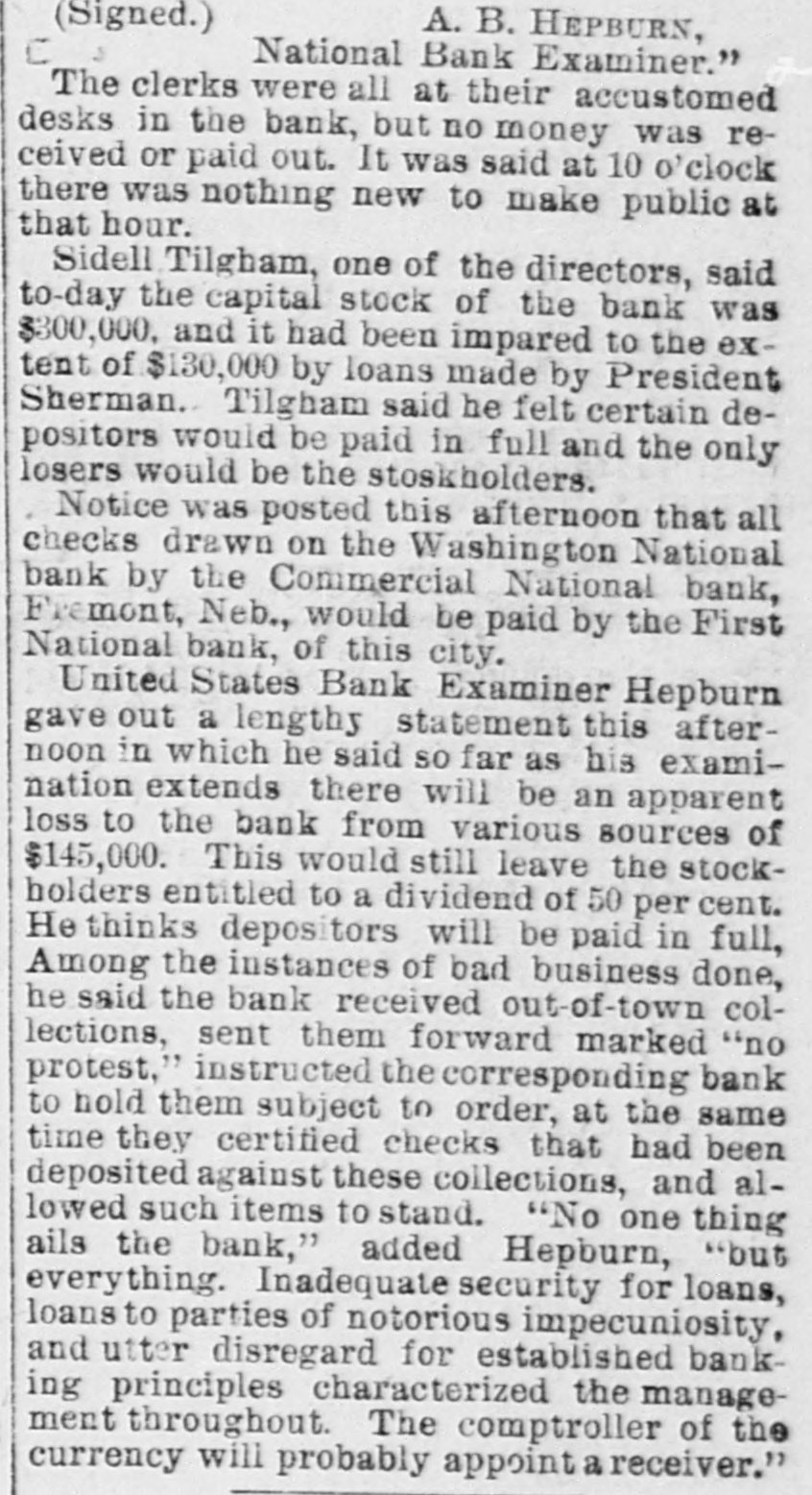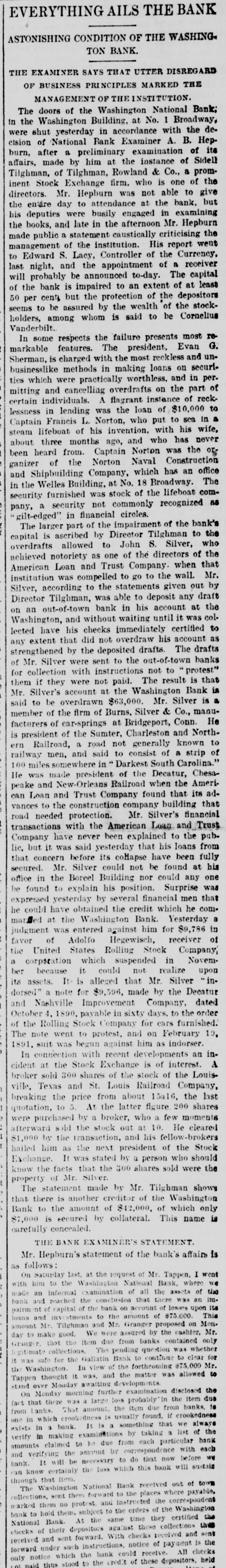 or ASTONISHING CONDITION TON BANK. UTTER DISREGARD THE EXAMINER SAYS PRINCIPLES MARKED THE Washington OF MANAGEMENT BUSINESS OF National Bank; Broadway, were shut Bank in The the Washington doors of the Building. in accordance Examiner at No. with A. B. the of Hep- decision of a preliminary the instance of burn, after National yesterday by him at Rowland examination & Co., a Sidell prom- give the its Tilghman, affairs, Stock made of Exchange Tilghman, firm. was who not is able one bank, to of but directors. Mr. to attendance at in entire were busily afternoon Mr. and late in the inent the the his books, deputies day statement Hepburn caustically engaged His the criticising report examining Hepburn went the management made public S. a of Lacy, the institution. Controller of of the a Currency receiver to Edward the appointment to-day. The last night, be announced to an extent of at will probably and impaired the depositor capital stock- least seems of the bank is but the protection wealth of of the among 50 per to cent be assured whom by is the said to be Cornelius re most features. most holders, Vanderbilt... In some respects the The failure president, presents reckless Evan and un- G. securiwere ties which practically on overdrafts cancelling Sherman, markable businesslike is charged methods with in the making worthless. loans the and on part in per- of of reckinstance to mitting individuals. and was A flagrant the loan of to $10,000 sea in a lessness certain in lending L Norton, who put with his wife, Captain Francis of his invention, and who has never lifeboat months ago, Norton was the 18 in furnished security ganizer about steam been Shipbuilding heard three of from. the Company, Norton Captain at No. Naval which Broadway. lifeboat has Construction an office com- The as not commonly security and the Welles Building, was stock of the recognized pany, circles. bank's capital to allowed "gilt-edged": larger a part in financial of the Director impairment of Tilghman of the to who the of the one directors The is ascribed by John S. Silver, of the that when American compelled achieved overdrafts notoriety Loan and as Trust to Company go to the wail. out Mr. by given institution was to the statements to deposit any draft the on Silver, according was able account at and Director Tilghman. bank in his until it was colan out-of-town without waiting certified to immediately as Washington, have his checks not overdraw his account The drafts of Mr. lected any extent that the did deposited drafts. out-of-town banks with The result strengthened Silver by were sent instructions to the not to protest" is that for collection they were not paid. the Washington Silver Bank is is a them Silver's if account at $63,000. Mr. Co., manuMr. to be overdrawn of Burns. Silver & Conn. He member said of the car-springs firm at Bridgeport, Charleston and North- to facturers president of of the Sumter, not generally a known strip of ern is Railroad, and a road said to Darkest consist South of Carolina. Chesarailway miles men, somewhere in of the when Decatur, the AmeriHe 100 was made New-Orleans president Railroad found that its that adpeake and and Trust Company company building can Loan to the construction Mr. Silver's financial Trust vances needed protection. American Loan and the pubwas transactions road with the been explained to loans from coHapse at Company have said never yesterday that have his been fully his that lic. but concern it before its could not be could found any one secured. the Boreel Surprise found to by several credit which he be office in Mr. yesterday explain Silver Building his the position. nor financial Yesterday men com- that was in a was expressed have obtained Bank. $9,786 of he marked could at the entered Washington against him for receiver of the United which suspended realize corpsration could not Silver a judgment favor because Adolfo States it Rolling Hegewisch, that Stock Mr. in Company, Decatur Novem- upon inber It is alleged made by the dated October dorsed its assets. a note for Improvement $9,596. Company, the order Stock February and Nashville 4. 1890, payable Company sixty for days. cars furnished. 10, inof the Rolling went to protest. and him on as indorser an A of 1891. The note suit was begun with against recent developments interest In connection the Stock Exchange stock is of the Louis the price eident at sold 300 shares Louis of the Railroad Company. last latter ville, broker Texas and St. from about figure 15a16. 200 the shares breaking quotation. to 5. by At a broker, the who 10. a few He moments cleared were purchased sold the stock out and at his fellow-brokers the Stock $1,000 afterward by the transaction. the next president person of who should Exchange. hailed him as It was that stated the 300 by a shares sold were the know property the statement of facts Mr. Silver. made creditor by Mr. of Tilghman the Washington shows only The is another $42,000. of which is 87,000 is concealed. occured that Bank there to the amount by of collateral. This name Mr. Hepburn's I carefully THE BANK statement EXAMINER'S STATEMENT. bank affairs went is follows: at the request of Mr. Bank, Tappen, where we as On Saturday last, Washington National all the assets of im. the nt with him informal to the examination conclusion of that there of loss's upon its investments Granger bank made and an reached capital of the the to bank the on amount account of proposed on $75,000. Mon. This Mr. cashter. amount loans pairm and Mr. Titghman We and were Mr. assured banks by the contained whether only it was 0.000 day to make that good. the item The due pending from question continue to clear Mr. for In the Granger legitimate collections for the Gallatin view of Bank the forthcoming matter was allowed to Washington. it was, and developments. the the thought awaiting disclosed dus Tappen stand over Monday morning further probably the banks item 10 On Monday was large loss the item found, due from if