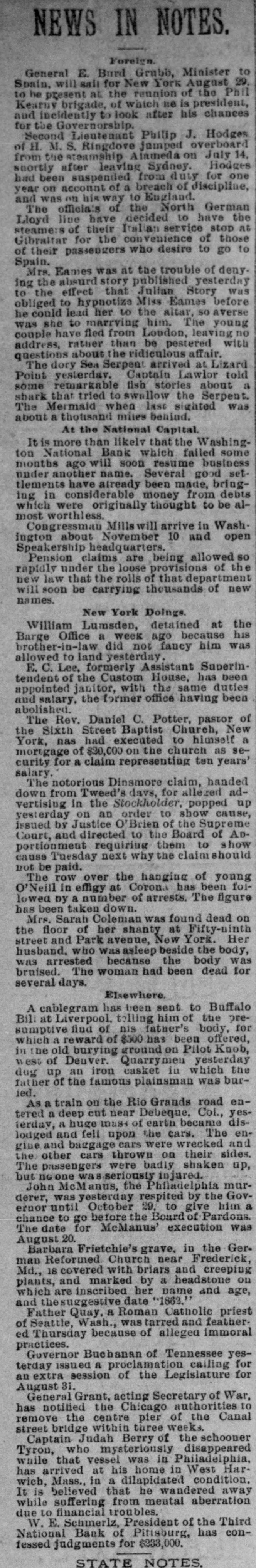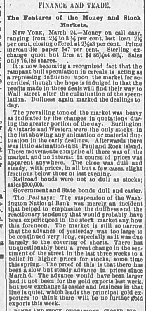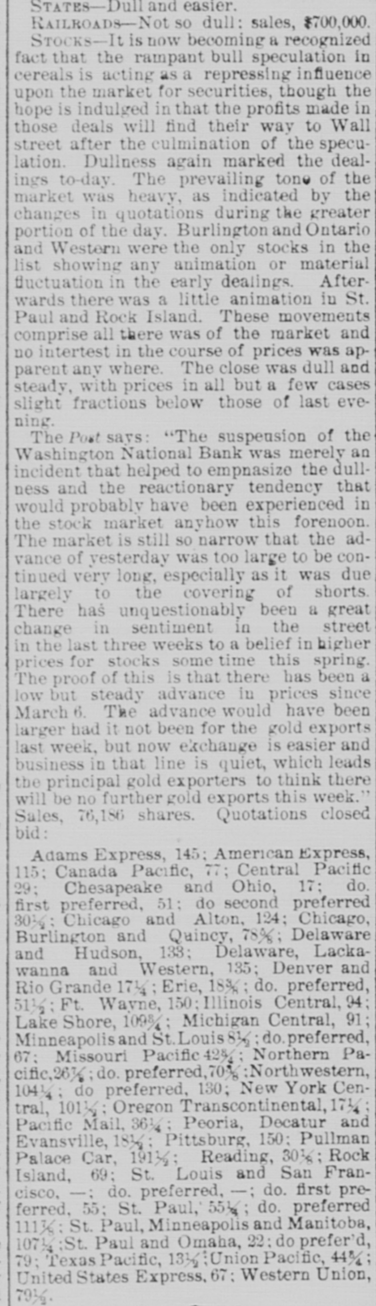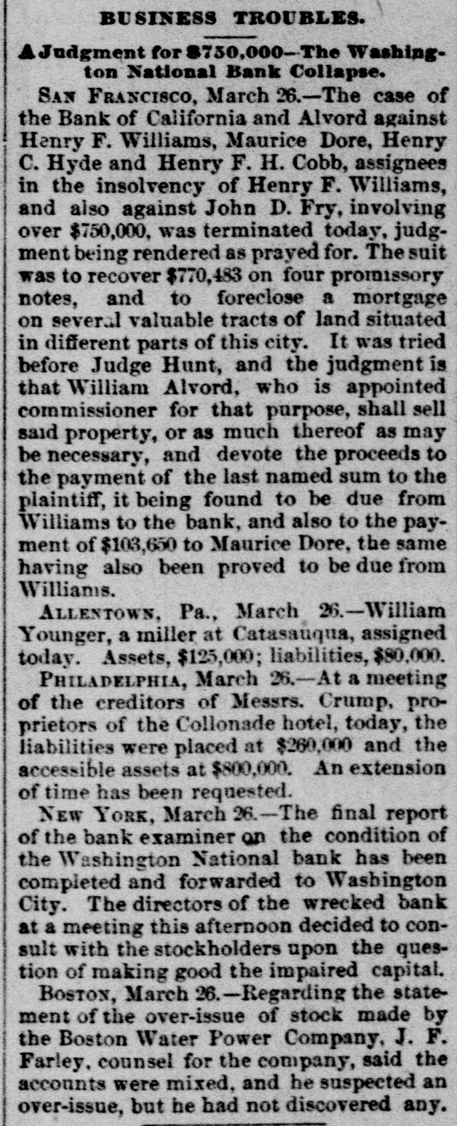 or ASTONISHING CONDITION TON BANK. UTTER DISREGARD THE EXAMINER SAYS PRINCIPLES MARKED THE Washington OF MANAGEMENT BUSINESS OF National Bank; Broadway, were shut Bank in The the Washington doors of the Building. in accordance Examiner at No. with A. B. the of Hep- decision of a preliminary the instance of burn, after National yesterday by him at Rowland examination & Co., a Sidell prom- give the its Tilghman, affairs, Stock made of Exchange Tilghman, firm. was who not is able one bank, to of but directors. Mr. to attendance at in entire were busily afternoon Mr. and late in the inent the the his books, deputies day statement Hepburn caustically engaged His the criticising report examining Hepburn went the management made public S. a of Lacy, the institution. Controller of of the a Currency receiver to Edward the appointment to-day. The last night, be announced to an extent of at will probably and impaired the depositor capital stock- least seems of the bank is but the protection wealth of of the among 50 per to cent be assured whom by is the said to be Cornelius re most features. most holders, Vanderbilt... In some respects the The failure president, presents reckless Evan and un- G. securiwere ties which practically on overdrafts cancelling Sherman, markable businesslike is charged methods with in the making worthless. loans the and on part in per- of of reckinstance to mitting individuals. and was A flagrant the loan of to $10,000 sea in a lessness certain in lending L Norton, who put with his wife, Captain Francis of his invention, and who has never lifeboat months ago, Norton was the 18 in furnished security ganizer about steam been Shipbuilding heard three of from. the Company, Norton Captain at No. Naval which Broadway. lifeboat has Construction an office com- The as not commonly security and the Welles Building, was stock of the recognized pany, circles. bank's capital to allowed "gilt-edged": larger a part in financial of the Director impairment of Tilghman of the to who the of the one directors The is ascribed by John S. Silver, of the that when American compelled achieved overdrafts notoriety Loan and as Trust to Company go to the wail. out Mr. by given institution was to the statements to deposit any draft the on Silver, according was able account at and Director Tilghman. bank in his until it was colan out-of-town without waiting certified to immediately as Washington, have his checks not overdraw his account The drafts of Mr. lected any extent that the did deposited drafts. out-of-town banks with The result strengthened Silver by were sent instructions to the not to protest" is that for collection they were not paid. the Washington Silver Bank is is a them Silver's if account at $63,000. Mr. Co., manuMr. to be overdrawn of Burns. Silver & Conn. He member said of the car-springs firm at Bridgeport, Charleston and North- to facturers president of of the Sumter, not generally a known strip of ern is Railroad, and a road said to Darkest consist South of Carolina. Chesarailway miles men, somewhere in of the when Decatur, the AmeriHe 100 was made New-Orleans president Railroad found that its that adpeake and and Trust Company company building can Loan to the construction Mr. Silver's financial Trust vances needed protection. American Loan and the pubwas transactions road with the been explained to loans from coHapse at Company have said never yesterday that have his been fully his that lic. but concern it before its could not be could found any one secured. the Boreel Surprise found to by several credit which he be office in Mr. yesterday explain Silver Building his the position. nor financial Yesterday men com- that was in a was expressed have obtained Bank. $9,786 of he marked could at the entered Washington against him for receiver of the United which suspended realize corpsration could not Silver a judgment favor because Adolfo States it Rolling Hegewisch, that Stock Mr. in Company, Decatur Novem- upon inber It is alleged made by the dated October dorsed its assets. a note for Improvement $9,596. Company, the order Stock February and Nashville 4. 1890, payable Company sixty for days. cars furnished. 10, inof the Rolling went to protest. and him on as indorser an A of 1891. The note suit was begun with against recent developments interest In connection the Stock Exchange stock is of the Louis the price eident at sold 300 shares Louis of the Railroad Company. last latter ville, broker Texas and St. from about figure 15a16. 200 the shares breaking quotation. to 5. by At a broker, the who 10. a few He moments cleared were purchased sold the stock out and at his fellow-brokers the Stock $1,000 afterward by the transaction. the next president person of who should Exchange. hailed him as It was that stated the 300 by a shares sold were the know property the statement of facts Mr. Silver. made creditor by Mr. of Tilghman the Washington shows only The is another $42,000. of which is 87,000 is concealed. occured that Bank there to the amount by of collateral. This name Mr. Hepburn's I carefully THE BANK statement EXAMINER'S STATEMENT. bank affairs went is follows: at the request of Mr. Bank, Tappen, where we as On Saturday last, Washington National all the assets of im. the nt with him informal to the examination conclusion of that there of loss's upon its investments Granger bank made and an reached capital of the the to bank the on amount account of proposed on $75,000. Mon. This Mr. cashter. amount loans pairm and Mr. Titghman We and were Mr. assured banks by the contained whether only it was 0.000 day to make that good. the item The due pending from question continue to clear Mr. for In the Granger legitimate collections for the Gallatin view of Bank the forthcoming matter was allowed to Washington. it was, and developments. the the thought awaiting disclosed dus Tappen stand over Monday morning further probably the banks item 10 On Monday was large loss the item found, due from if