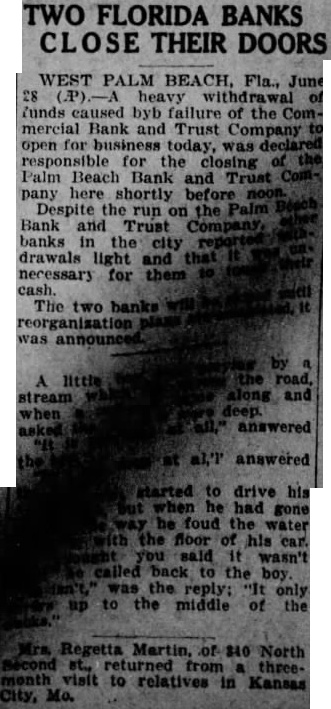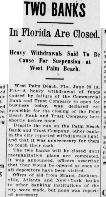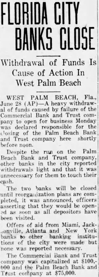 WEST PALM BEACH, June 28-Following the close of the Commercial Bank and Trust company here today, for the conservation of resources and the protection of depositors, run on the Palm Beach Bank and Trust company forced it to close its doors just before noon. Depositors milled about the outside of the bank.