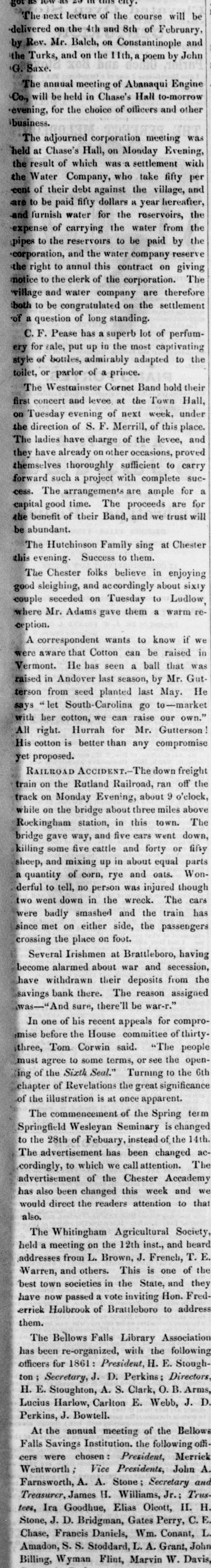 got as low 20 city. The next lecture of the course will be delivered on the 4th and 8th of February, Rev. Mr. Balch, OR Constantinople John and the Turks, and on the 11th, a poem by G. Saxe. The annual meeting of Abanaqui Engine Co., will be held in Chase's Hall to-morrow evening, for the choice of officers and other business. The adjourned corporation meeting was held at Chase's Hall, on Monday Evening, the result of which was a settlement with the Water Company, who take fifty per cent of their debt against the village, and are to be paid fifty dollars a year hereafter, and furnish water for the reservoirs, the expense of carrying the water from the pipes to the reservoirs to be paid by the corporation, and the water company reserve the right to annul this contract on giving The notice to the clerk of the corporation. village and water company are therefore both to be congratulated on the settlement of a question of long standing. C.F. Pease has a superb lot of perfumery for sale, put up in the most captivating the style of bottles, admirably adapted to toilet, or parlor of a prince. The Westminster Cornet Band hold their first concert and levee at the Town Hall, on Tuesday evening of next week, under the direction of S. F. Merrill, of this place. The ladies have charge of the levee, and they have already on other occasions, proved themselves thoroughly sufficient to carry forward such a project with complete success. The arrangements are ample for a capital good time. The proceeds are for the benefit of their Band, and we trust will abundant. The Hutchinson Family sing at Chester this evening. Success to them. The Chester folks believe in enjoying good sleighing, and accordingly about sixty couple seceded on Tuesday to Ludlow, where Mr. Adams gave them a warm reception. A correspondent wants to know if we in were aware that Cotton can be raised Vermont. He has seen a ball that was raised in Andover last season, by Mr. Gut- He terson from seed planted last May. says let South-Carolina go to-market with her cotton, we can raise our own." All right. Hurrah for Mr. Gutterson His cotton is better than any compromise yet proposed. RAILROAD ACCIDENT.- down freight train on the Rutland Railroad, ran off the track on Monday Evening, about 9 o'clock, while on the bridge about three miles above The Rockingham station, in this town. bridge gave way, and five cars went down, killing some five cattle and forty or fifty sheep, and mixing up in about equal parts a quantity of corn, rye and oats. Wonderful to tell, no person was injured though two went down in the wreck. The cars has were badly smashed and the train since met on either side, the passengers crossing the place on foot. Several Irishmen at Brattleboro, having become alarmed about war and secession, the have withdrawn their deposits from savings bank there. The reason assigned was-"Ar sure, there'll be war-r." In one of his recent appeals for compromise before the House committee of thirty. three, Tom Corwin said. "The people must agree to some terms, or see the opening of the Sixth Seal." Turning to the 6th chapter of Revelations the great significance of the illustration is at once apparent. The commencement of the Spring term Springfield Wesleyan Seminary is changed 14th. to the 28th of Febuary, instead of the The advertisement has been changed The accordingly, to which we call attention. advertisement of the Chester Accademy has also been changed this week and that we would direct the readers attention to also. The Whitingham Agricultural Society, held a meeting on the 12th inst., and heard addresses from L. Brown, J. French, T. E. Warren, and others. This is one of the best town societies in the State, and they have now passed a vote inviting Hon. F rederrick Holbrook of Brattleboro to address them. The Bellows Falls Library Association has been re-organized, with the following officers for 1861: President, H. E. Stoughton ; Secretary, J. D. Perkins: Directors, H. E. Stoughton, A. S. Clark, 0.1 Arms, D. Lucius Harlow, Carlton E. Webb, J. Perkins, J. Bowtell. At the annual meeting of the Bellows Falls Savings Institution. the following officers were chosen: President, Merriek Wentworth Vice Presidents, John A. Farnsworth, A. A. Stone; Secretary and Treasurer, James H. Williams, Jr.: Trus- H. tees, Ira Goodhue, Elias Olcott, II. Stone, J. D. Bridgman, Gates Perry, C.E. Chase, Francis Daniels, Wm. Conant, L. Amadon, S. S. Stoddard, L. A. Grant, John Billing, Wyman Flint, Marvin W. Davis