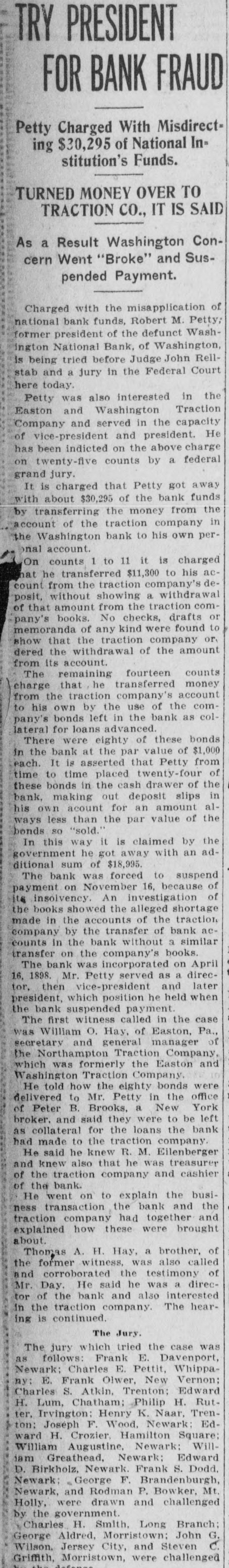 TRY PRESIDENT FOR BANK FRAUD Petty Charged With Misdirecting $30,295 of National In= stitution's Funds. TURNED MONEY OVER TO TRACTION co., IT IS SAID As a Result Washington Concern Went "Broke" and Suspended Payment. Charged with the misapplication of national bank funds, Robert M. Petty; former president of the defunct Washington National Bank, of Washington, is being tried before Judge John Rellstab and a jury in the Federal Court here today. Petty was also interested in the Easton and Washington Traction Company and served in the capacity of vice-president and president. He has been indicted on the above charge on twenty-five counts by a federal grand jury. It is charged that Petty got away with about $30,295 of the bank funds by transferring the money from the account of the traction company in the Washington bank to his own peronal account. On counts 1 to 11 it is charged hat he transferred $11,300 to his account from the traction company's deposit, without showing a withdrawal of that amount from the traction company's books. No checks, drafts or memoranda of any kind were found to show that the traction company or, dered the withdrawal of the amount from its account. The remaining fourteen counts charge that he transferred money from the traction company's account to his own by the use of the company's bonds left in the bank as collateral for loans advanced. There were eighty of these bonds in the bank at the par value of $1,000 each. It is asserted that Petty from time to time placed twenty-four of these bonds in the cash drawer of the bank, making out deposit slips in his own acount for an amount always less than the par value of the bonds SO "sold." In this way it is claimed by the government he got away with an additional sum of $18,995. The bank was forced to suspend payment on November 16, because of 16 insolvency. An investigation of the books showed the alleged shortage made in the accounts of the traction company by the transfer of bank accounts in the bank without a similar transfer on the company's books. The bank was incorporated on April 16, 1898. Mr. Petty served as a director, then vice-president and later president, which position he held when the bank suspended payment. The first witness called in the case was William O. Hay, of Easton, Pa., secretary and general manager of the Northampton Traction Company, which was formerly the Easton and Washington Traction Company. He told how the eighty bonds were delivered to Mr. Petty in the office of Peter B. Brooks, a New York broker. and said they were to be left as collateral for the loans the bank had made to the traction company. He said he knew R. M. Eilenberger and knew also that he was treasurer of the traction company and cashier of the bank. He went on to explain the busi-