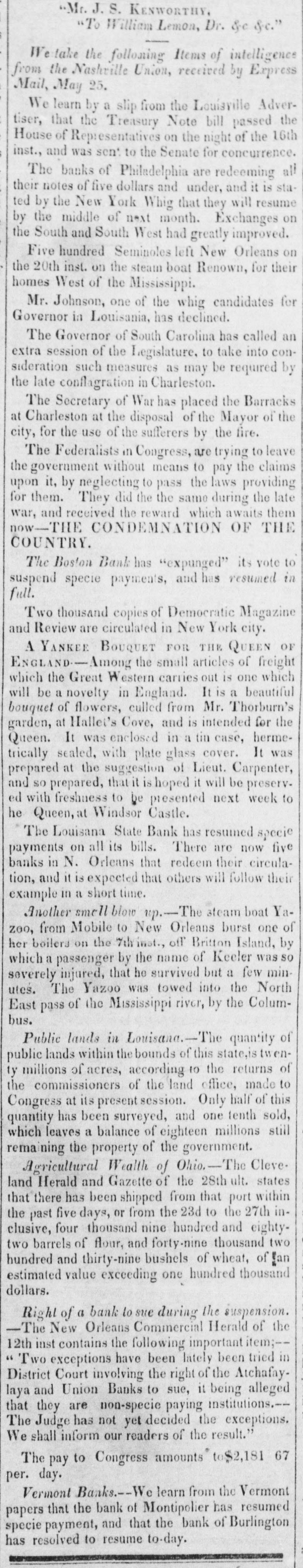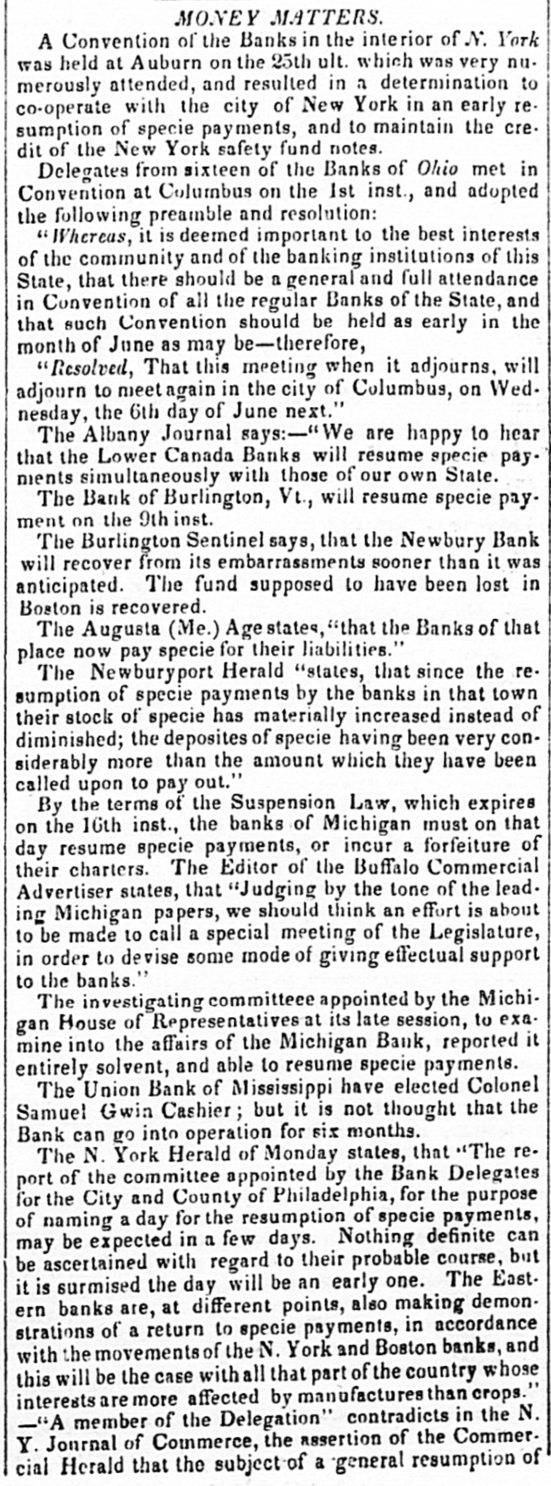 # MONEY MATTERS. A Convention of the Banks in the interior of N. York was held at Auburn on the 25th ult. which was very numerously attended, and resulted in a determination to co-operate with the city of New York in an early resumption of specie payments, and to maintain the credit of the New York safety fund notes. Delegates from sixteen of the Banks of Ohio met in Convention at Columbus on the 1st inst., and adopted the following preamble and resolution: "Whereas, it is deemed important to the best interests of the community and of the banking institutions of this State, that there should be a general and full attendance in Convention of all the regular Banks of the State, and that such Convention should be held as early in the month of June as may be-therefore, "Resolved, That this meeting when it adjourns, will adjourn to meet again in the city of Columbus, on Wednesday, the 6th day of June next." The Albany Journal says:-"We are happy to hear that the Lower Canada Banks will resume specie payments simultaneously with those of our own State. The Bank of Burlington, Vt., will resume specie payment on the 9th inst. The Burlington Sentinel says, that the Newbury Bank will recover from its embarrassments sooner than it was anticipated. The fund supposed to have been lost in Boston is recovered. The Augusta (Me.) Age states, "that the Banks of that place now pay specie for their liabilities." The Newburyport Herald "states, that since the resumption of specie payments by the banks in that town their stock of specie has materially increased instead of diminished; the deposites of specie having been very considerably more than the amount which they have been called upon to pay out." By the terms of the Suspension Law, which expires on the 16th inst., the banks of Michigan must on that day resume specie payments, or incur a forfeiture of their charters. The Editor of the Buffalo Commercial Advertiser states, that "Judging by the tone of the leading Michigan papers, we should think an effort is about to be made to call a special meeting of the Legislature, in order to devise some mode of giving effectual support to the banks." The investigating committeee appointed by the Michigan House of Representatives at its late session, to examine into the affairs of the Michigan Bank, reported it entirely solvent, and able to resume specie payments. The Union Bank of Mississippi have elected Colonel Samuel Gwin Cashier; but it is not thought that the Bank can go into operation for six months. The N. York Herald of Monday states, that "The report of the committee appointed by the Bank Delegates for the City and County of Philadelphia, for the purpose of naming a day for the resumption of specie payments, may be expected in a few days. Nothing definite can be ascertained with regard to their probable course, but it is surmised the day will be an early one. The Eastern banks are, at different points, also making demonstrations of a return to specie payments, in accordance with the movements of the N. York and Boston banks, and this will be the case with all that part of the country whose interests are more affected by manufactures than crops." -"A member of the Delegation" contradicts in the N. Y. Journal of Commerce, the assertion of the Commercial Herald that the subject of a general resumption of