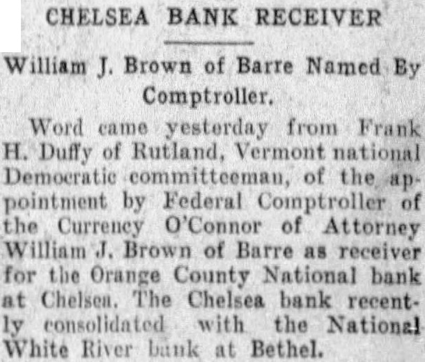 CHELSEA BANK RECEIVER Brown of Barre Named Comptroller. Word yesterday from Frank Rutland, Vermont Democratic of pointment Federal Currency O'Connor Attorney Brown Barre receiver for the Orange County National bank Chelsea bank recentconsolidated National White bank at Bethel.