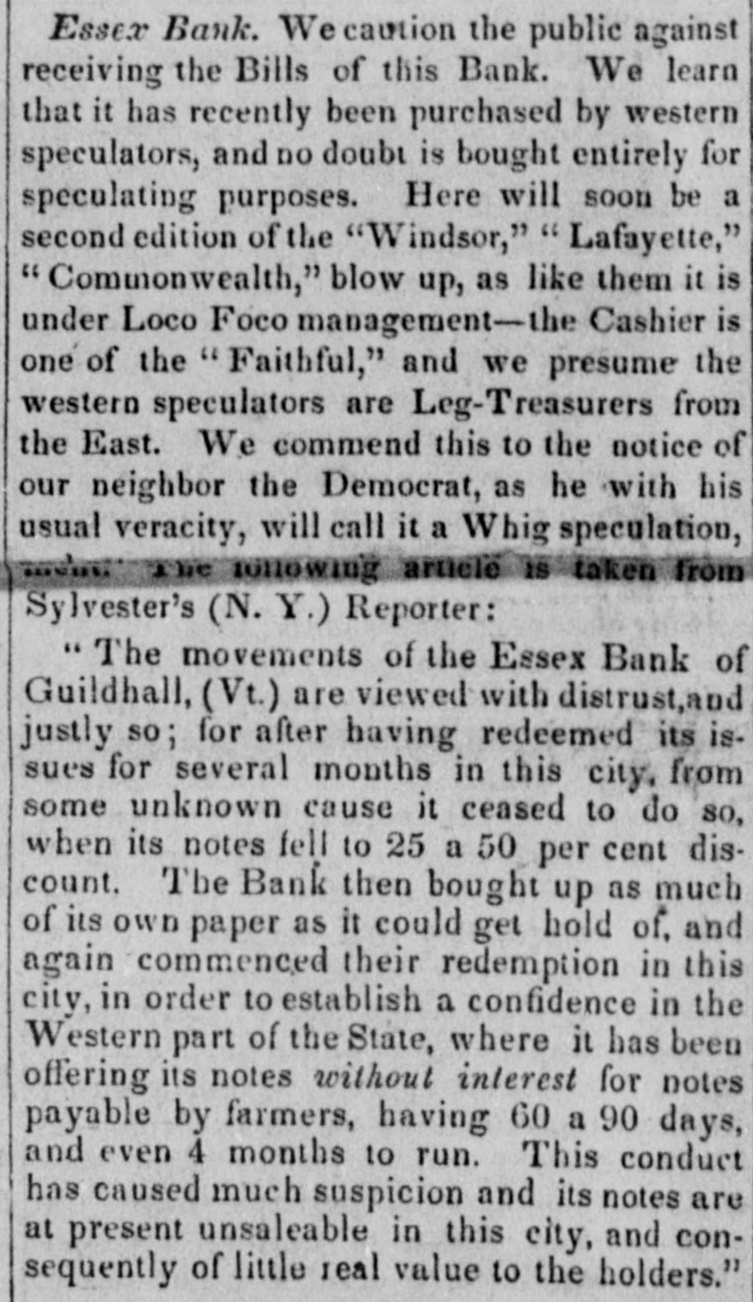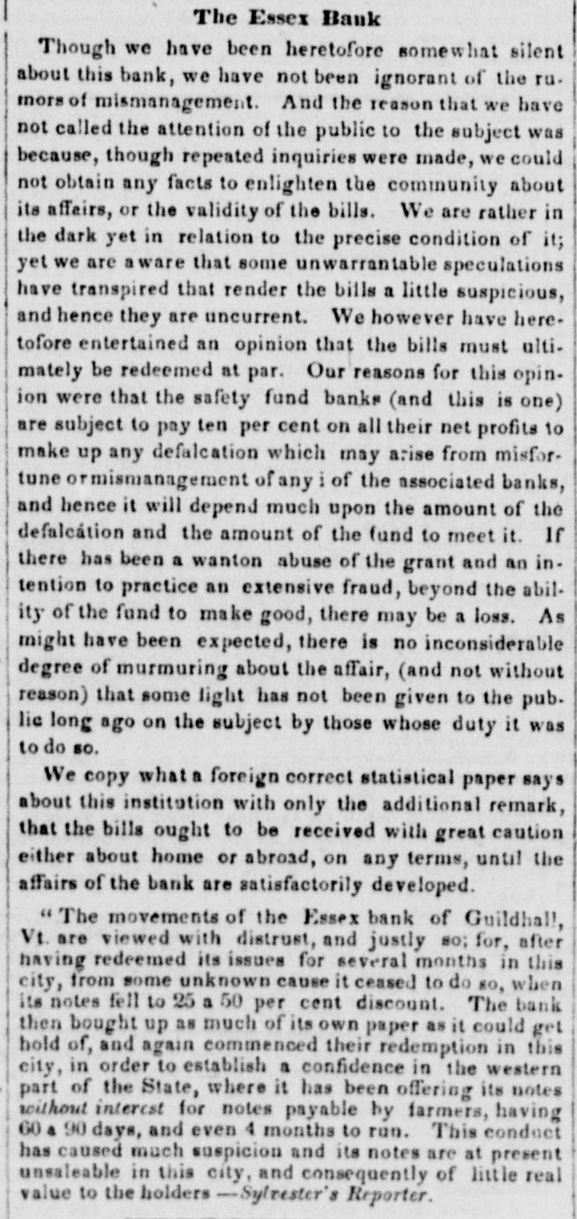 The Essex Bank Though we have been heretofore somewhat silent about this bank, we have not been ignorant of the ru. mors of mismanagement. And the reason that we have not called the attention of the public to the subject was because, though repeated inquiries were made, we could not obtain any facts to enlighten the community about its affairs, or the validity of the bills. We are rather in the dark yet in relation to the precise condition of it; yet we are aware that some unwarrantable speculations have transpired that render the bills a little suspicious, and hence they are uncurrent. We however have heretofore entertained an opinion that the bills must ultimately be redeemed at par. Our reasons for this opin. ion were that the safety fund banks (and this is one) are subject to pay ten per cent on all their net profits to make up any defalcation which may arise from misfortune ormismanagement of any i of the associated banks, and hence it will depend much upon the amount of the defalcation and the amount of the fund to meet it. If there has been a wanton abuse of the grant and an intention to practice an extensive fraud, beyond the ability of the fund to make good, there may be a loss. As might have been expected, there is no inconsiderable degree of murmuring about the affair, (and not without reason) that some light has not been given to the pub. lie long ago on the subject by those whose duty it was to do so. We copy what a foreign correct statistical paper says about this institution with only the additional remark, that the bills ought to be received with great caution either about home or abroad, on any terms, until the affairs of the bank are satisfactorily developed. " The movements of the Essex bank of Guildhall, Vt. are viewed with distrust, and justly so; for, after having redeemed its issues for several months in this city, from some unknown cause it ceased to do so, when its notes fell to 25 a 50 per cent discount. The bank then bought up as much of its own paper as it could get hold of, and again commenced their redemption in this city, in order to establish a confidence in the western part of the State, where it has been offering its notes without interest for notes payable by farmers, having 60 a 90 days, and even 4 months to run. This conduct has caused much suspicion and its notes are at present unsaleable in this city, and consequently of little real value to the holders -Sylvester's Reporter.