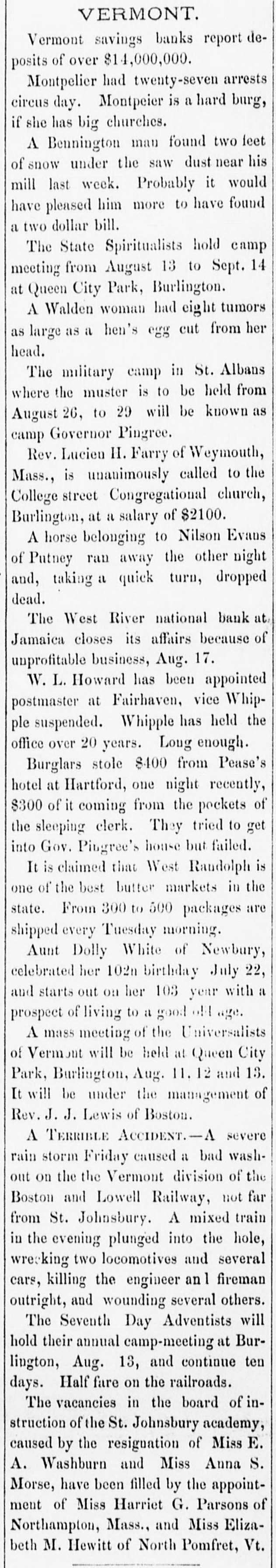 VERMONT. Vermont savings banks report deposits of over $14,000,000. Montpelier had twenty-seven arrests circus day. Montpeier is a hard burg, if she has big churches. A Bennington man found two feet of snow under the saw dust near his mill last week. Probably it would have pleased him more to have found a two dollar bill. The State Spiritualists hold camp meeting from August 13 to Sept. 14 at Queen City Park, Burlington. A Walden woman had eight tumors as large as a hen's egg cut from her head. The military camp in St. Albans where the muster is to be held from August 26, to 29 will be known as camp Governor Pingree. Rev. Lucien H. Farry of Weymouth, Mass., is unanimously called to the College street Congregational church, Burlington, at a salary of $2100. A horse belonging to Nilson Evans of Putney ran away the other night and, taking a quick turn, dropped dead. The West River national bank at. Jamaica closes its affairs because of unprofitable business, Aug. 17. W. L. Howard has been appointed postmaster at Fairhaven, vice Whipple suspended. Whipple has held the office over 20 years. Long enough. Burglars stole $400 from Pease's hotel at Hartford, one night recently, $300 of it coming from the pockets of the sleeping clerk. They tried to get into Gov. Pingree's house but failed. It is claimed that West Randolph is one of the best butter markets in the state. From 300 to 500 packages are shipped every Tuesday morning. Aunt Dolly White of Newbury, celebrated her 102n birthday July 22, and starts out on her 103 year with a prospect of living to a good old age. A mass meeting of the Universalists of Vermont will be held at Queen City Park, Burlington, Aug. 11. 12 and 13. It will be under the management of Rev. J. J. Lewis of Boston. A TERRIBLE ACCIDENT. severe rain storm Friday caused a bad washout on the the Vermont division of the Boston and Lowell Railway, not far from St. Johnsbury. A mixed train in the evening plunged into the hole, wrecking two locomotives and several cars, killing the engineer an 1 fireman outright, and wounding several others. The Seventh Day Adventists will hold their annual camp-meeting at Burlington, Aug. 13, and continue ten days. Half fare on the railroads. The vacancies in the board of instruction of the St. Johnsbury academy, caused by the resignation of Miss E. A. Washburn and Miss Anna S. Morse, have been filled by the appointment of Miss Harriet G. Parsons of Northampton, Mass., and Miss Elizabeth M. Hewitt of North Pomfret, Vt.