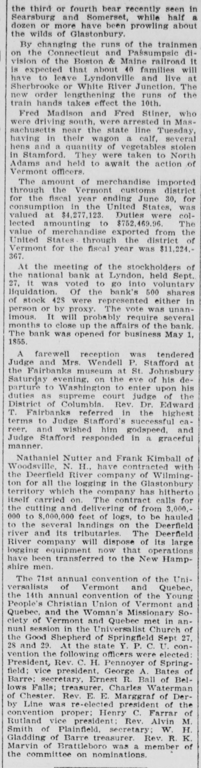 the third or fourth bear recently seen in Searsburg and Somerset, while half a dozen or more have been prowling about the wilds of Glastonbury. By changing the runs of the trainmen on the Connecticut and Passumpsic division of the Boston & Maine railroad it is expected that about 40 families will have to leave Lyndonville and live at Sherbrooke or White River Junction. The new order lengthening the runs of the train hands takes effect the 10th. Fred Madison and Fred Stiner, who were driving south, were arrested in Massachusetts near the state line Tuesday, having in their wagon a calf, several hens and a quantity of vegetables stolen in Stamford. They were taken to North Adams and held to await the action of Vermont officers. The amount of merchandise imported through the Vermont customs district for the fiscal year ending June 30, for consumption in the United States, was valued at $4,277,123. Duties were collected amounting to $752,469.96. The value of merchandise exported from the United States. through the district of Vermont for the fiscal year was $11,224,367. At the meeting of the stockholders of the national bank at Lyndon, held Sept. 27, it was voted to go into voluntary liquidation. Of the bank's 500 shares of stock 428 were represented either in person or by proxy. The vote was unanimous. It will probably require several months to close up the affairs of the bank. The bank was opened for business May 1, 1855. A farewell reception was tendered Judge and Mrs. Wendell P. Stafford at the Fairbanks museum at St. Johnsbury Saturday evening, on the eve of his departure to Washington to enter upon his duties as supreme court judge of the District of Columbia. Rev. Dr. Edward T. Fairbanks referred in the highest terms to Judge Stafford's successful career. and wished him godspeed, and Judge Stafford responded in a graceful manner. Nathaniel Nutter and Frank Kimball of Woodsville, N. H., have contracted with the Deerfield River company of Wilmington for all the logging in the Glastonbury territory which the company has hitherto itself carried on. The contract calls for the cutting and delivering of from 3,000,000 to 8,000,000 feet of logs, to be hauled to the several landings on the Deerfield river and its tributaries. The Deerfield River company will dispose of its large logging equipment now that operations have been transferred to the New Hampshire men. The 71st annual convention of the Universalists of Vermont and Quebec, the 14th annual convention of the Young People's Christian Union of Vermont and Quebec, and the Woman's Missionary Society of Vermont and Quebec met in annual session in the Universalist Church of the Good Shepherd of Springfield Sept 27, 28 and 29. At the state Y. P. C. U. convention the following officers were elected: President, Rev. C. H. Pennoyer of Springfield; vice president. George A. Bates of Barre: secretary, Ernest R. Ball of Bellows Falls; treasurer, Charles Waterman of Chester. Rev. E. E. Marggraf of Derby Line was re-elected president of the convention proper: Henry C. Farrar of Rutland vice president: Rev. Alvin M. Smith of Plainfield, secretary; W. H. Gladding of Barre treasurer. Rev. R. K. Marvin of Brattleboro was a member of the committee on nominations.