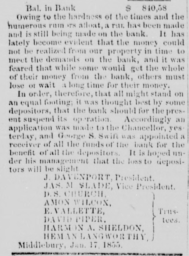 Bal. in Bank $ 840,58 Owing to the hardness of the times and the humerous rum T'S afloat, a run has been made and is still being made on the bank. It has lately become evident that the money could not be realized from our property in time to meet the demands on the bank, and it was feared that while some would get the whole of their money from the bank, others must lose or wait a long time for their money. In order, therefore, that all might stand on an equal footing; it was thought best by some depositors, that the bank should for the present suspend its operation. Accordingly an application was made to the Chancellor, yes. terday, and George S. Swift was appointed a receiver of all the funds of the bank for the benefit of all the depositors. It is hoped nnder his management that the loss to depositors will be slight J. DAVENPORT, President. JAS. M SLADE, Vice President. D.S. CHURCH, AMON WILCOX, TrusE. VALLETTE, tees. DAVID PIPER. HARMON A. SHELDON, HEMANLANGWORTHY, Middlebury, Jan. 17, 1855.