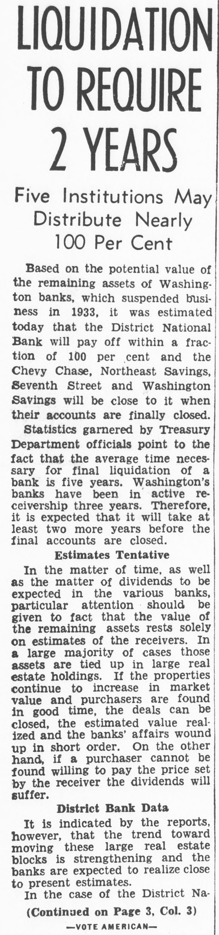 ings on the Flecher Rayburn bill and kept his local manager, A. Harmer Reeside, on the jump showing him around. Like all brokers we've talked to. Mr Westheimer thinks the Hare Fletcher Ray- Dunbar burn bill must be modified or else the stock market business will go to the "bow-wows." He says: "All American progress is due to the fact that people have speculated." He cites some very conclusive reasons for his statement-building of the railroads, promotion of aviation, advance of telegraphic and telephone communication, and the like. Says Mr. Westheimer, and he's right, too: "Where would America be if the weren't a we have today speculative any empire mood? people stretching Would in across the country, or still be a small English colony?" He thinks the average Amerigamble, can citizen take the wants big chance. to plunge, Is he right? And while on the subject of the Westheimer firm. it might be stated that Miss Bessie Shoor, is popular customer's woman, around and about again. She recently was operated on for appendicitis We're beginning to get fan mail. People are writing in to ask about the condition of certain stock. though, we aren't posing and do the brokers' usurp Sorry, as experts business. not wish So, in- to if you write us for that kind of formation and we don't answer, please appreciate our position. Now that the Potomac Savings Bank has physically moved into the District National Bank Building things are really buzzing there. The Northeast Savings already was there. Norman Hamilton is receiver for five of the closed banks which entered the Hamilton National Bank merger and he hopes to have more company soon. In addition to District and Northeast and Potomac, Mr. Hamilton is receiver for the Washington Savings and Seventh Street Savings. Ferry Heath, of E. H. Harriman & Co., goes to lunch without his coat in this weather. But he wears his hat. Richard Whitney, who's been about here testifying the visited stock a exchange, hasn't even single local brokerage office, it's said. John Caswell, ir., manager of Clark, Childs and Keech, is out of the city. He's in New York. Milton Sherrill, local for Investors in the Barr manager with James offices Syndicate, Building, business that February the reports through Washington cent above office was exactly 100 per that done in January, and with two exceptions, the best month since May, 1933. Mr. Sherrill said: "Our business over the United and Canada and we States rapidly, expect is improving 1934 from to A report office in states that Minn., the be a home good year. the Minneapolis, first six months of this year shows an increase for the company of 21 per cent over the same period in 1933. "Mrs. Rose Morrow led the entire sales force here in production in February. She has been with the syndicate several years and February was one of her best months." Mr. Sherill states that he very optimistic about the immediate future for his business in Washington. "Things are more settled here and the than at any brighter right now future time looks for over a year. In my opinion, business is going to be good in Washington this year."