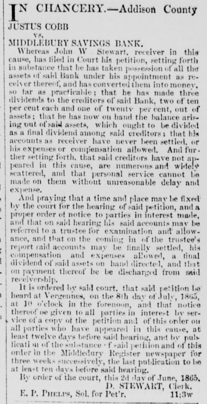 IN N CHANCERY.-Addisot County JUSTUS COBB VS. MIDDLEBURY SAVINGS BANK. Whereas John W Stewart. receiver in this cause, has filed in Court his petition, setting forth in substance that he has taken possession of all the assets of said Bank under his appointment as receiver thereof, and has converted them into money, SO far as practicable; that he has made three dividends to the creditors of said Bank, two of ten per cent each and one of twenty per cent, out of assets; that he has now on band the balance aris, ing out of said assets, which ought to be divided as a final dividend atrong said creditors; that his accounts as receiver have never been settled. or his expenses or compensation allowed. And fur. ther setting forth, that said creditors have not appeared in this cause, are numerous and widely scattered, and that personal service cannot be made on them without unreasonable delay and expense. And praying that a time and place may be fixed by the court for the hearing of said petition, and a proper order of notice to parties in interest made, and that on said hearing his said accounts may be referred to a trustee for examination and allowance, and that on the coming in of the trustee's report said accounts may be finally settled, his compensation and expenses allowed, a final dividend of said assets on band directed, and that on payment thereof he be discharged from said receivership. It is ordered by said court, that said petition be heard at Vergennes, on the 8th day of July, 1865, at 10 o'clock in the forenoon, and that notice thereof be given to all parties in interest by service of a copy of the petition and of this order on all parties who have appeared in this cause, at least twelve days before said hearing, and by publication of the substance of said petition and of this order in the Middledury Register newspaper for three weeks successively, the last publication to be at least ten davs before said hearing. By order of the court, this 2d dav of June, 1865. D. STEWART, Clerk. E. P. PHELPS, Sol. for Pet'r.