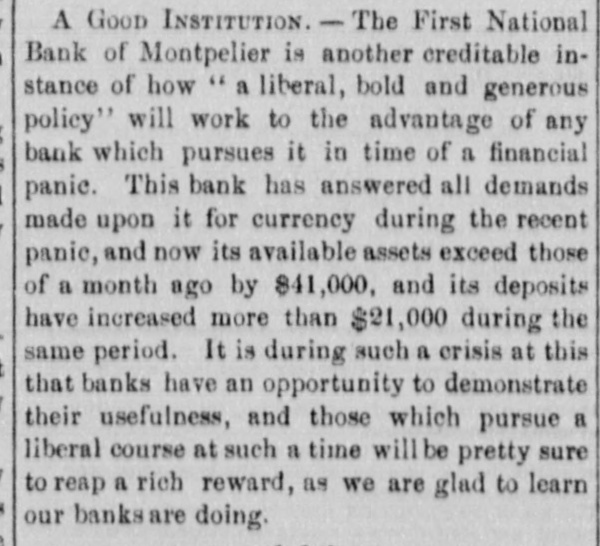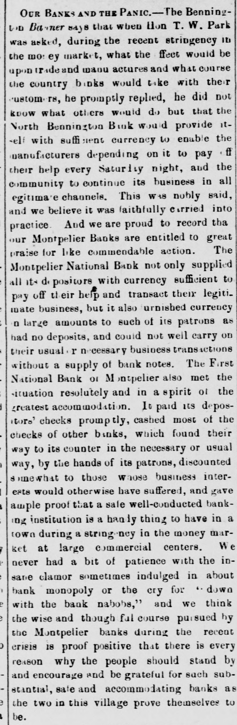 OUR BANKS AND THE PANIC.-The - Benningtoo Banner says that when lion T. W. Park was asked, during the recent stringency ID the mo:ey market, what the ffect would be upontrade and maou actures and what course the country banks would take with their customers, he promptly replied, he did not know what others would do but that the North Bennington Bink would provide it-elf with sufficient currency to enable the manufacturers depending on it to pay ff their help every Saturity night, and the community to continue its business in all egitimare channels. This WHS nobly said, and we believe it was faithfully carried into practice And we are proud to record tha our Montpelier Banks are entitled to great praise for like commendable action. The Montpelier National Bank not only supplied all its depositore with currency sufficient to pay off their help and transact their legitimate business, but it also furnished currency n large amounts to such of its patrons as had no deposits, and could not well carry on their usual r necessary business transactions without a supply of bank notes. The First National Bank or Montpelier also met the situation resolutely and in a spirit of the greatest accommodation. It paid its depostors' checks promptly, cashed most of the checks of other banks, which found their way to its counter in the necessary or usual way, by the hands of its patrons, discounted somewhat to those whose business interests would otherwise have suffered, and gave ample proof that a sale well-conducted bankng institution is a handy thing to have in a town during a string ney in the money market at large commercial centers. We never had a bit of patience with the insame clamor sometimes indulged in about bank monopoly or the cry for ". down with the bank nabobs," and we think the wise and though ful course pursued by the Montpelier banks during the recent crieis is proof positive that there is every reason why the people should stand by and encourage and be grateful for such substantial, safe and accommodating banks as e the two in this village prove themselves to be.