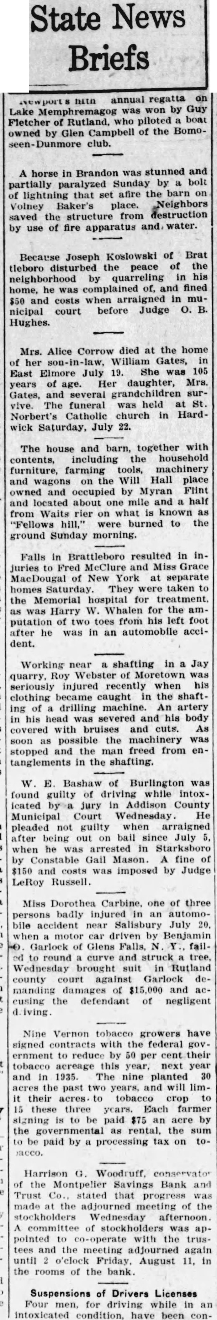 State News Briefs Newport hith annual regatta on Lake Memphremagog was won by Guy Fletcher of Rutland, who piloted boat owned by Glen Campbell of the Bomoseen-Dunmore club. A horse in Brandon was stunned and partially paralyzed Sunday by a bolt of lightning that set afire the barn on Volney Baker's place. Neighbors saved the structure from destruction by use of fire apparatus and water. Because Joseph Koslowski of Brat tleboro disturbed the peace of the neighborhood by quarreling in his home, he was complained of, and fined $50 and costs when in municipal court before Judge O. B. Hughes. Mrs. Alice Corrow died at the home of her son-in-law, William Gates, in East Elmore July 19. She was 105 years of age. Her daughter, Mrs. Gates, and several grandchildren survive. The funeral was held at St. Norbert's Catholic church in Hardwick Saturday, July 22. The house and barn, together with contents, including the household furniture, farming tools, machinery and wagons on the Will Hall place owned and occupied by Myran Flint and located about one mile and a half from Waits rier on what is known as "Fellows hill," were burned to the ground Sunday morning. Falls in Brattleboro resulted in injuries to Fred McClure and Miss Grace MacDougal of New York at separate homes Saturday. They were taken to the Memorial hospital for treatment. as was Harry W. Whalen for the amputation of two toes from his left foot after he was in an automobile accident. Working near a shafting in a Jay quarry, Roy Webster of Moretown was seriously injured recently when his clothing became caught in the shafting of drilling machine. An artery in his head severed and his body with bruises and cuts. As soon as possible the machinery was stopped and the man freed from entanglements in the shafting. W. E Bashaw of Burlington was found guilty of driving while intoxlicated by a jury in Addison County Municipal Court Wednesday He pleaded not guilty when arraigned after being out on bail since July 5, when he was arrested in Starksboro by Constable Gail Mason. A fine of $150 and costs was imposed by Judge LeRoy Russell. Miss Dorothea Carbine, one of three badly injured in an automobile accident near Salisbury July 20, when motor car driven by Benjamin -0. Garlock of Glens Falls, N Y., failed to round curve and struck tree, Wednesday brought suit in Rutland county court against Garlock demanding damages of $15,000 and accusing the defendant of negligent Nine Vernon tobacco growers have signed contracts with the federal government to reduce by 50 per cent their tobacco acreage this year, next year and in 1935. The nine planted 30 acres the past two years, and will limit their acres to tobacco crop to 15 these three years. Each farmer signing is to be paid $75 an acre by the as rental, the sum to be paid by a processing tax on toacco. Harrison G. Woodruff. conservator of the Montpeller Savings Bank and Trust Co., stated that progress was made at the adjourned meeting of the stockholders Wednesday afternoon. A committee of stockholders was appointed to co-operate with the trustees and the meeting adjourned again until o'clock Friday, August 11, in the rooms of the bank. Suspensions of Drivers Licenses Four men, for driving while in an intoxicated condition, have been con-