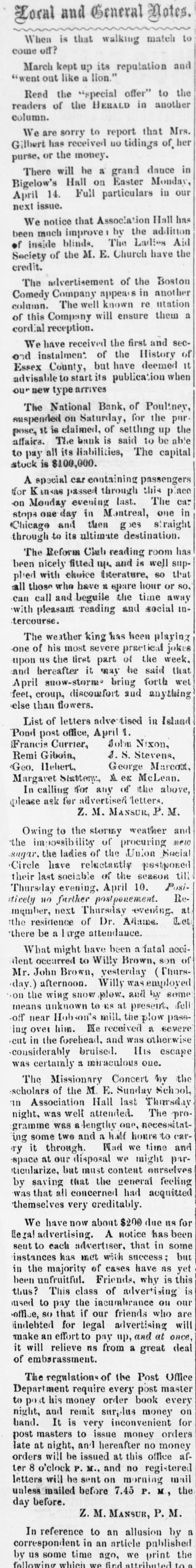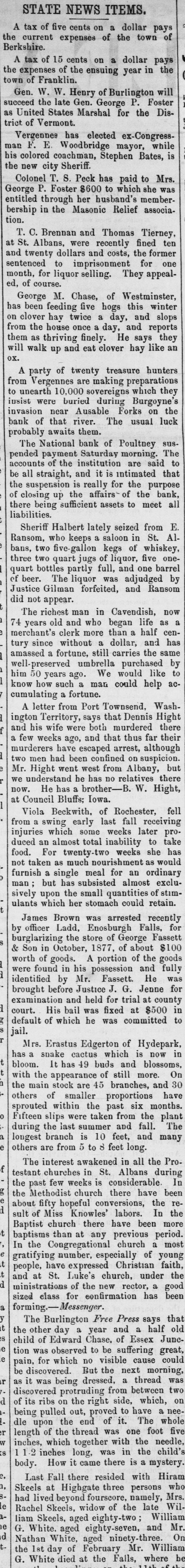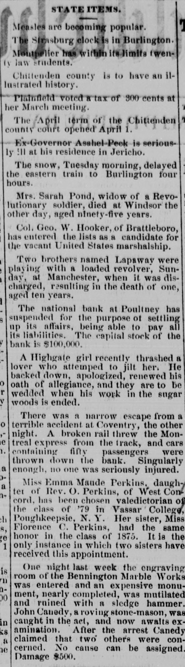 POSTMASTER TAYLOR of Proctorsville says that forty-six years ago, May 16th, 1834, he and a companion rode in a sleigh on twelve inches depth of snow, from West Rutland to East Rutland and back again.