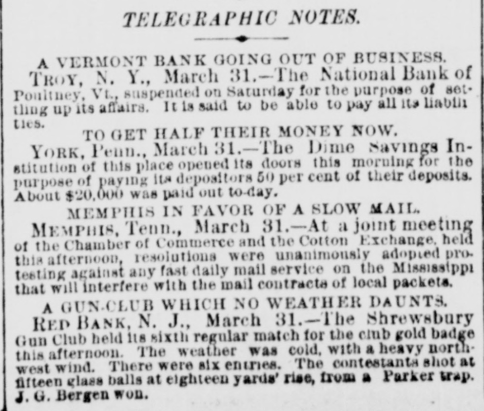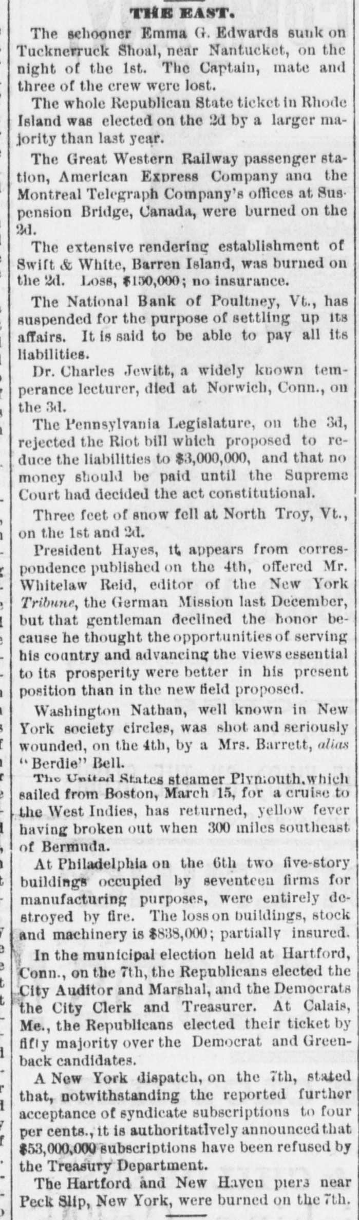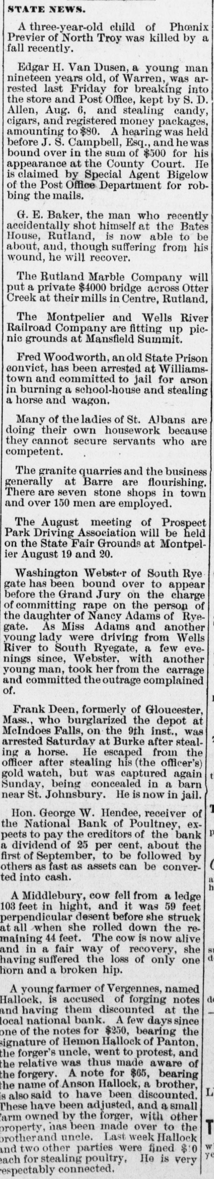 POSTMASTER TAYLOR of Proctorsville says that forty-six years ago, May 16th, 1834, he and a companion rode in a sleigh on twelve inches depth of snow, from West Rutland to East Rutland and back again.
