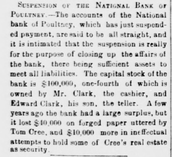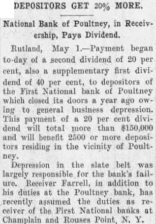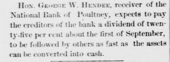 HON. GEORGE W. HENDEE, the receiver of the National Bank of Poultney, will pay the creditors a dividend of twenty per cent.