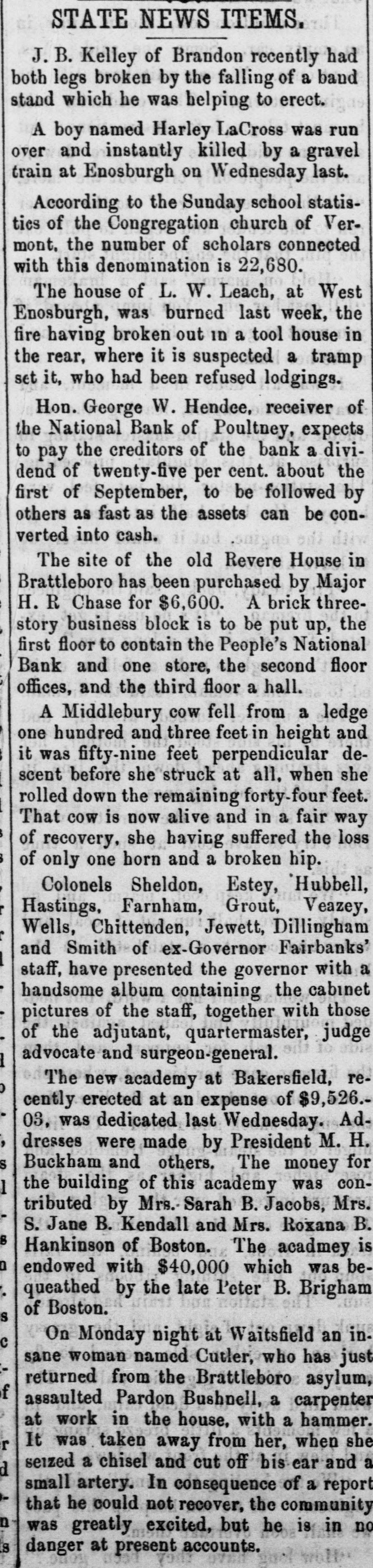 CABOT. Addison Laird, E. H. Clark and Charles T. Adams have each begun work on new barns. They are to be of large dimensions, built by experienced workmen, with all the modern improvements..... Mrs. A. H. Gerry has just returned from market with a large stock of millinery goods Ladies will have ne trouble in obtaining all the fine fixings they will want..... Mr. S. S. Batchelder started for California last Tuesday with his son, J. W. Batchelder, whose health is very poor By the advice of physicians, his father decided to take this journey with him, hoping by a change of climate he might regain his health. He has the best wishes of this community..... Benjamin Preston has sold his farm at East Cabot to Cassius M. Lamberton..... The promise meeting at the Methodist church Sabbath evening was a success and an excellent spirit was manifested. The social meetings have been well sustained since conference. The congregations during the day services are quite large.....J. M. Goodwin has hired S. S. Batchelder's farm for one year and has removed there..... W. Rives Putnam has commenced work on his new house, building it on the site of the old one, which he has moved off.....J. H. Da
