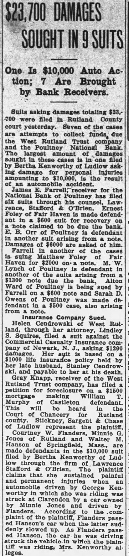 GEORGE TYLER has sued the town of Newbury, claiming $10,000 for damages sustained on the highway last fall, by falling from his load of wood when going down the Westgate hill, whereby he lost one arm and was otherwise injured.