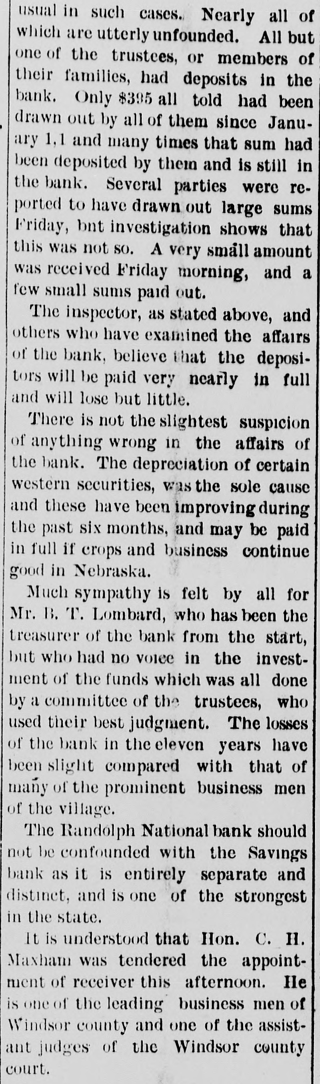 usual in such cases. Nearly all of which are utterly unfounded. All but one of the trustees, or members of their families, had deposits in the bank. Only $395 all told had been drawn out by all of them since January 1,1 and many times that sum had been deposited by them and is still in the bank. Several parties were reported to have drawn out large sums Friday, bnt investigation shows that this was not SO. A very small amount was received Friday morning, and a few small sums paid out. The inspector, as stated above, and others who have examined the affairs of the bank, believe that the depositors will be paid very nearly in full and will lose but little. There is not the slightest suspicion of anything wrong in the affairs of the bank. The depreciation of certain western securities, was the sole cause and these have been improving during the past six months, and may be paid in full if crops and business continue good in Nebraska. Much sympathy is felt by all for Mr. B. T. Lombard, who has been the treasurer of the bank from the start, but who had no voice in the investment of the funds which was all done by a committee of the trustees, who used their best judgment. The losses of the bank in the eleven years have been slight compared with that of many of the prominent business men of the village. The Randolph National bank should not be confounded with the Savings bank as it is entirely separate and distinct, and is one of the strongest in the state. It is understood that Hon. C. H. Maxham was tendered the appointment of receiver this afternoon. He is one of the leading business men of Windsor county and one of the assistant judges of the Windsor county court.