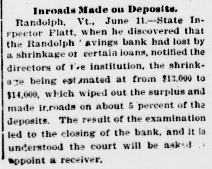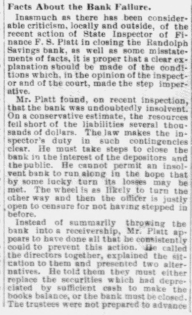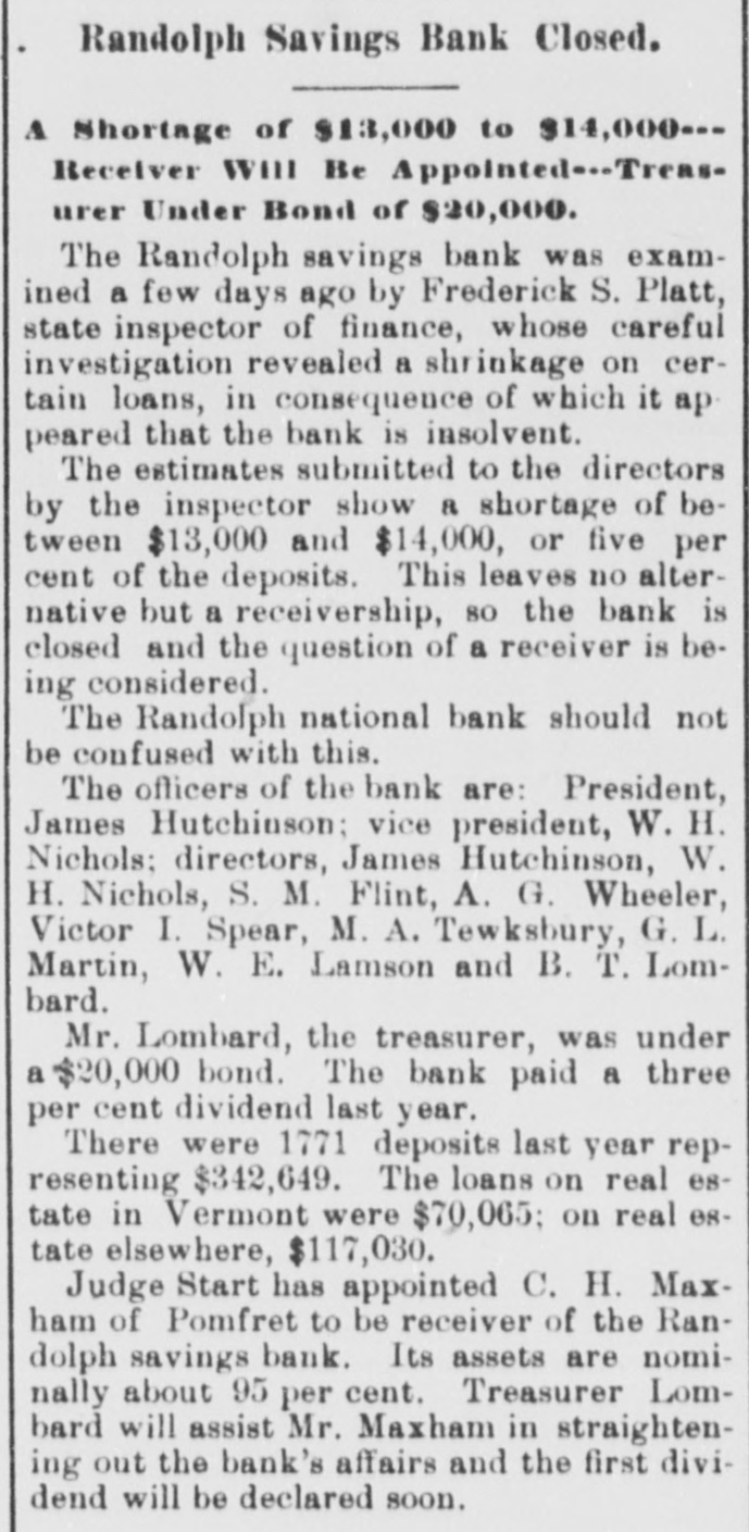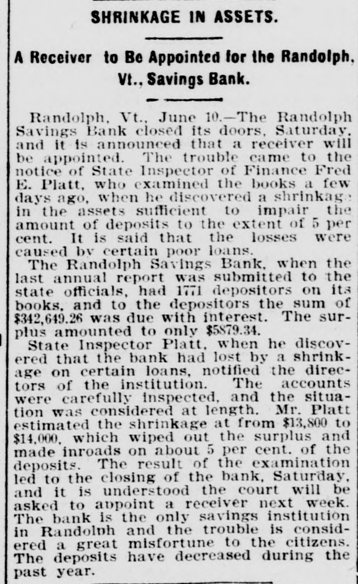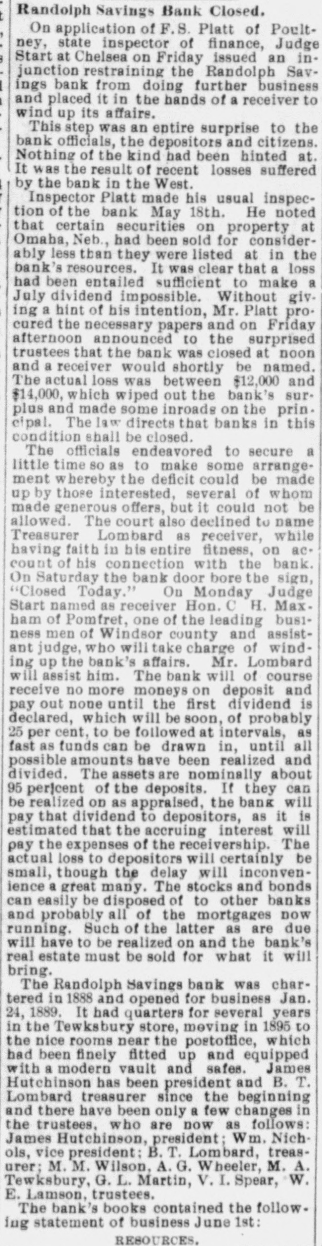 DOORS CLOSED Randolph Savings Bank Enjoined by Judge Start VERY SMALL LOSS Depositors Will Lose but Lit= tle. Will Probably Pay 90 to 95 per cent. (Special to TELEGRAM.) Randolph, June 11.-This town was startled Saturday afternoon to learn that on application made by F. S. Platt, state inspector of finance, the Randolph Savings bank had been enjoined and its doors closed. IIe made the usual annual examination May 18, and said he would come back in a week or ten days and look into some western securities again, but gave none of the trustees to understand that he contemplated closing the bank. He came Friday and made a very careful examination and at noon informed the trustees that he should close the bank, and showed them the papers all prepared to lay before Judge Start at Chelsea. It was a great surprise to the officers of the bank. His estimates submitted to the trustees indicated a shrinkage of between $12,000 and $14,000, or 5 per cent of the deposits, and under the law there is no alternative but to appoint a receiver, consequently the doors of the bank were closed Saturday and the selection of a receiver is being considered. The bank was established January 24. 1889, and has been noted for its safe and conservative investments. Its failure is a shock to the town, a majority of whose families are involved. The officers and trustees are Hon. James Hutchinson, president; Judge William Nichols, vice president: B. T. Lombard, treasurer: M. M. Wilson, A. G. Wheeler, M. A. Tewksbury, G. L. Martin. V. 1. Spear, W. E. Lamson, trustees. The hopefulness of depositors shows confidence in the management, and the general belief seems to be that eventually the depositors will sustain only tritling losses. Had the inspector been willing to withhold the proceedings a few days a guarantee sufficient to more than make up the estimated shrinkage could easily have been raised as many leading business men immediately and voluntarily offered to do this, and there is considerable feeling in the town over his action, which is, to put it mildly characterized as hasty. The last published statement was made June 30, 1899 by the inspector, and hisannual report as follows: