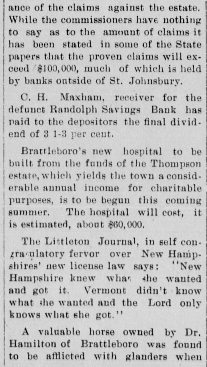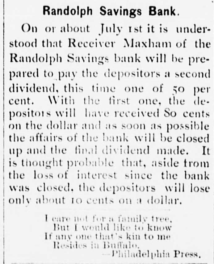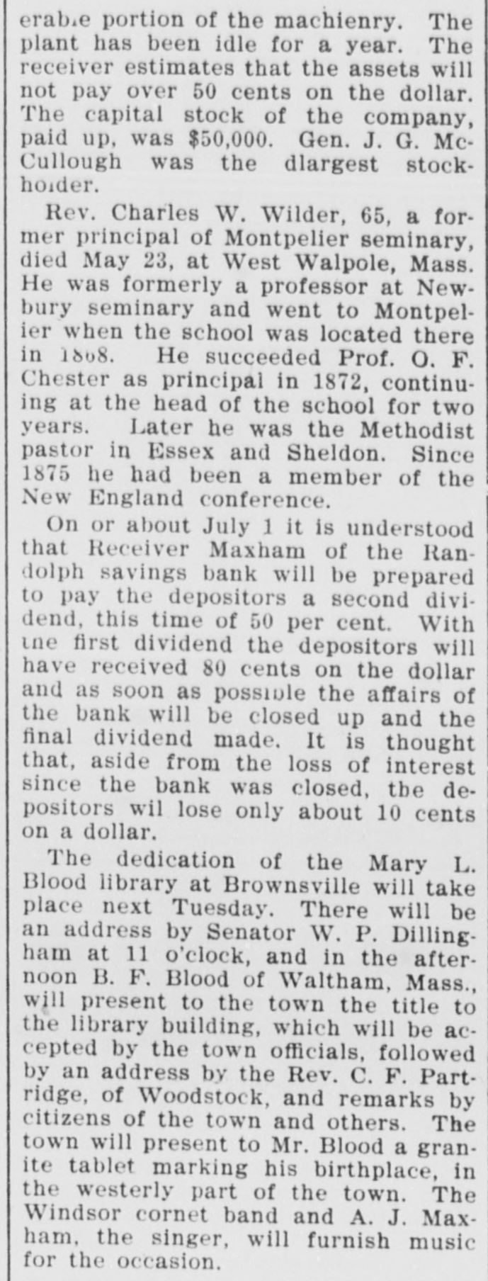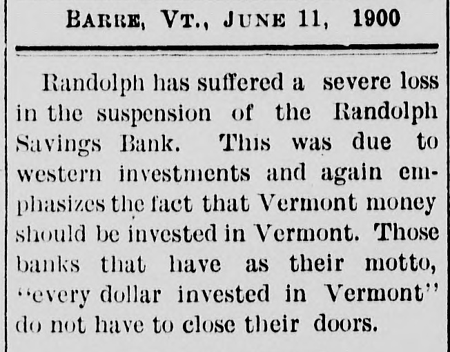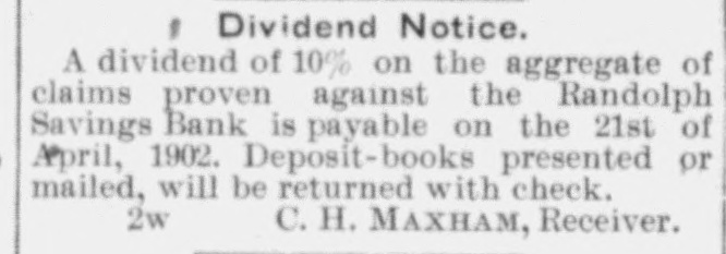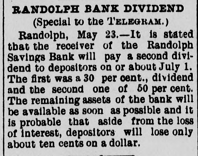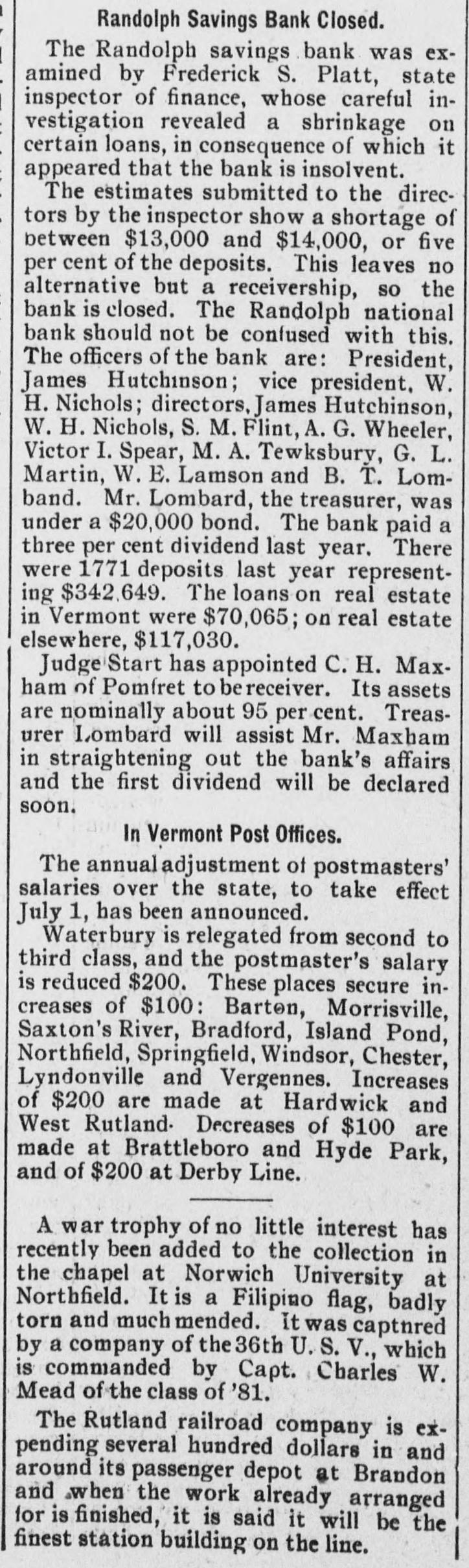 DOORS CLOSED Randolph Savings Bank Enjoined by Judge Start VERY SMALL LOSS Depositors Will Lose but Lit= tle. Will Probably Pay 90 to 95 per cent. (Special to TELEGRAM.) Randolph, June 11.-This town was startled Saturday afternoon to learn that on application made by F. S. Platt, state inspector of finance, the Randolph Savings bank had been enjoined and its doors closed. IIe made the usual annual examination May 18, and said he would come back in a week or ten days and look into some western securities again, but gave none of the trustees to understand that he contemplated closing the bank. He came Friday and made a very careful examination and at noon informed the trustees that he should close the bank, and showed them the papers all prepared to lay before Judge Start at Chelsea. It was a great surprise to the officers of the bank. His estimates submitted to the trustees indicated a shrinkage of between $12,000 and $14,000, or 5 per cent of the deposits, and under the law there is no alternative but to appoint a receiver, consequently the doors of the bank were closed Saturday and the selection of a receiver is being considered. The bank was established January 24. 1889, and has been noted for its safe and conservative investments. Its failure is a shock to the town, a majority of whose families are involved. The officers and trustees are Hon. James Hutchinson, president; Judge William Nichols, vice president: B. T. Lombard, treasurer: M. M. Wilson, A. G. Wheeler, M. A. Tewksbury, G. L. Martin. V. 1. Spear, W. E. Lamson, trustees. The hopefulness of depositors shows confidence in the management, and the general belief seems to be that eventually the depositors will sustain only tritling losses. Had the inspector been willing to withhold the proceedings a few days a guarantee sufficient to more than make up the estimated shrinkage could easily have been raised as many leading business men immediately and voluntarily offered to do this, and there is considerable feeling in the town over his action, which is, to put it mildly characterized as hasty. The last published statement was made June 30, 1899 by the inspector, and hisannual report as follows: