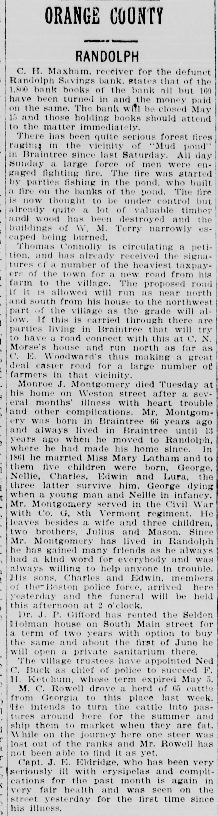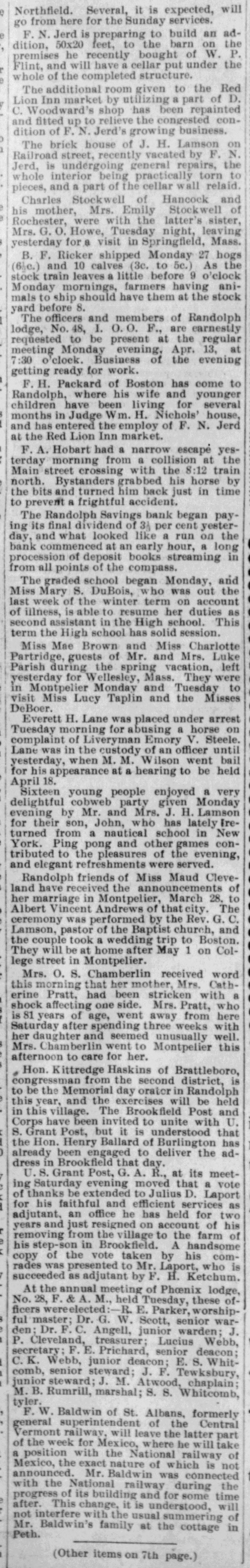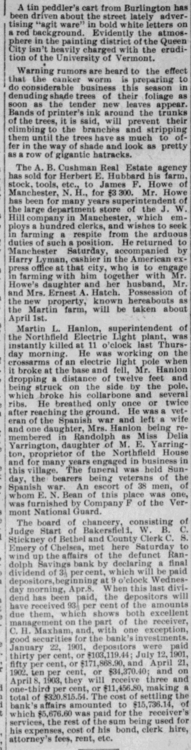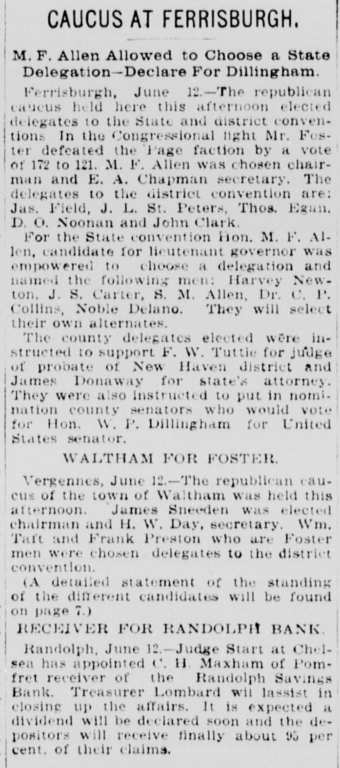 DOORS CLOSED Randolph Savings Bank Enjoined by Judge Start VERY SMALL LOSS Depositors Will Lose but Lit= tle. Will Probably Pay 90 to 95 per cent. (Special to TELEGRAM.) Randolph, June 11.-This town was startled Saturday afternoon to learn that on application made by F. S. Platt, state inspector of finance, the Randolph Savings bank had been enjoined and its doors closed. IIe made the usual annual examination May 18, and said he would come back in a week or ten days and look into some western securities again, but gave none of the trustees to understand that he contemplated closing the bank. He came Friday and made a very careful examination and at noon informed the trustees that he should close the bank, and showed them the papers all prepared to lay before Judge Start at Chelsea. It was a great surprise to the officers of the bank. His estimates submitted to the trustees indicated a shrinkage of between $12,000 and $14,000, or 5 per cent of the deposits, and under the law there is no alternative but to appoint a receiver, consequently the doors of the bank were closed Saturday and the selection of a receiver is being considered. The bank was established January 24. 1889, and has been noted for its safe and conservative investments. Its failure is a shock to the town, a majority of whose families are involved. The officers and trustees are Hon. James Hutchinson, president; Judge William Nichols, vice president: B. T. Lombard, treasurer: M. M. Wilson, A. G. Wheeler, M. A. Tewksbury, G. L. Martin. V. 1. Spear, W. E. Lamson, trustees. The hopefulness of depositors shows confidence in the management, and the general belief seems to be that eventually the depositors will sustain only tritling losses. Had the inspector been willing to withhold the proceedings a few days a guarantee sufficient to more than make up the estimated shrinkage could easily have been raised as many leading business men immediately and voluntarily offered to do this, and there is considerable feeling in the town over his action, which is, to put it mildly characterized as hasty. The last published statement was made June 30, 1899 by the inspector, and hisannual report as follows: