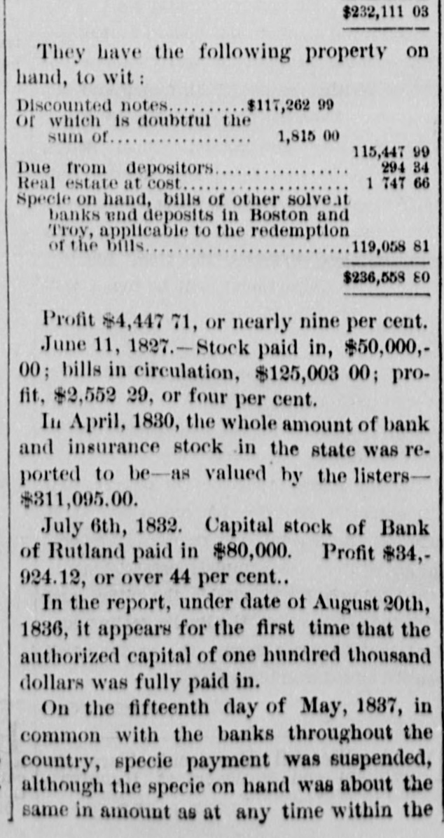 $232,111 03 They have the following property on hand, to wit Discounted notes $117,262 99 or which is doubtful the sum of 1,815 00 115,447 99 294 34 Due from depositors 1 747 66 Real estate at cost Specie on hand, bills of other solve at banks end deposits in Boston and Troy, applicable to the redemption of the bills 119,058 81 $236,558 80 Profit $4,447 71, or nearly nine per cent. June 11, 1827. - Stock paid in, $50,000,00; bills in circulation, $125,003 00; profit, $2,552 29, or four per cent. In April, 1830, the whole amount of bank and insurance stock in the state was reported to be-as valued by the listers$311,095.00. July 6th, 1832. Capital stock of Bank of Rutland paid in $80,000. Profit $34, 924.12, or over 44 per cent.. In the report, under date of August 20th, 1836, it appears for the first time that the authorized capital of one hundred thousand dollars was fully paid in. On the fifteenth day of May, 1837, in common with the banks throughout the country, specie payment was suspended, although the specie on hand was about the same in amount as at any time within the