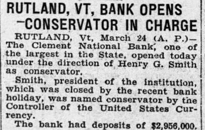VT, BANK OPENS -CONSERVATOR IN CHARGE RUTLAND, Clement National Bank, one the largest the State, today the of Henry G. Smith Smith, president of the institution, holiday, which was closed by the bank by Controller of the United States Currency. The bank had deposits of $2,956,000.