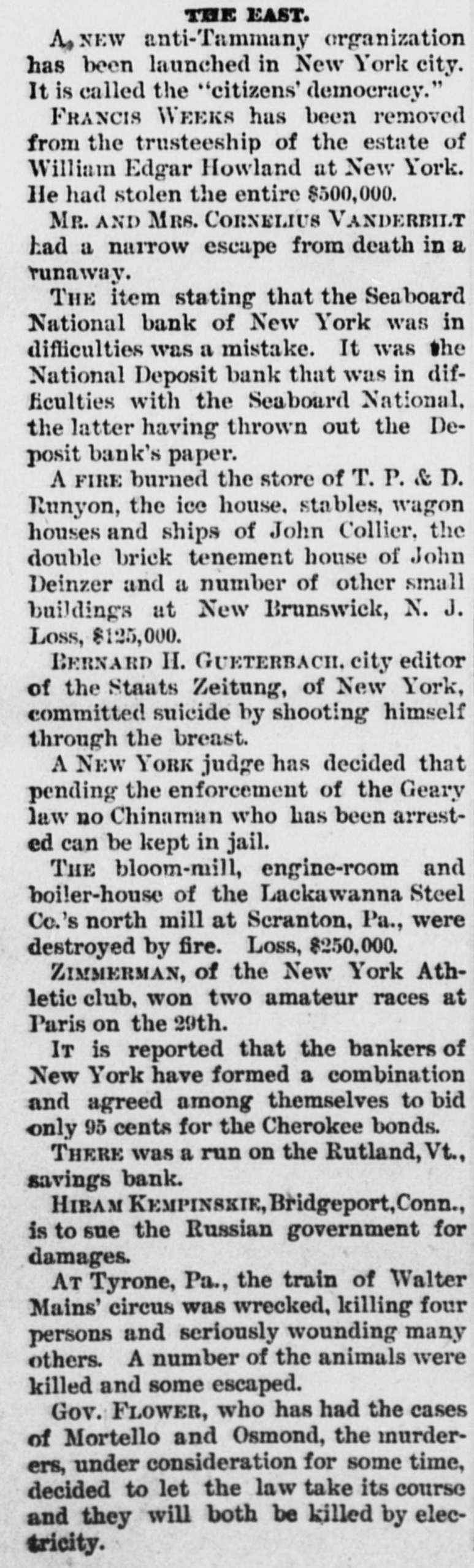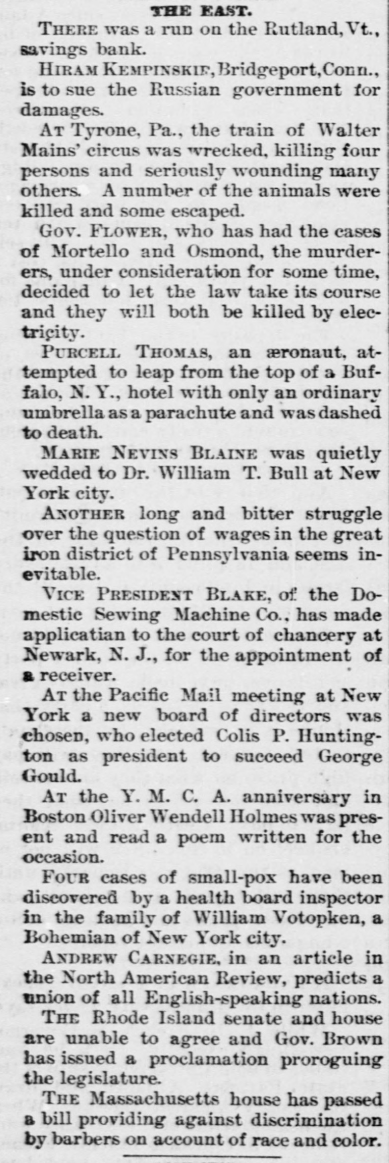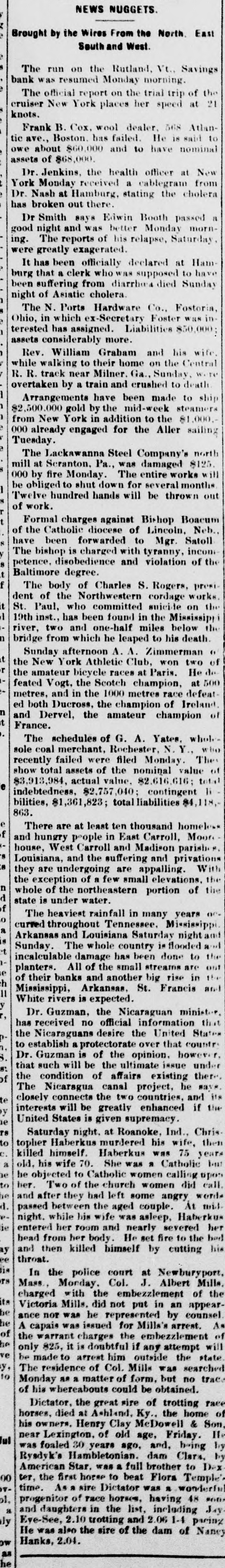 NEWS NUGGETS. Brought by the Wires From the North East South and West. run on the Rutland, Vt. Savings bank The was resumed Monday morning official report on the trial trip of at the 21 cruiser The New York places her speed knots. B. Cox, wool dealer. 568 said Atlan- to Frank Boston. has failed. He 18 nominal owe tic ave., about $60,000 and to have assets of $68,000. New Jenkins, the health officer at from Dr. Monday received a cablegram cholera York Dr. Nash at Hamburg, stating the has broken out there Smith says Edwin Booth passed morn- a Dr and was better Monday Saturday good night The reports of his relapse, ing. were greatly exagerated. been officially declared at to Ham have It has clerk who was supposed Sunday been burg suffering that a from diarrhar died night of Asiatic cholera. N. Ports Hardware Co., Fostoria, was The which ex-Secretary Foster 850,000; Ohio, has assigned. Liabilities terested assets in considerably more. his wife William Grabam and the Central Rev. walking to their home on were while track near Milner. Ga. Sunday I overtaken R. R. by a train and crushed to death Arrangements have been made steamers to ship gold by the mid-week 81,000. $2,500,000 York in addition to the sailing 000 from already New engaged for the Aller Tuesday Lackawanna Steel Company's 8125 north The at Seranton, Pa. was damaged works will I 000 mill by fire to Monday. shut down The for entire several months out of work. be Twelve obliged hundred hands will be thrown charges against Bishop Boacum Neb., Formal Catholic diocese of Lincoln, Satoll of the been forwarded to Mgr. incon have is charged with tyranny of the t petence, The bishop disobedience and violation Baltimore degree. f body of Charles S. Rogers. works presi it dent The of the Northwestern suicide cordage on the I St. Paul, has who been committed found in the Mississipp the n 19th inst., two and one-half miles below death. " river, bridge from which he leaped to his t of afternoon A. A. Zimmerman two Sunday New York Athletic Club, won the bicycle race# at Paris. He de at 500 the feated amateur Vogt, the Scotch champion, race defeat and in the 1000 metres of Ireland n metres, Ducross, the champion of t and ed both Dervel, the amateur champion France. schedules of G. A. Yates. N.Y. whole who The coal merchant, Rochester, The sole failed were filed Monday value recently total assets of the nominal total of e show actual value. 82.616.616; contingent $3,913,984, 82,757,040 $4,118. bilities, indebtedness, $1,361,823; total liabilities e f 863. There are at least ten thousand homeles Moor people in East Carroll, . and hungry West Carroll and Madison privations parish. to house, and the suffering and With Louisiana, undergoing are appalling. elevations. the In they exception are of a few small of the d whole the of the northeastern portion state is under water. f o The heaviest rainfall in many Mississippi years oc a throughout Tennessee. Saturday night a is t The whole country is to 1 curred Arkansas Sunday. and Louisiana done flooded the incalculable damage has been are out e All of the small streams rise in the h planters. banks and another big Francis and II Mississippi, of their Arkansas, St. y White rivers is expected. r, Guzman, the Nicaraguan minister that Dr. no official information States D has received desire the United country n. the Nicaraguans protectorate over that however, S. 8: to establish Guzman a is of the opinion. under Dr. will be the ultimate issue there of that such condition of affairs existing he saye the Nicaragua canal project, and te The connects the two countries, if the its y interests closely will be greatly enhanced e United States is given supremacy rs to night. at Roanoke, Ind., wife, Chris Saturday Haberkus murdered his 75 years then topher himself. Haberkus was a e killed his wife 70. She was a Catholic calling upon but to old. to Catholic women did call be be objected Two of the church women words d. her. after they had left some angry At mil and between the aged couple. Haberkum je passed while his wife was asleep. severed her night. her room and nearly to the bad and entered her body. He set fire his ay ee head then from killed himself by cutting his rs throat. the police court at Newbury port Albert Mills In Monday. Col. J. of the its Mass., with the embezzlement appear be charged Mills. did not put in an counsel he of A charges the ance Victoria capais was nor was issued he represented for Milla's embezzlement by arrent. A of he ve the warrant doubtful if any attempt will only 825, him outside the y, to it arrest is searched state to be made of Col. Mills was trac The residence as a matter of form. obtained. but no of Monday his whereabouts could be the great sire of trotting home race Dictator, died at Ashland. Ky. the & Son. of horses, Henry Clay MeDowell II. ful his owners. Lexington, of old age, Friday. bring by near foaled 30 years ago, and, Clars. by was Hambletonian. dam to Dax Rysdyk's Star. was a full brother 00 horap to beat Flora V ter, the Dictator was a #60 ol. American As s sire first wonderful Temple 48 a time. of race horses, having Juy progenitor in the list, including ly and daughters 2.10 trotting and 2.06 1.4 pacing Nancy ow Eye-See, He was also the sire of the dam of Hanks, 2.04. as he